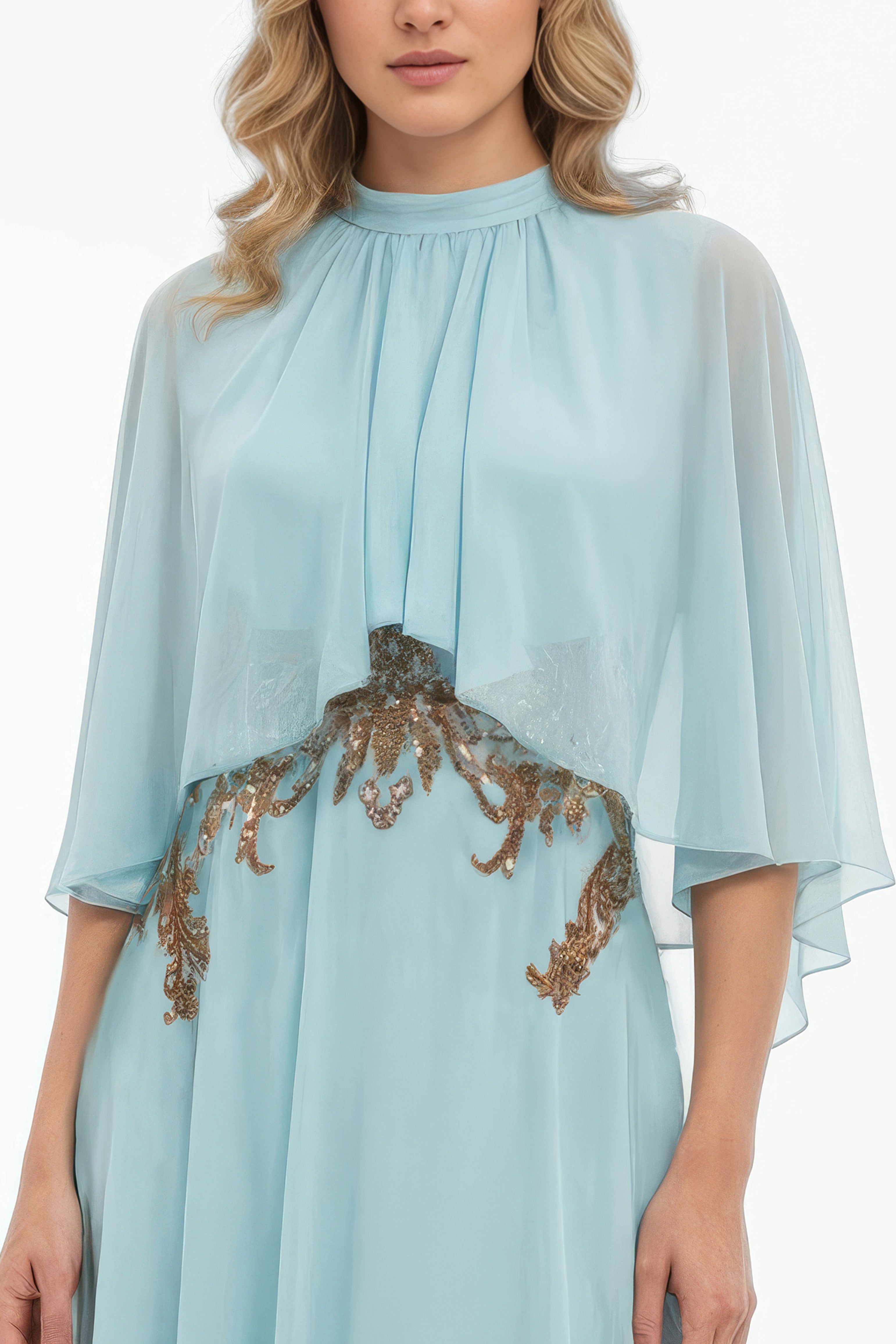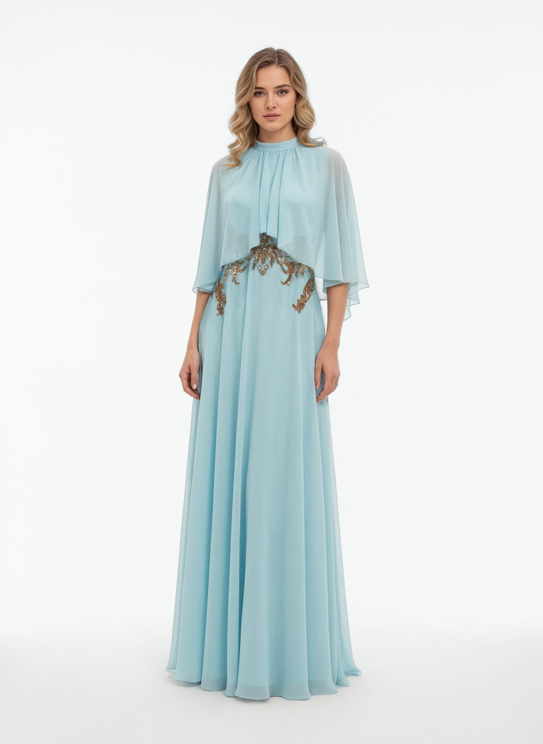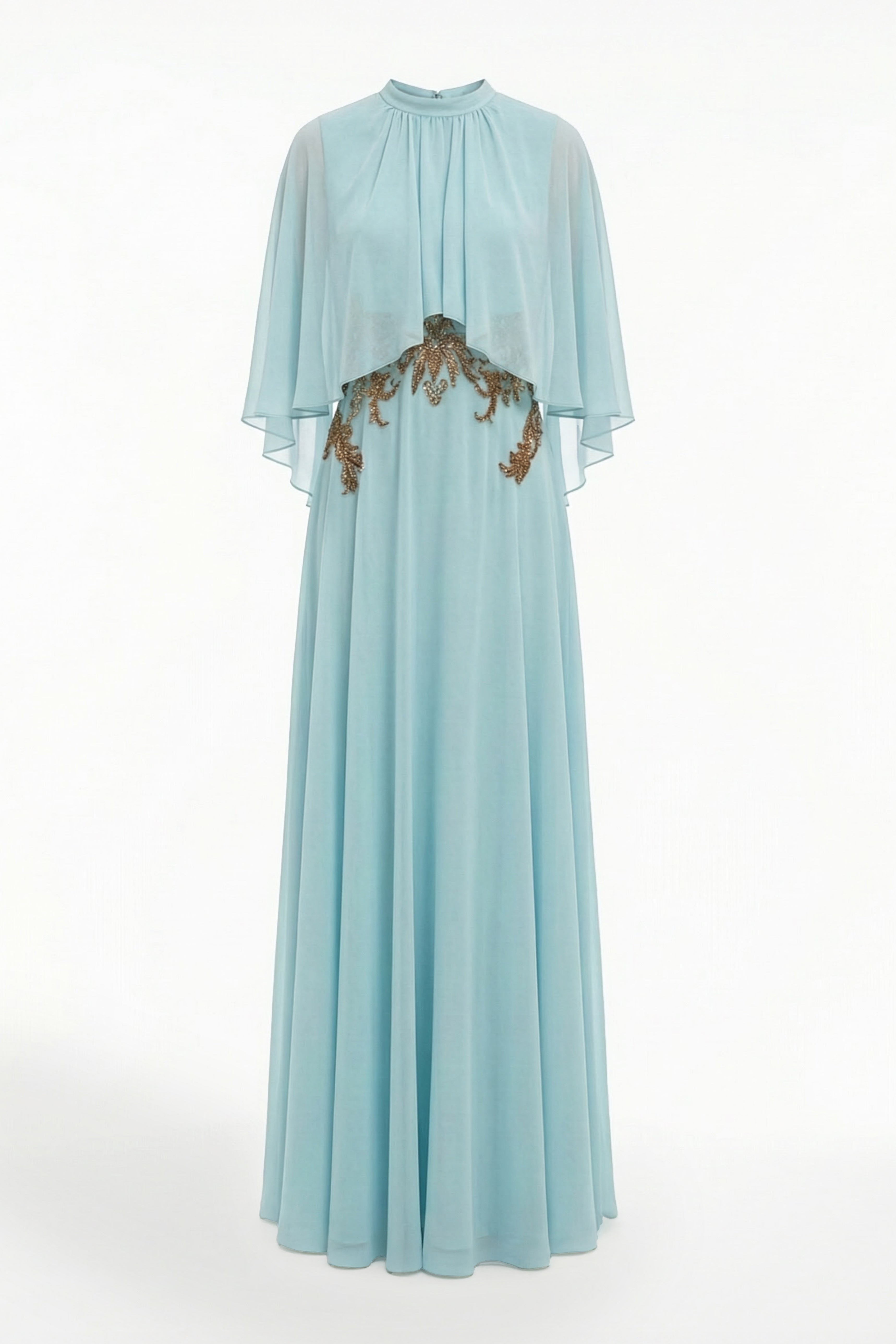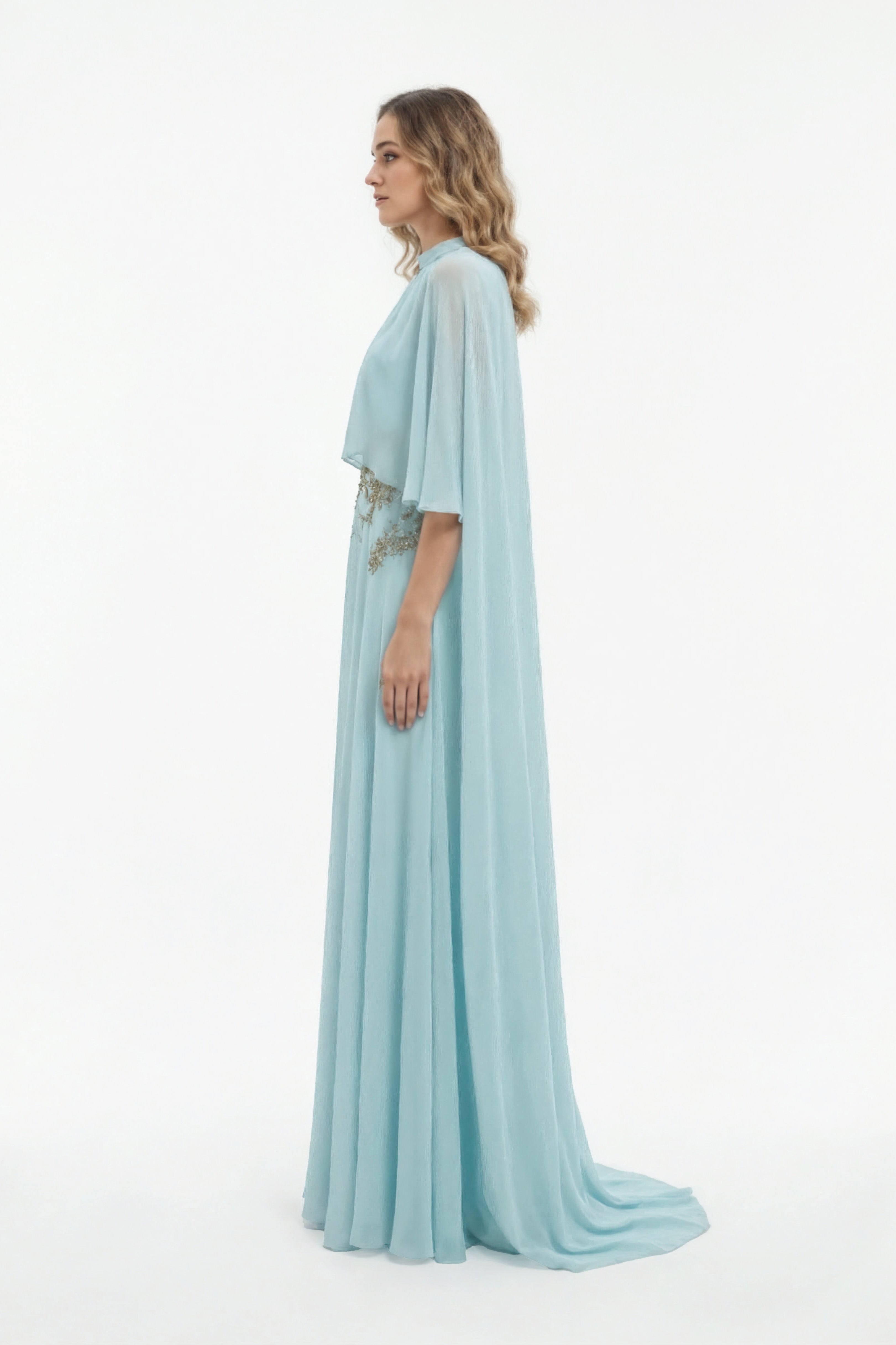 قفطان بلون أزرق فاتح يتميز بياقة عالية، وغطاء رأس متعدد الطبقات، وتنورة طويلة تنساب على الأرض. تم صنع خط الخصر من خيوط ذهبية معدنية وزخارف دقيقة من الخرز تخلق نمطًا دقيقًا يشبه الكرمة حول الخصر، وتشكل أنماطًا مزخرفة تمتد قليلاً إلى الوركين.