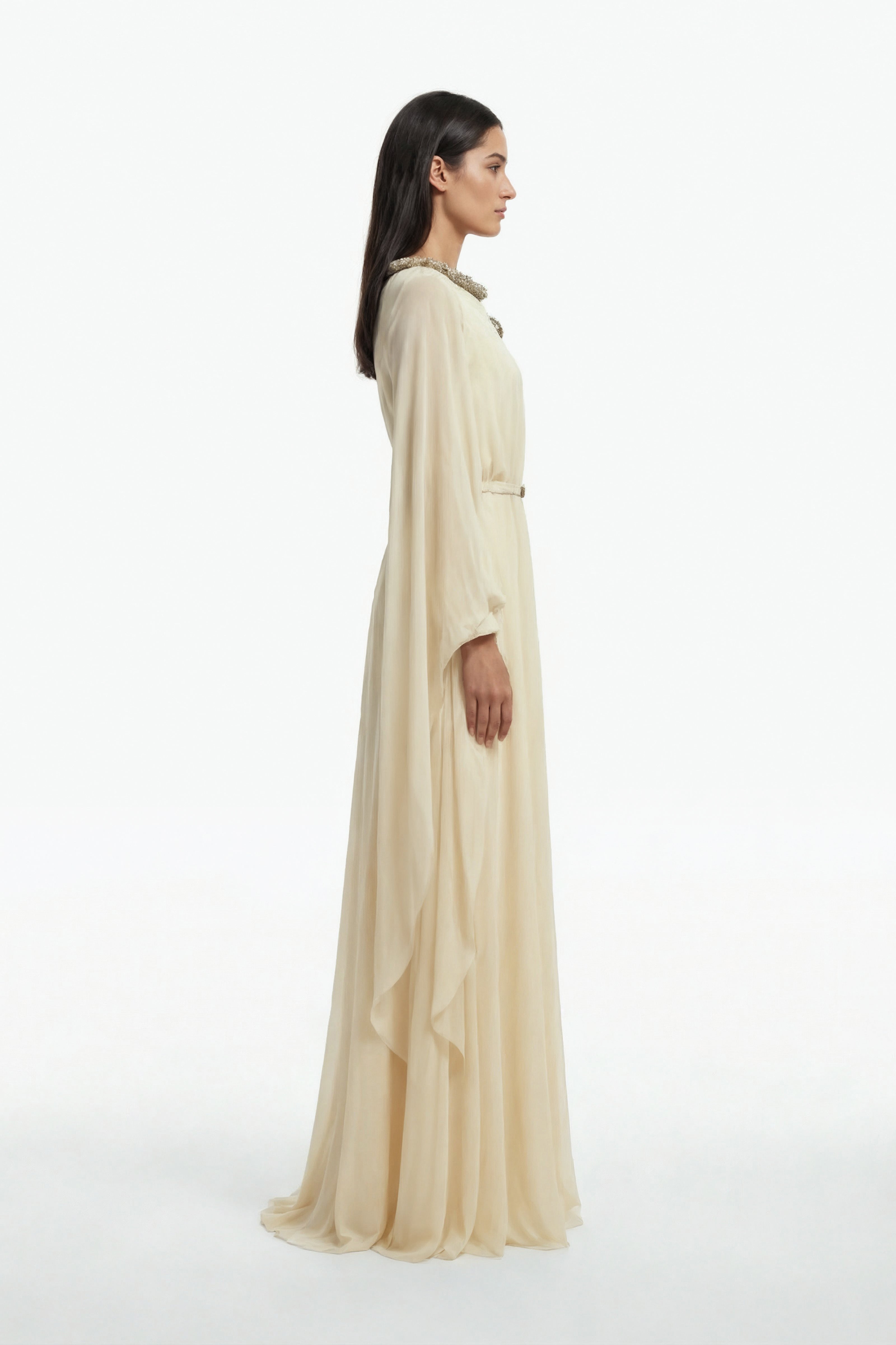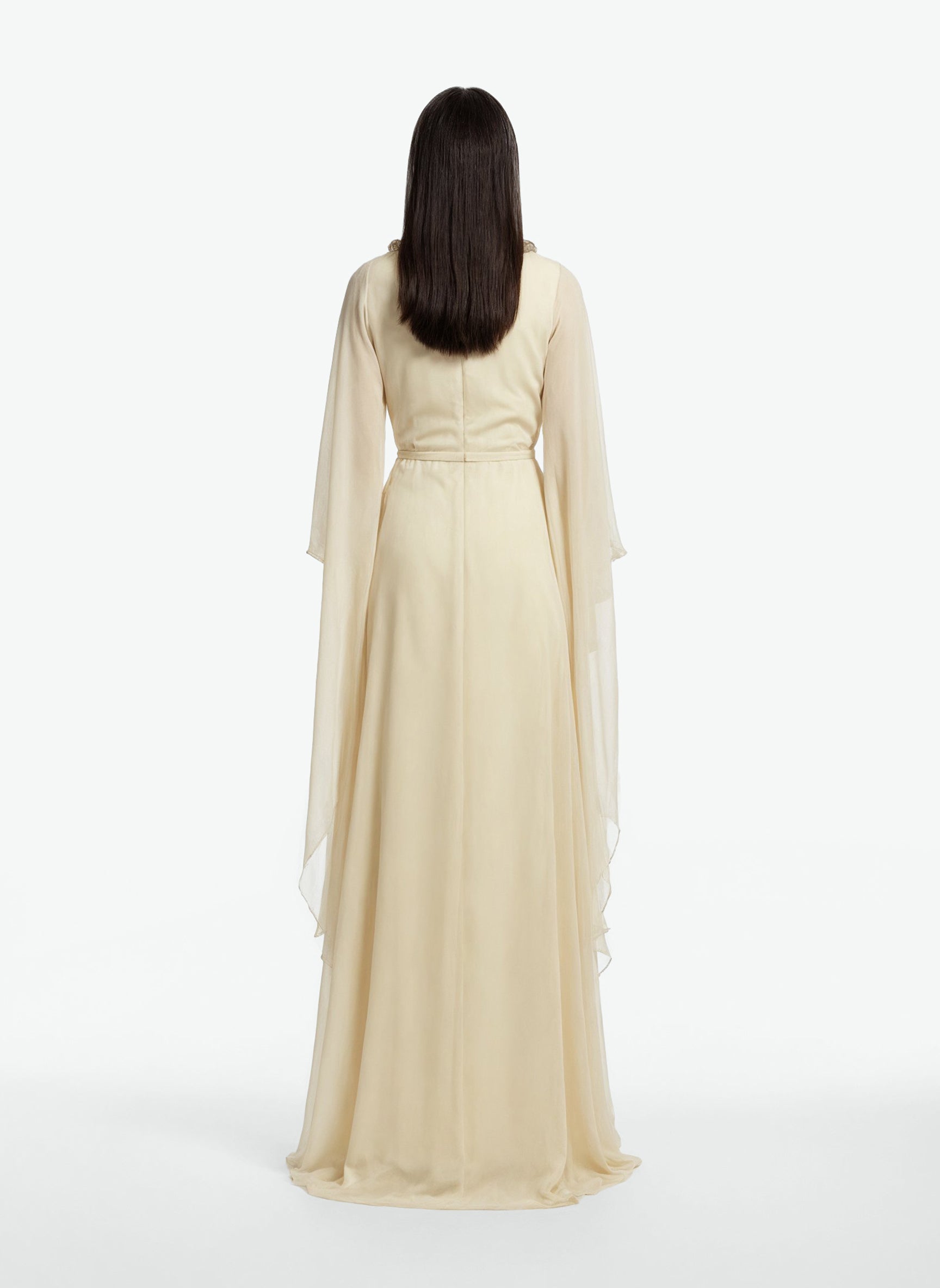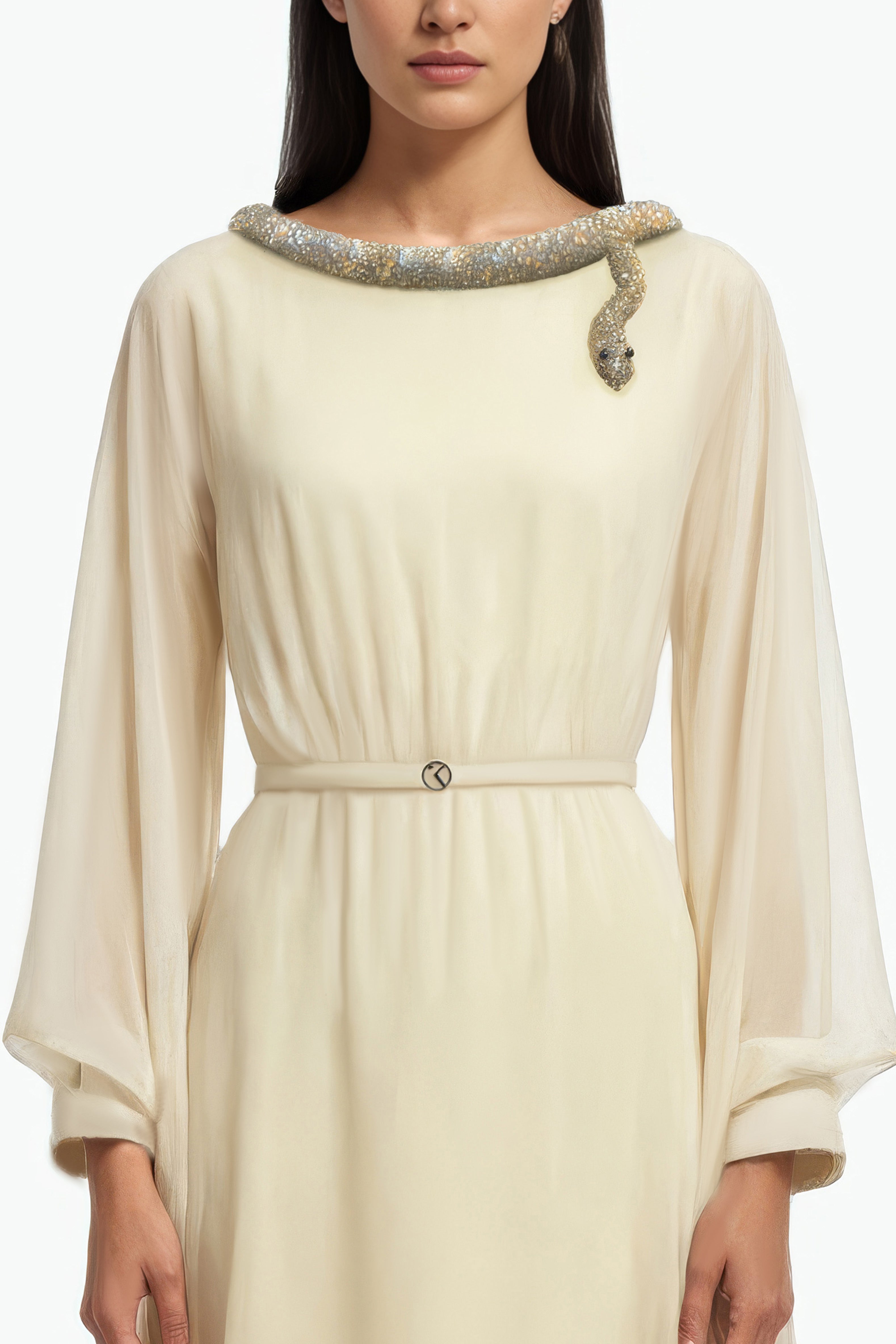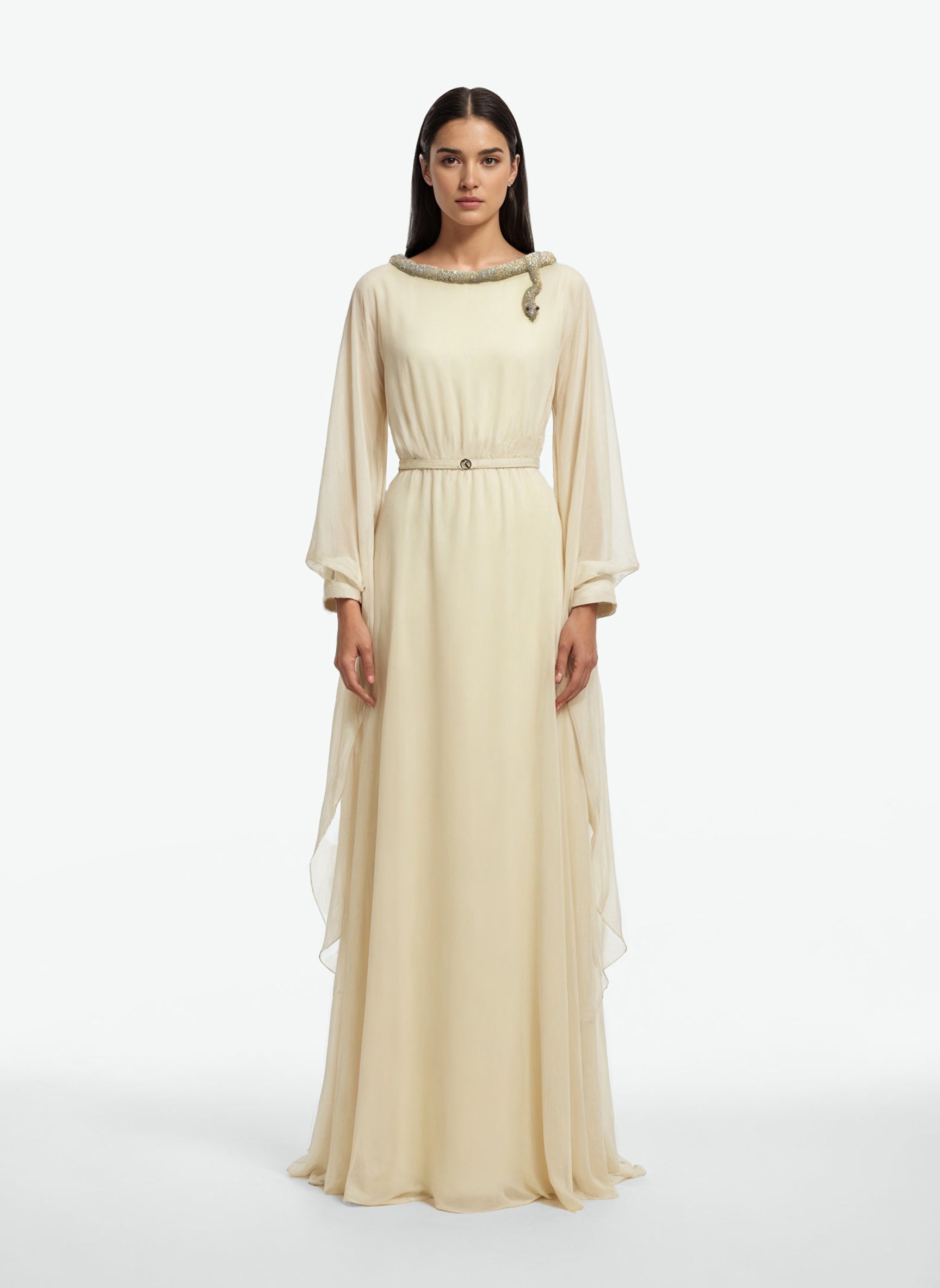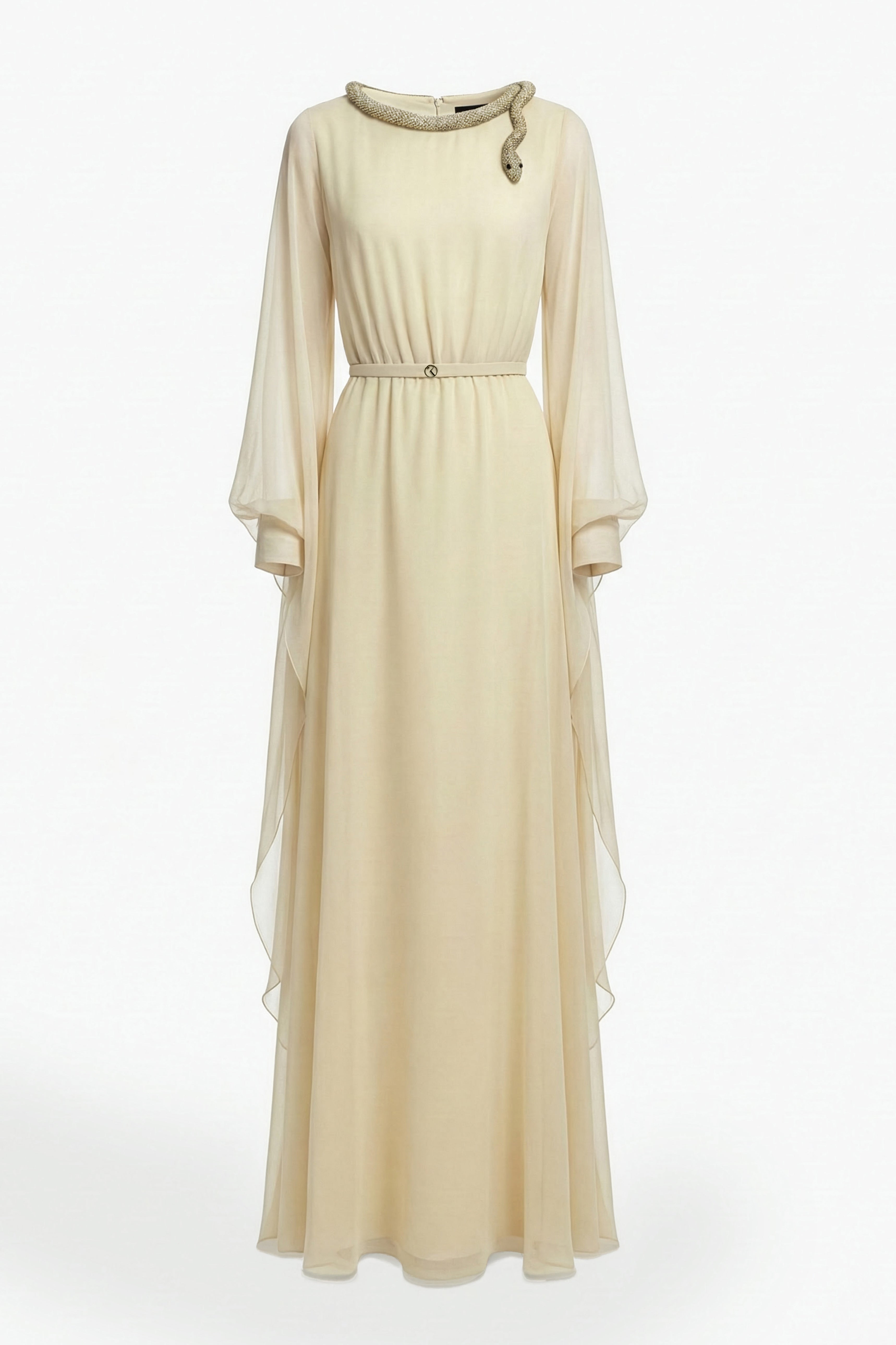 فستان أصفر ناعم يتميز بياقة على شكل قارب وأكمام واسعة متدفقة وقصة طويلة تصل إلى الأرض مع ذيل رقيق. يتم تحديد الخصر بحزام رفيع مطابق يحمل شعار SK، بينما يلتف ثعبان مطرز ملفت للنظر حول الياقة، مصنوع من الخرز المعدني الفضي والذهبي والكريستالي لإضفاء لمسة جريئة ونحتية.