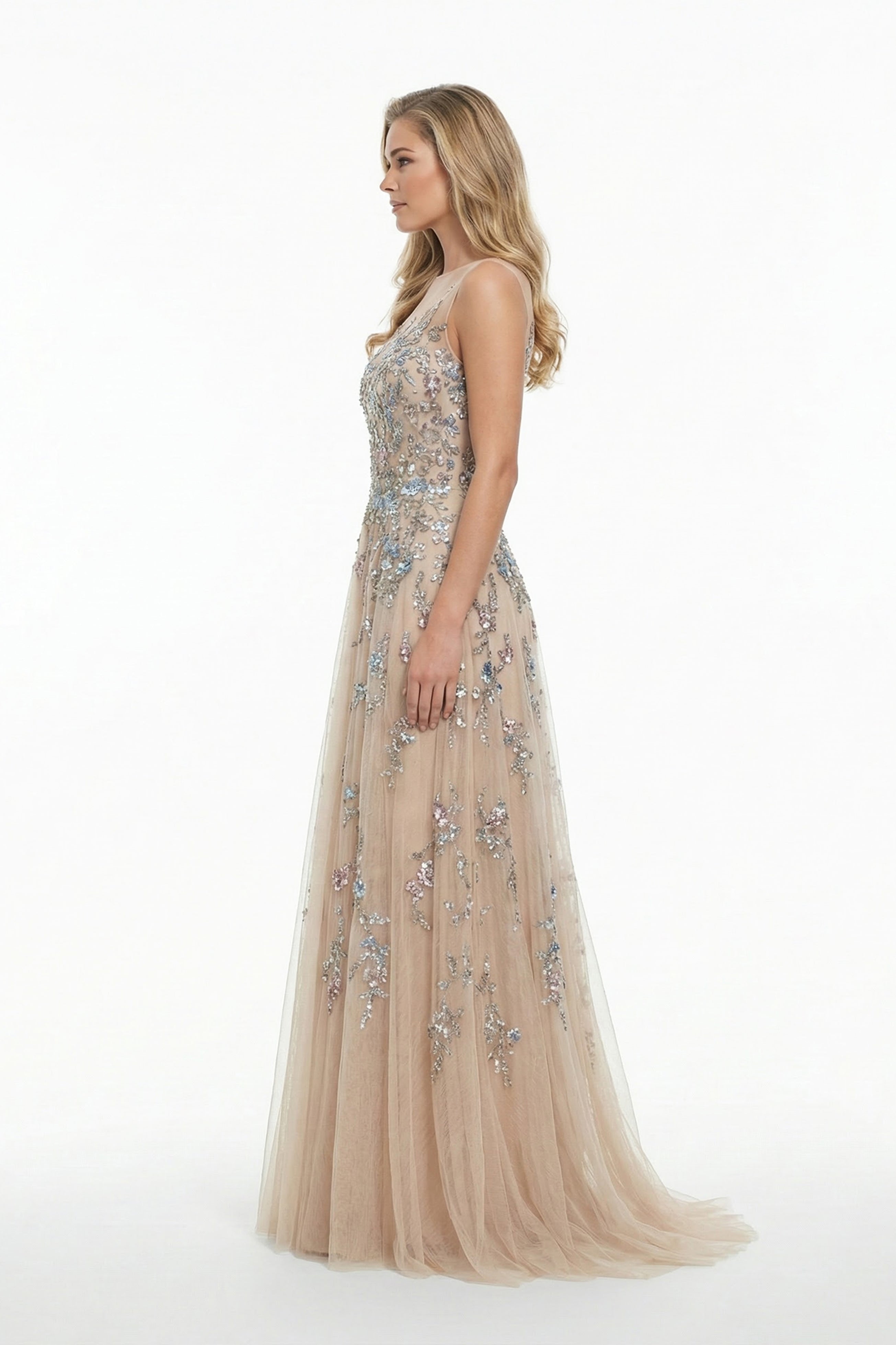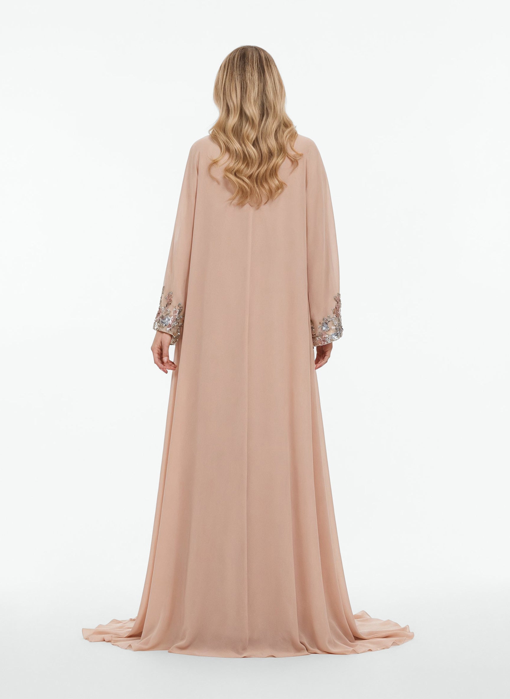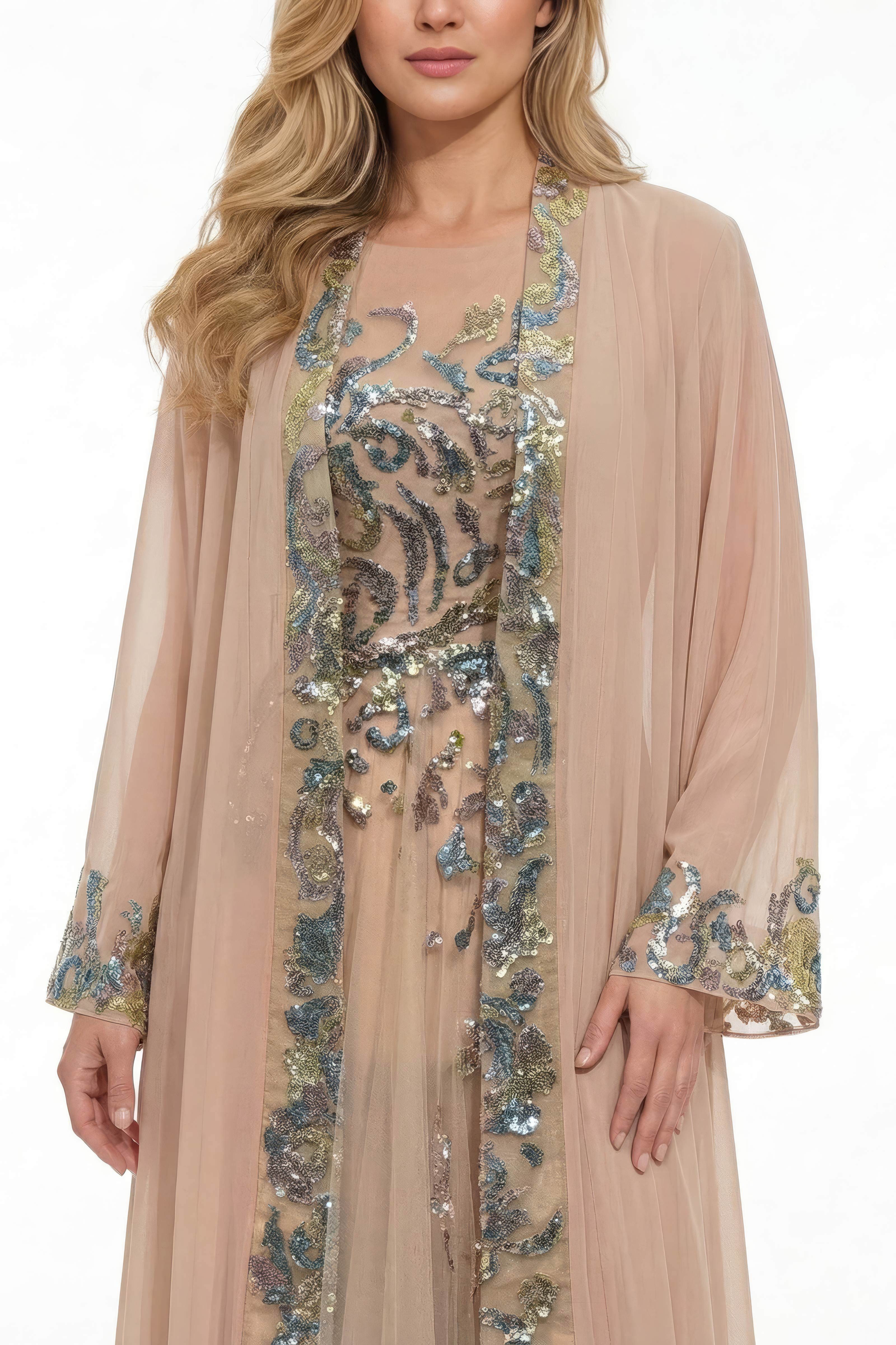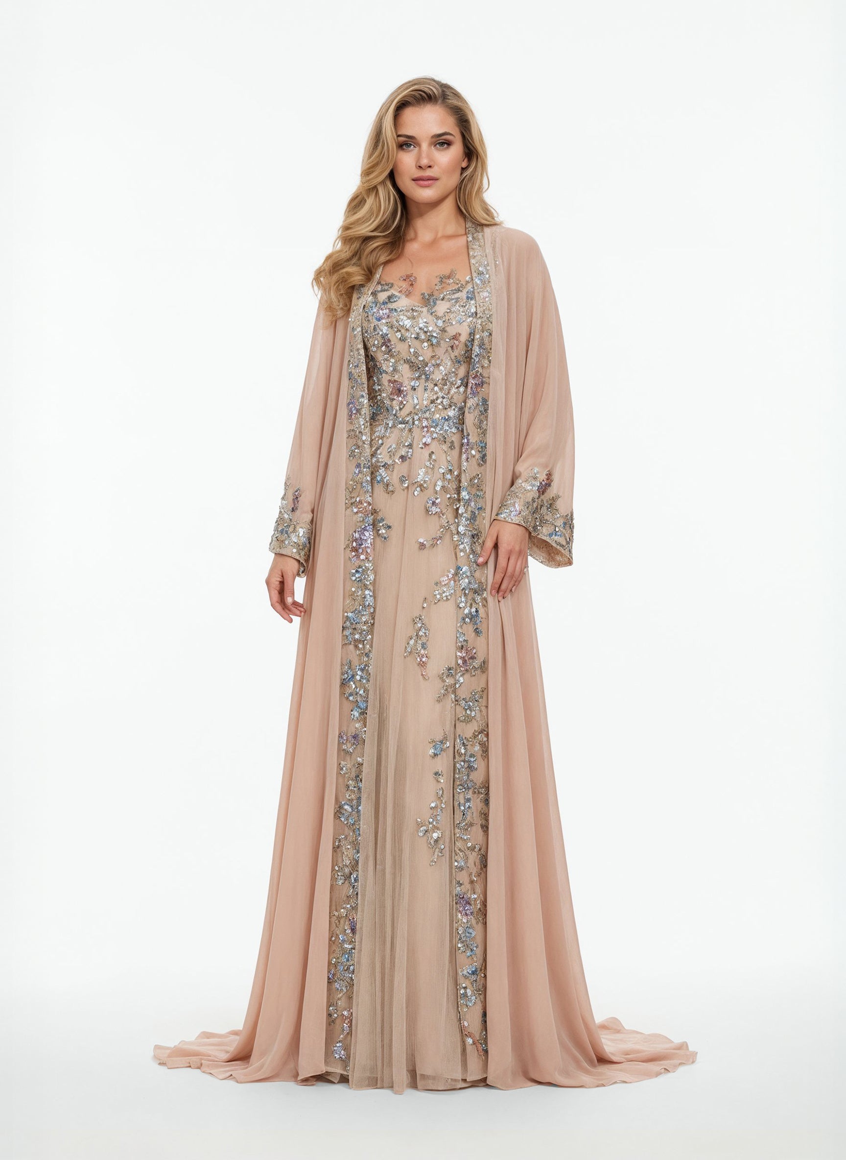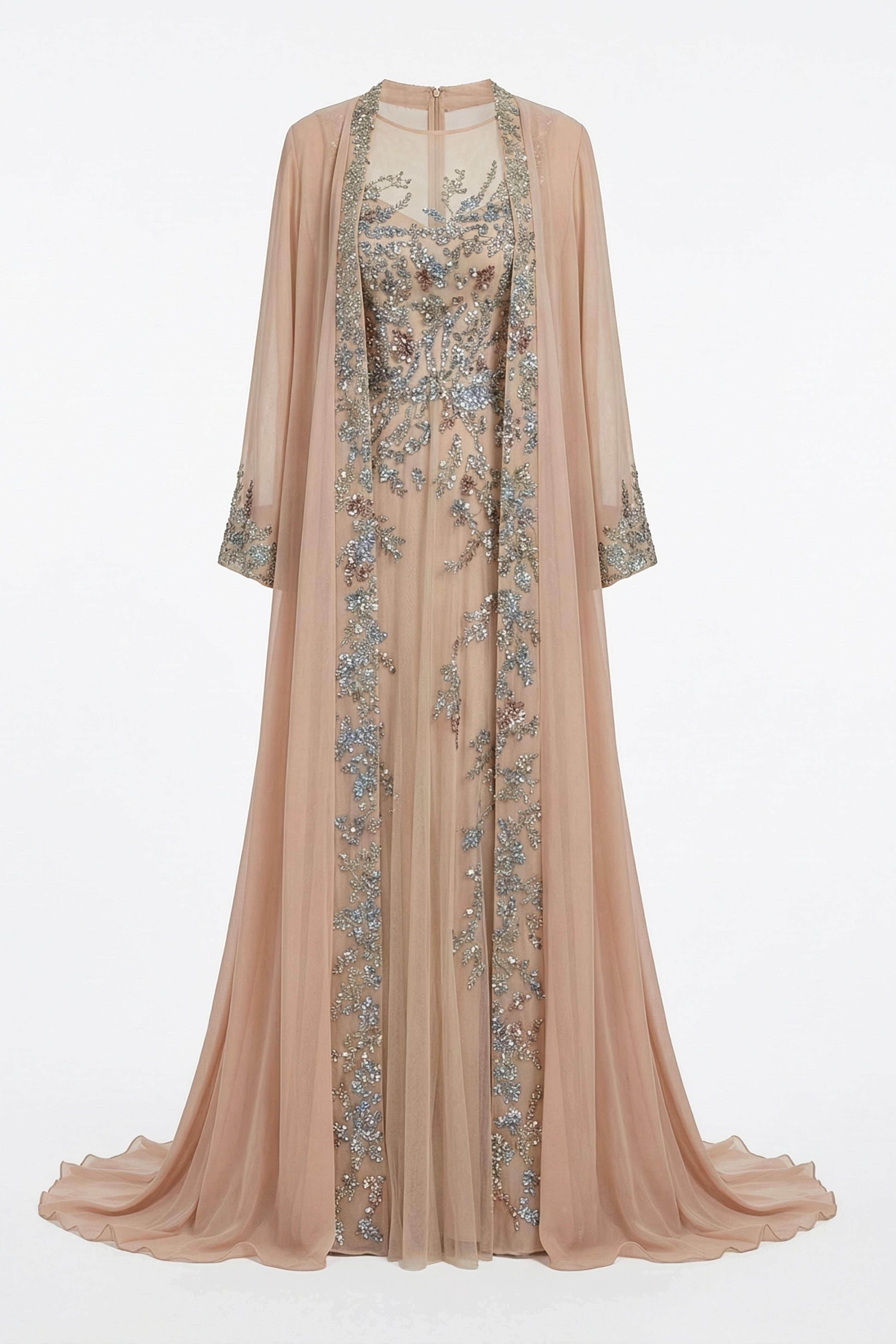 فستان من التول البيج اللون مزين بتطريزات معقدة وعباءة من الكريب جورجيت. العباءة مزينة بزخارف من الترتر متعدد الألوان، مما يضفي لمسة من الحرفية الدقيقة على التصميم.