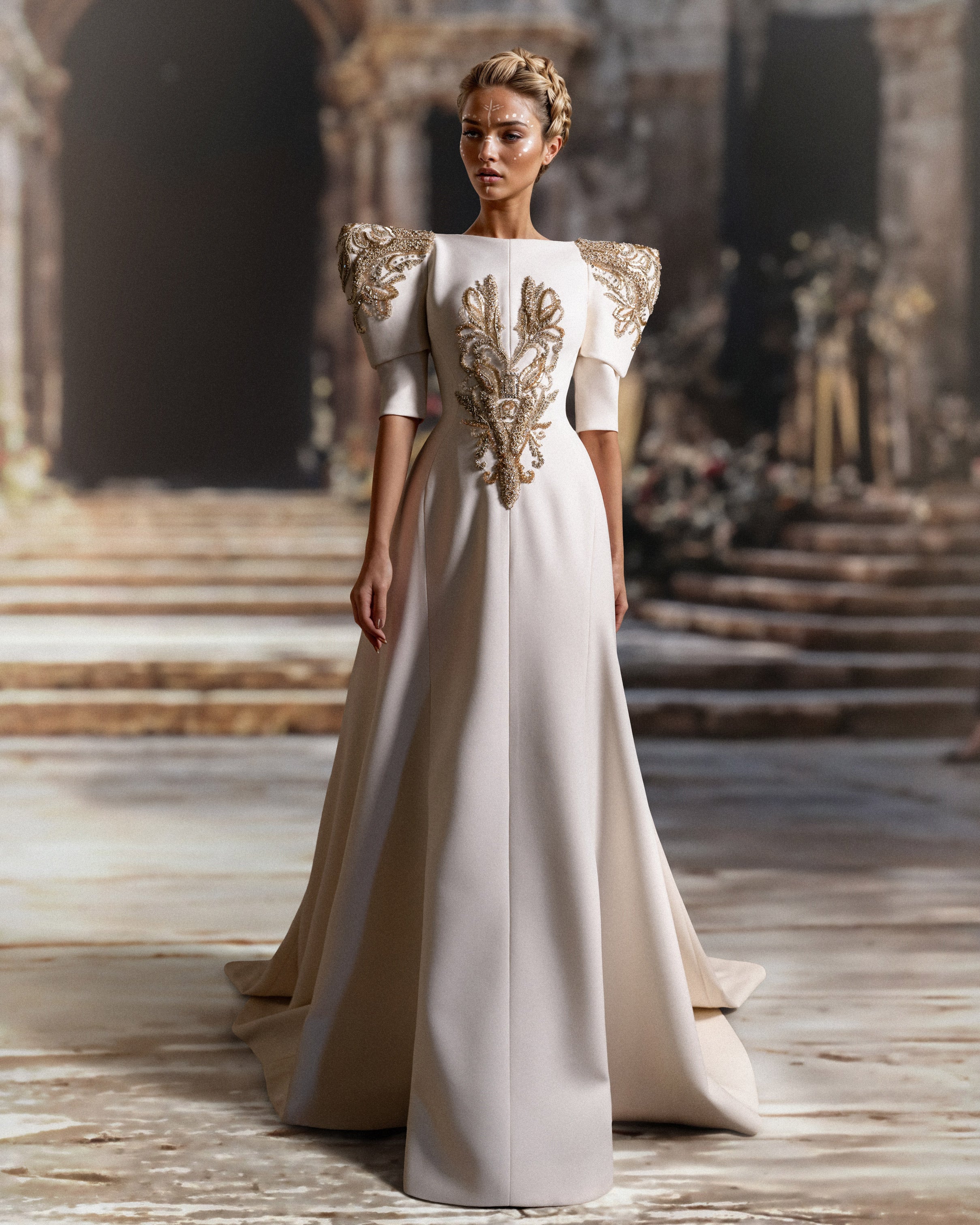 في قلب الفستان، تزدهر التطريزات الذهبية المعقدة على الصدر والأكتاف، وهي عبارة عن تركيبة مزخرفة من الزخارف الباروكية المقدمة بالخرز