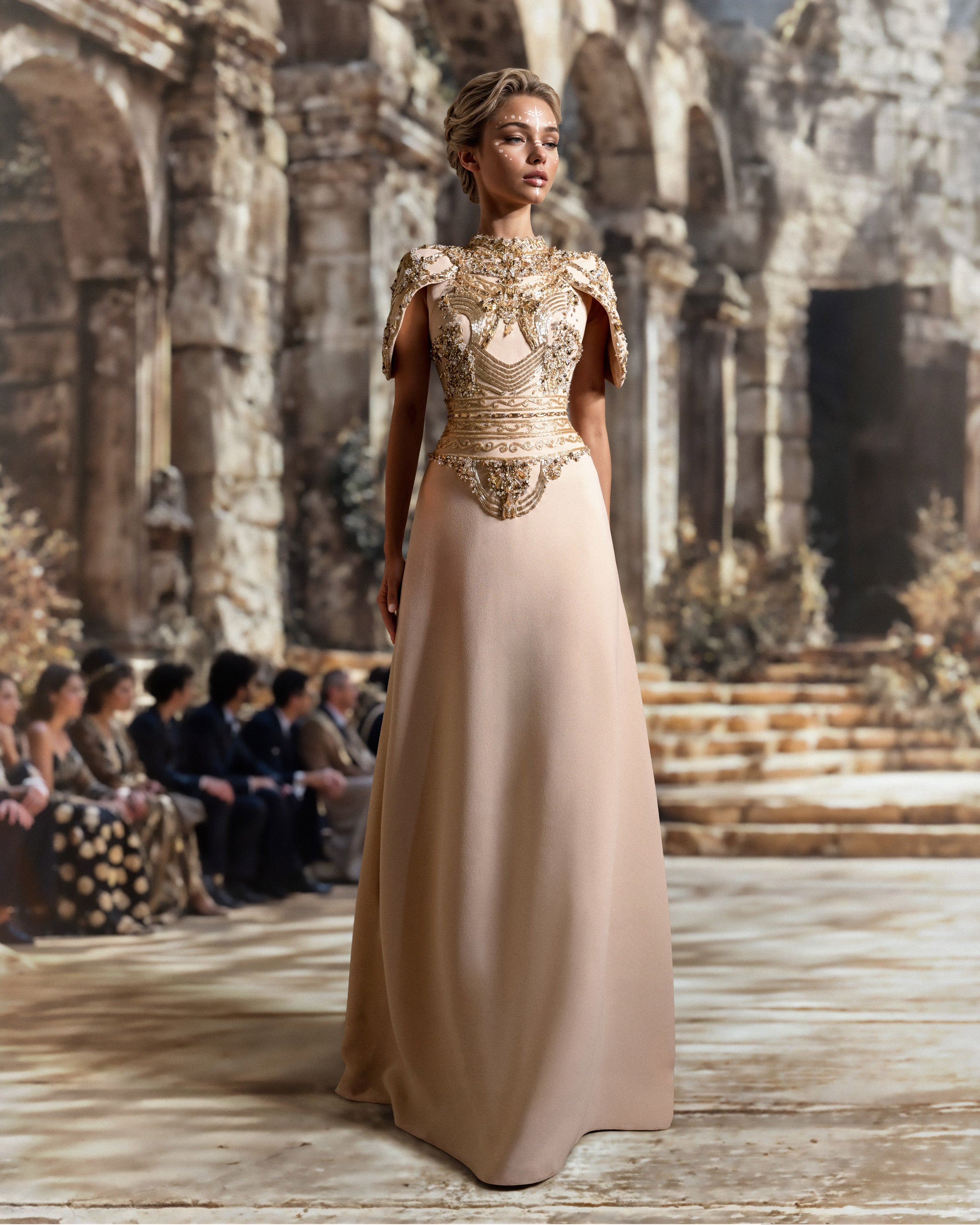 نقدم لكم فستان الكريب كوتور الذهبي، وهو ابتكار قوي وأنيق في نفس الوقت يمزج بين الهيكل المنحوت والزخارف الراقية. صُنع الفستان من الكريب كوتور الذهبي الناعم، ويتميز بتصميم أنيق وممتد وينسدل بانسيابية على الأرض برشاقة هادئة.
