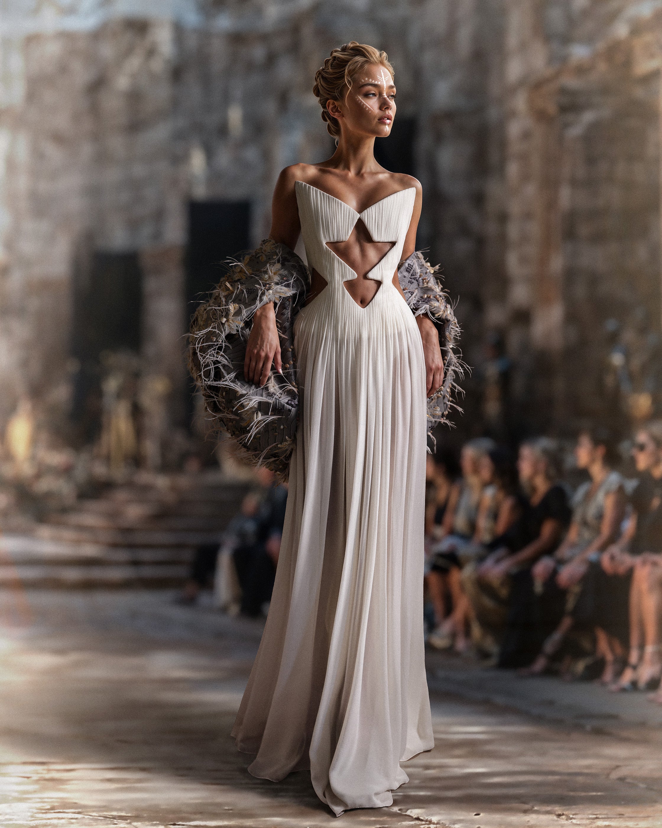 يبرز الصدر بفتحات هندسية تؤطر الخصر ببراعة. يزين الفستان سترة مهيكلة مذهلة من الجلد الفضي مزينة بفسيفساء غنية من المواد المختلطة ولمسات من الريش الموضوعة يدويًا. يضفي الجاكيت