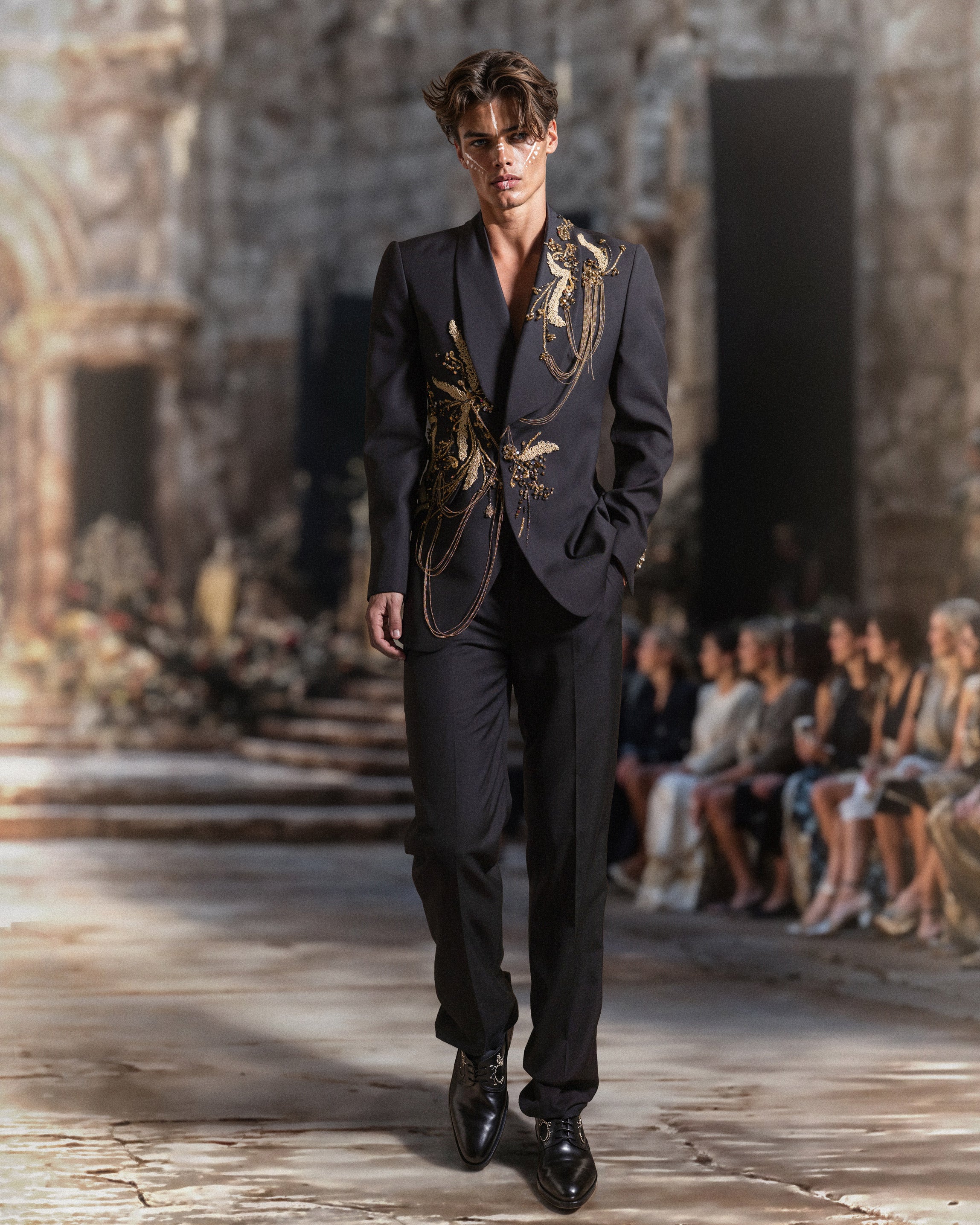 نقدم لك البدلة المطرزة من صوف الكشمير باللون الأسود النفاث. صُنعت من صوف الكشمير الفاخر، والسترة المهيكلة مفصّلة بشكل رائع بتطريز ذهبي معقد