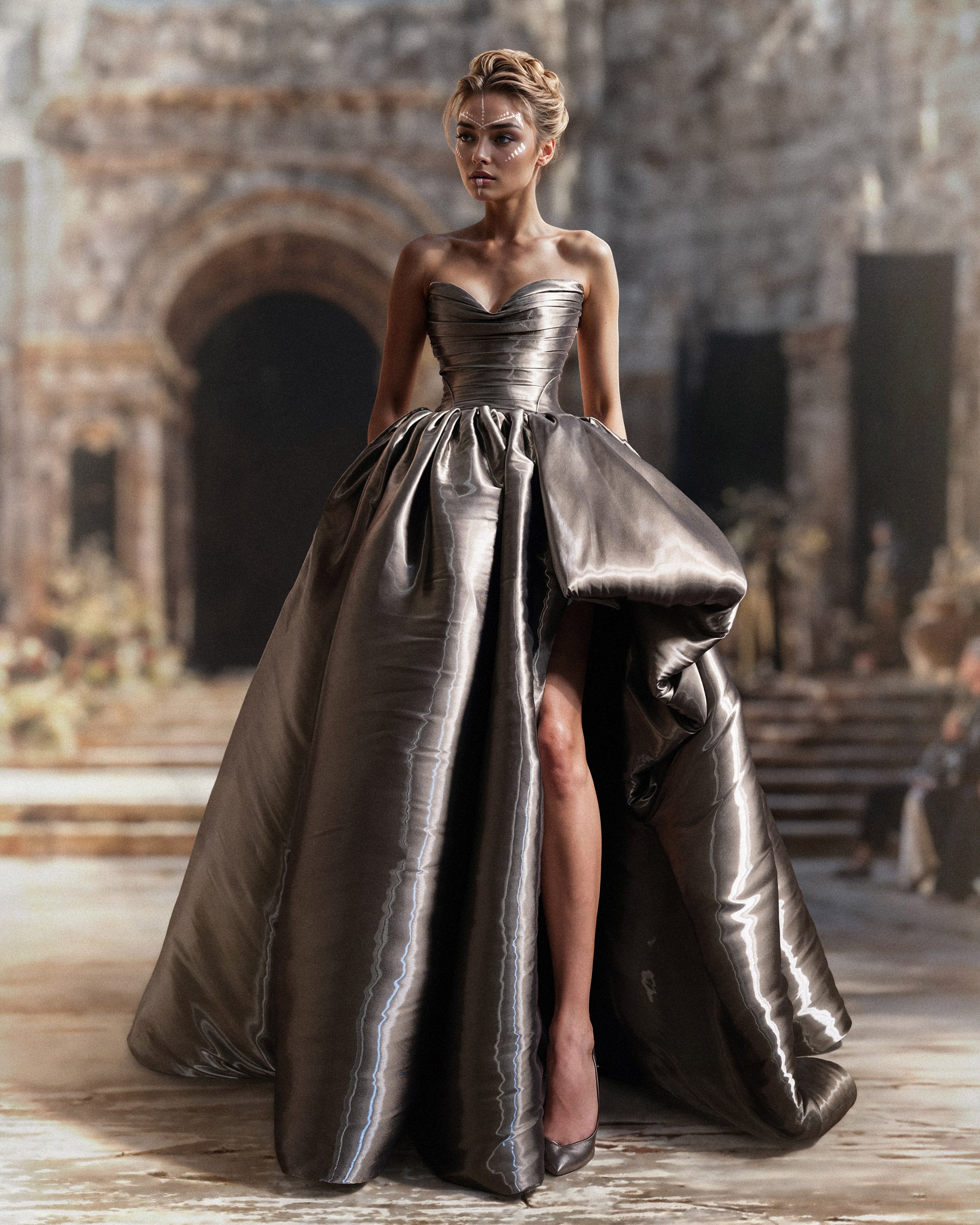 ومن هناك، تنسدل الطيّات الضخمة إلى تنورة كاملة ومثيرة تتخللها تنورة جريئة مجمعة تفتح على فتحة جانبية تضفي على الإطلالة حركة وجاذبية