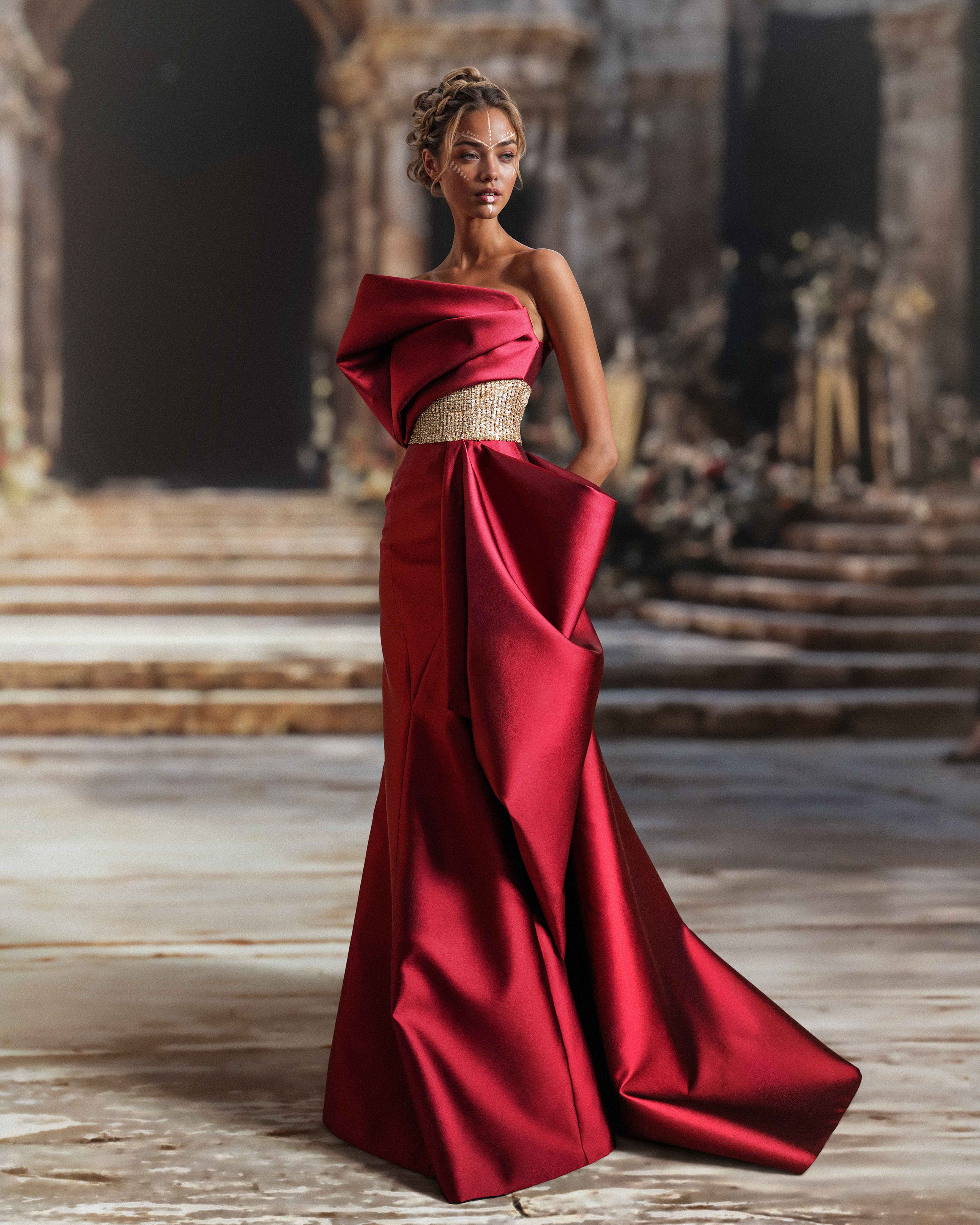 نقدم لكِ فستان كابيرنيت ميكادو المنسدل. منحوت من كابيرنيت ميكادو ويتميز بتقويرة دراماتيكية غير متماثلة، على شكل منحوتة جريئة