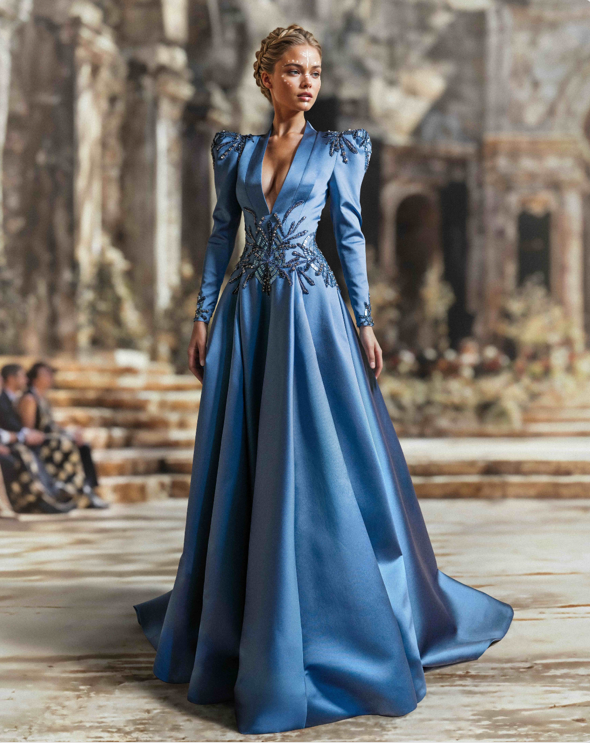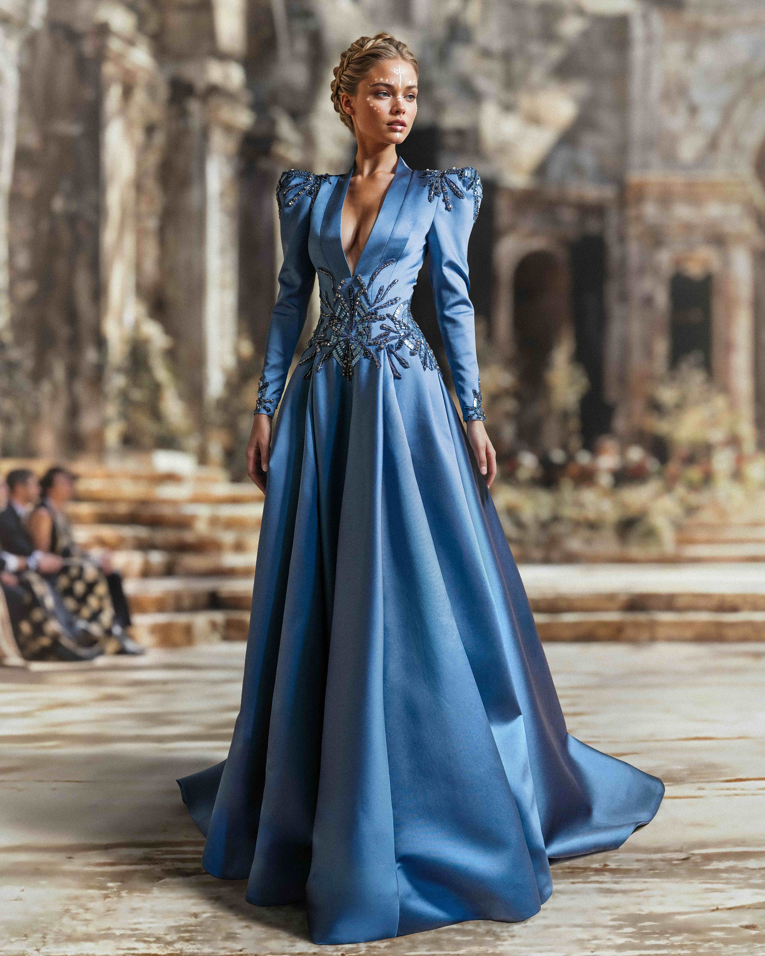 نقدم لكِ فستان بلو هورايزون ميكادو ذو التصميم المهيكل. يتميز هذا الفستان بفتحة رقبة على شكل حرف V وأكتاف محددة بشكل حاد، مما يخلق إطارًا جريئًا وأنيقًا في نفس الوقت. ينتشر التطريز بالخرز الأسود النفاث المعقد والتطريز الكريستالي على الصدر والأكتاف والأكمام في شكل عضوي متفرع.