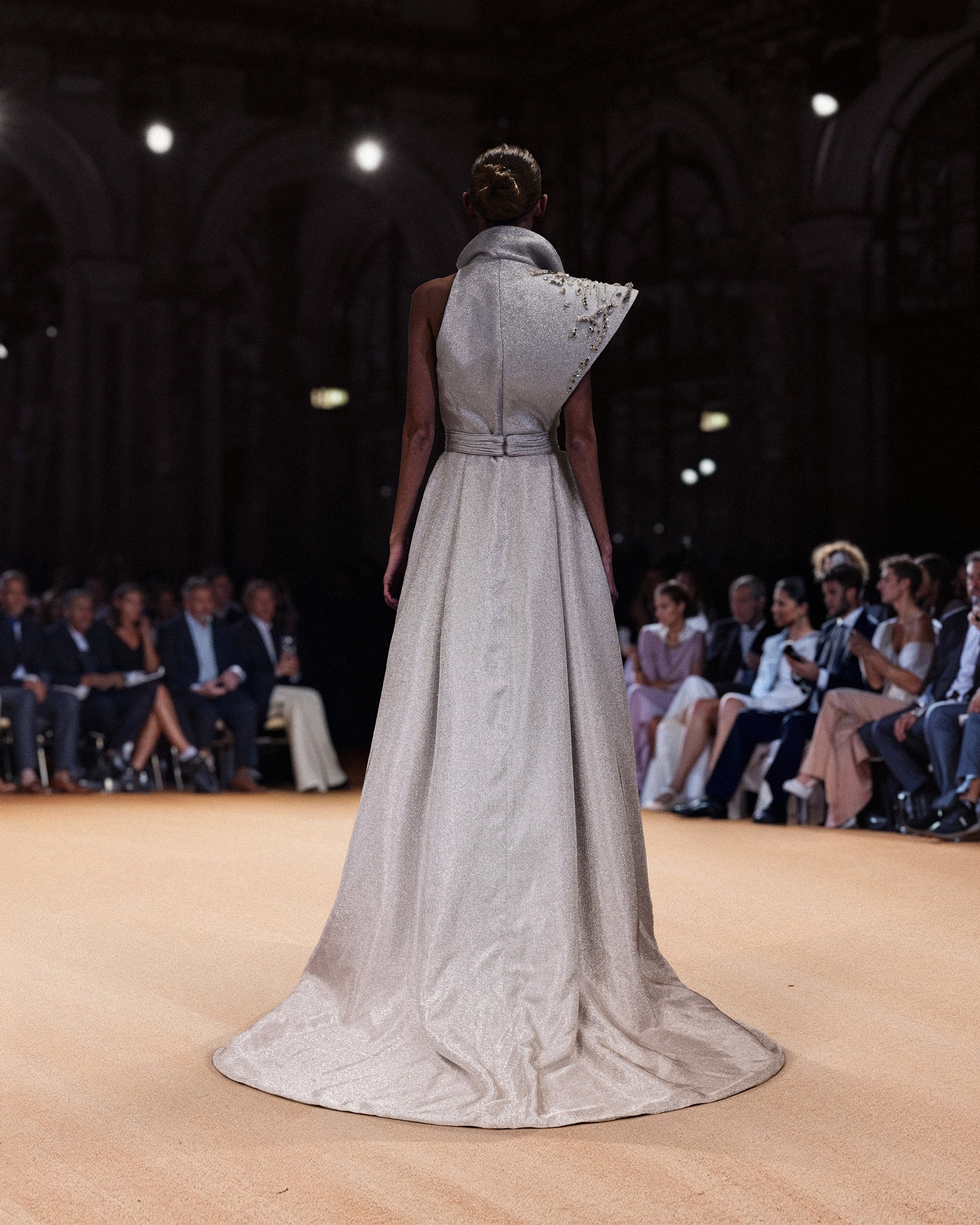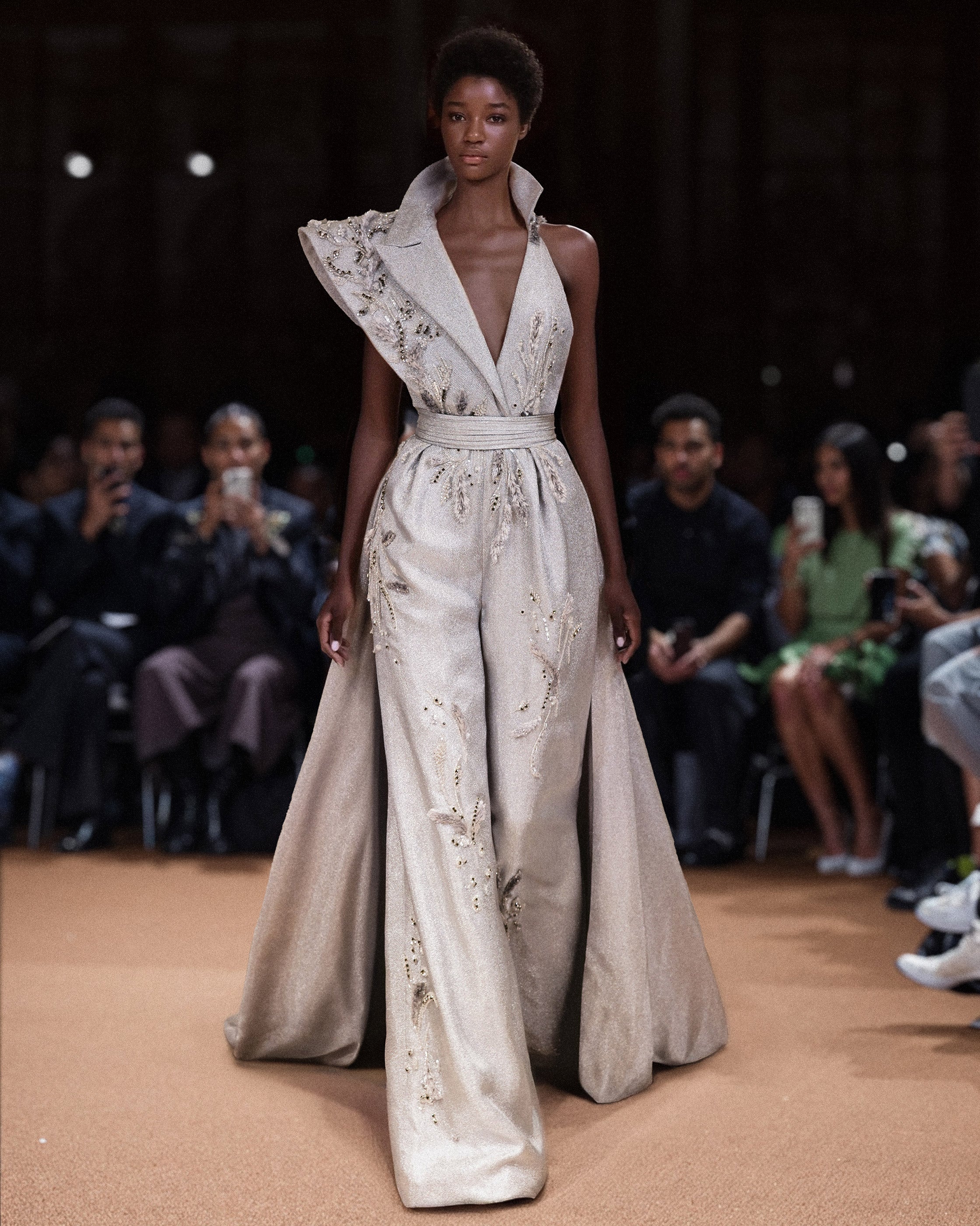 يتميز هذا الجمبسوت بتطريز جميل على أحد جانبيه، حيث يظهر تطريزات معقدة مصنوعة بخيوط عاجية وفضية ويكملها الرافيا الرقيق ويزينها كريستالات بسيطة من الأنثراسيت.