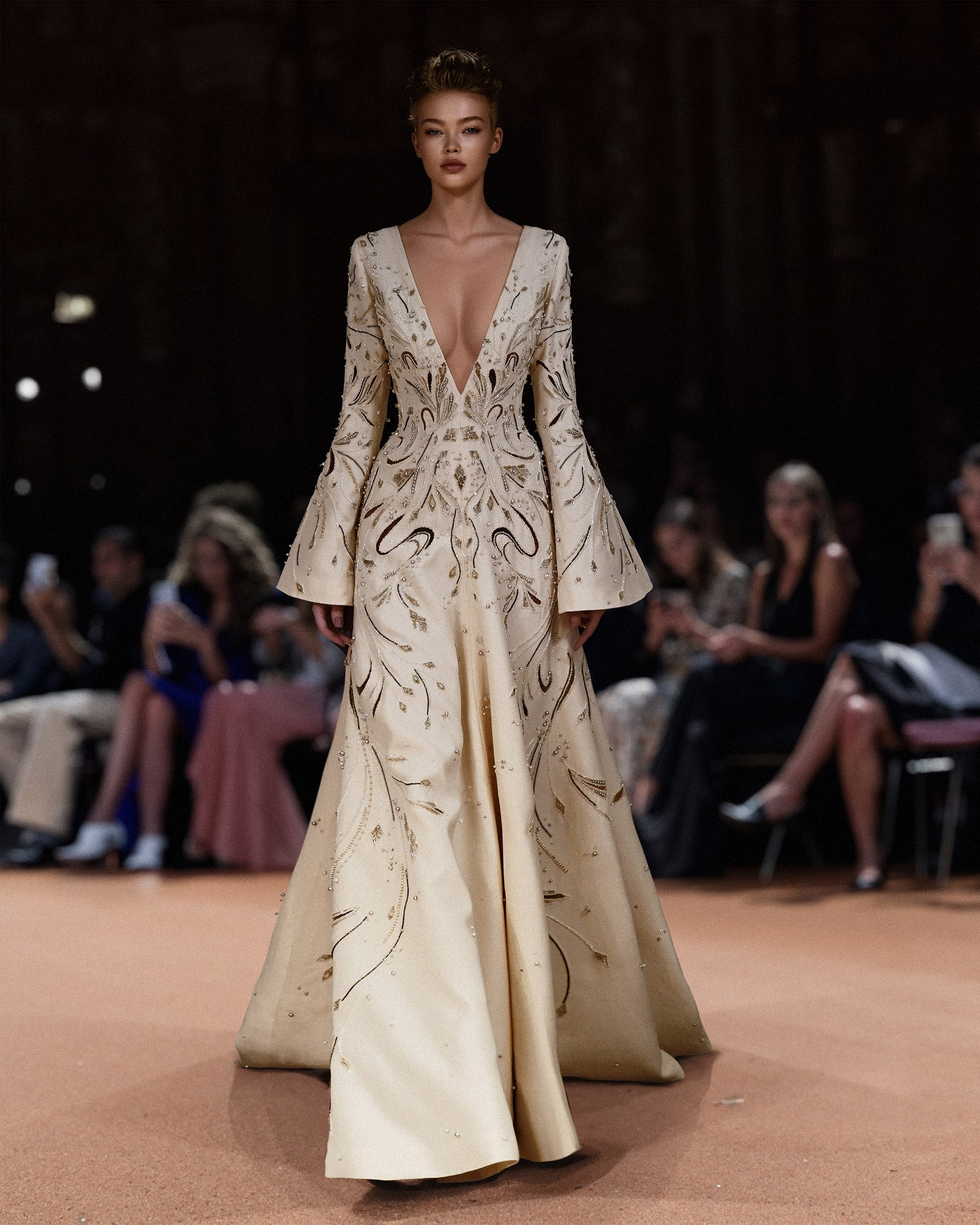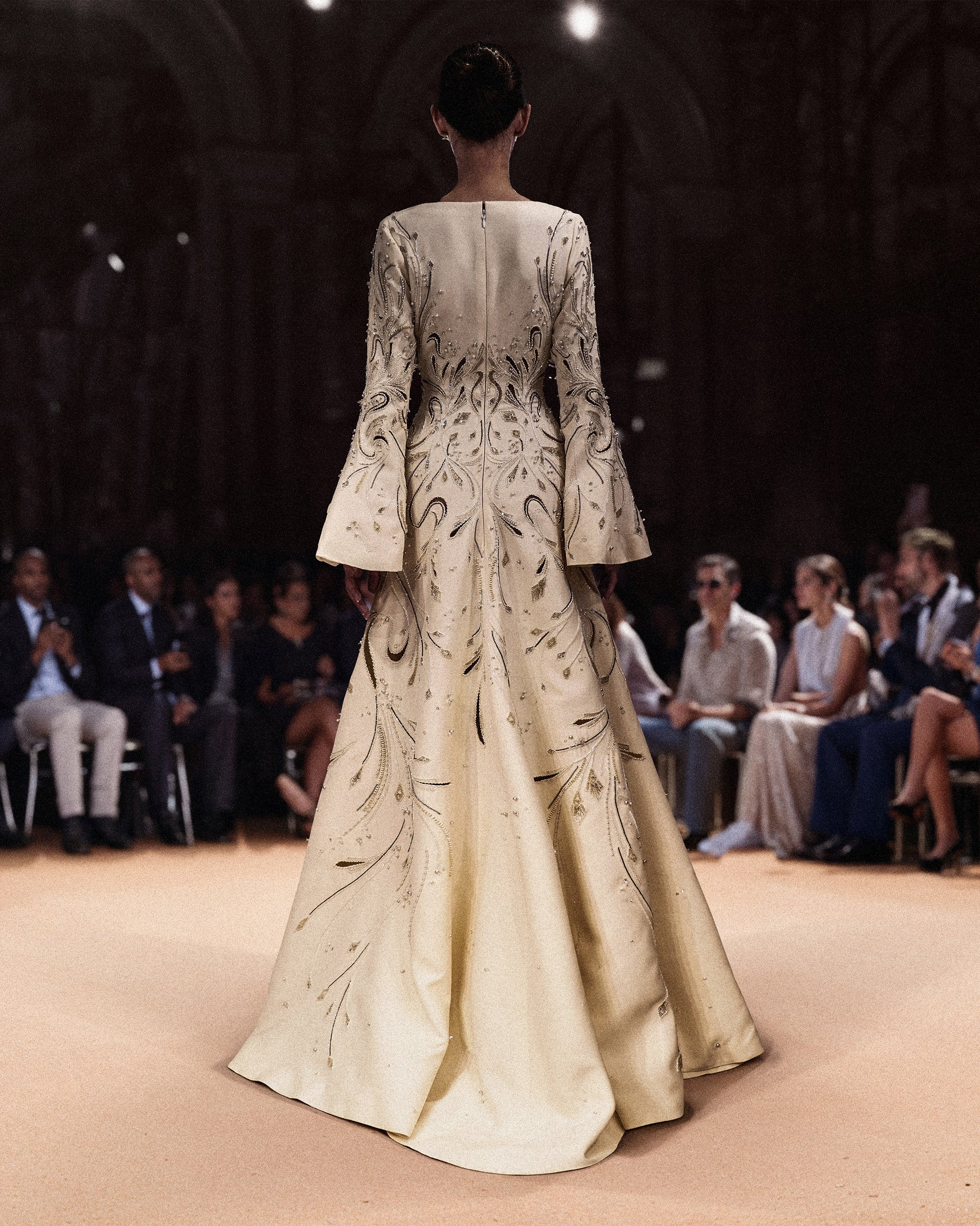 تأتي هذه القطعة الراقية مطرزة بالكامل بتصاميم مثقوبة معقدة تمتد من الأكمام والصدّار وصولاً إلى التنورة المزينة باللؤلؤ والخرز المتلألئ. والنتيجة هي إطلالة فاخرة وأنيقة تبرز حقًا.