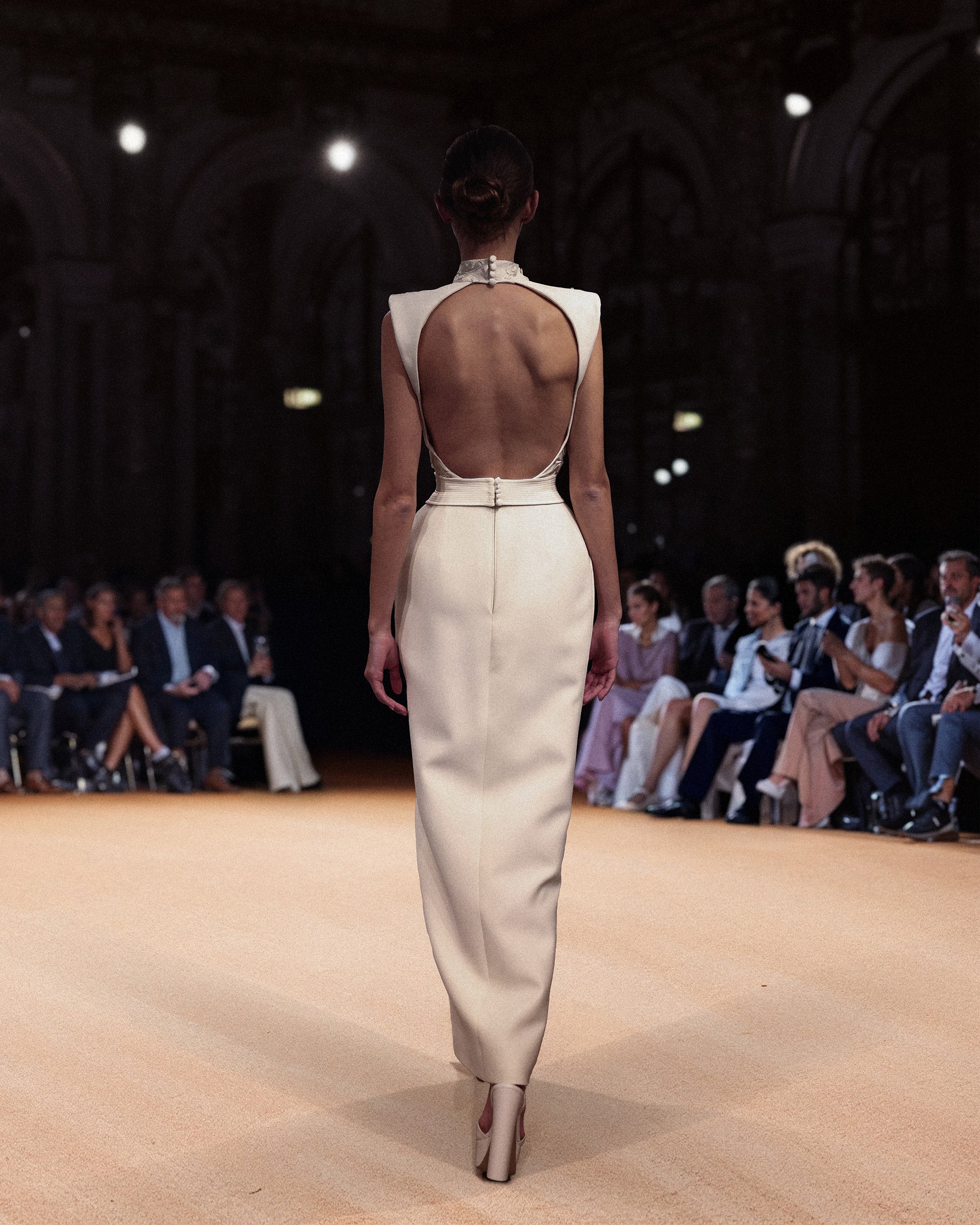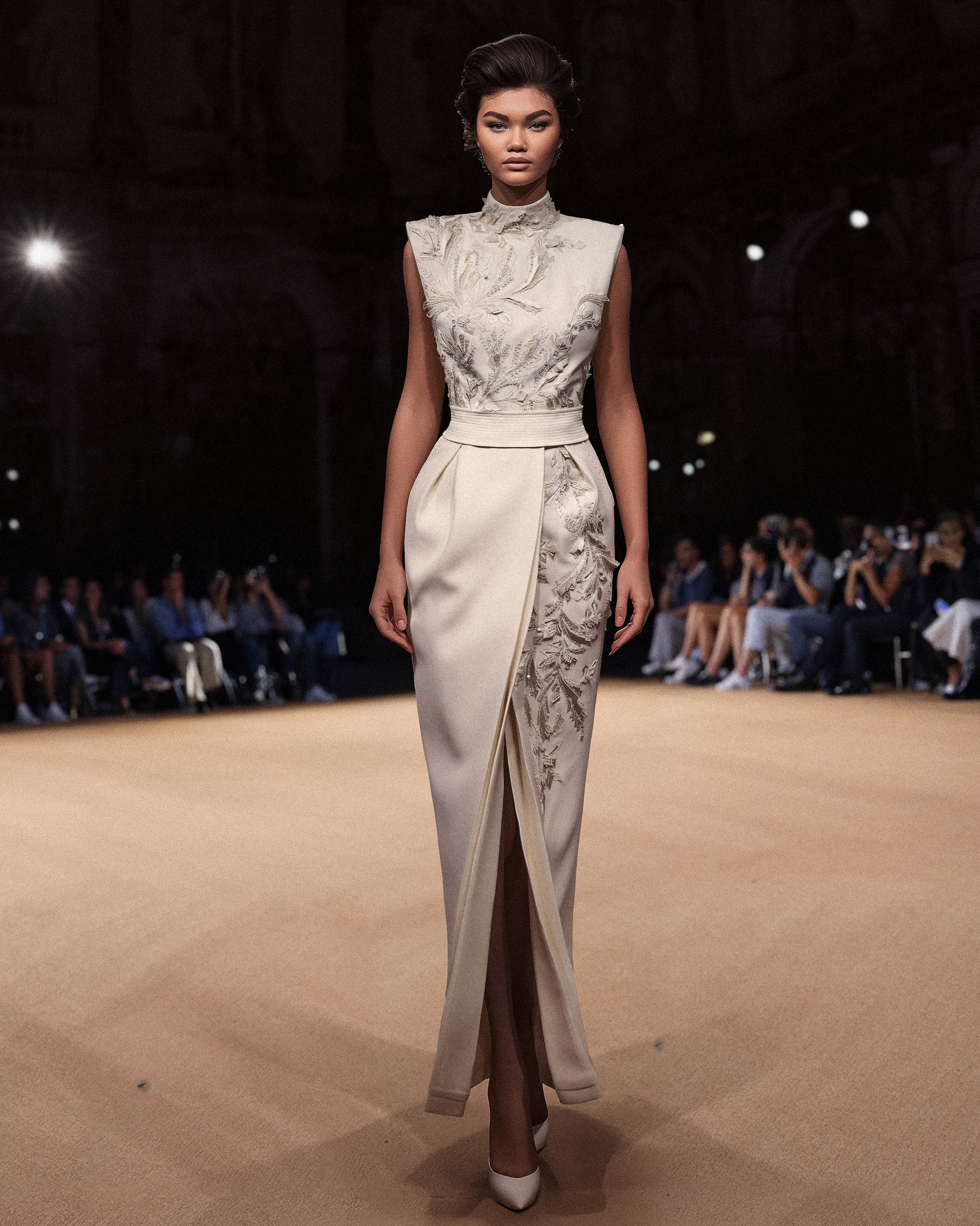 انغمسي في مثال الفخامة مع فستان الكريب العاجي المطرز بالكوتور. تتميز هذه القطعة الرائعة بفتحة رقبة عالية وتصميم بلا أكمام، وتكتمل روعة هذه القطعة الرائعة بتنورة بقصّة مستقيمة متقاطعة مع فتحة أنيقة.