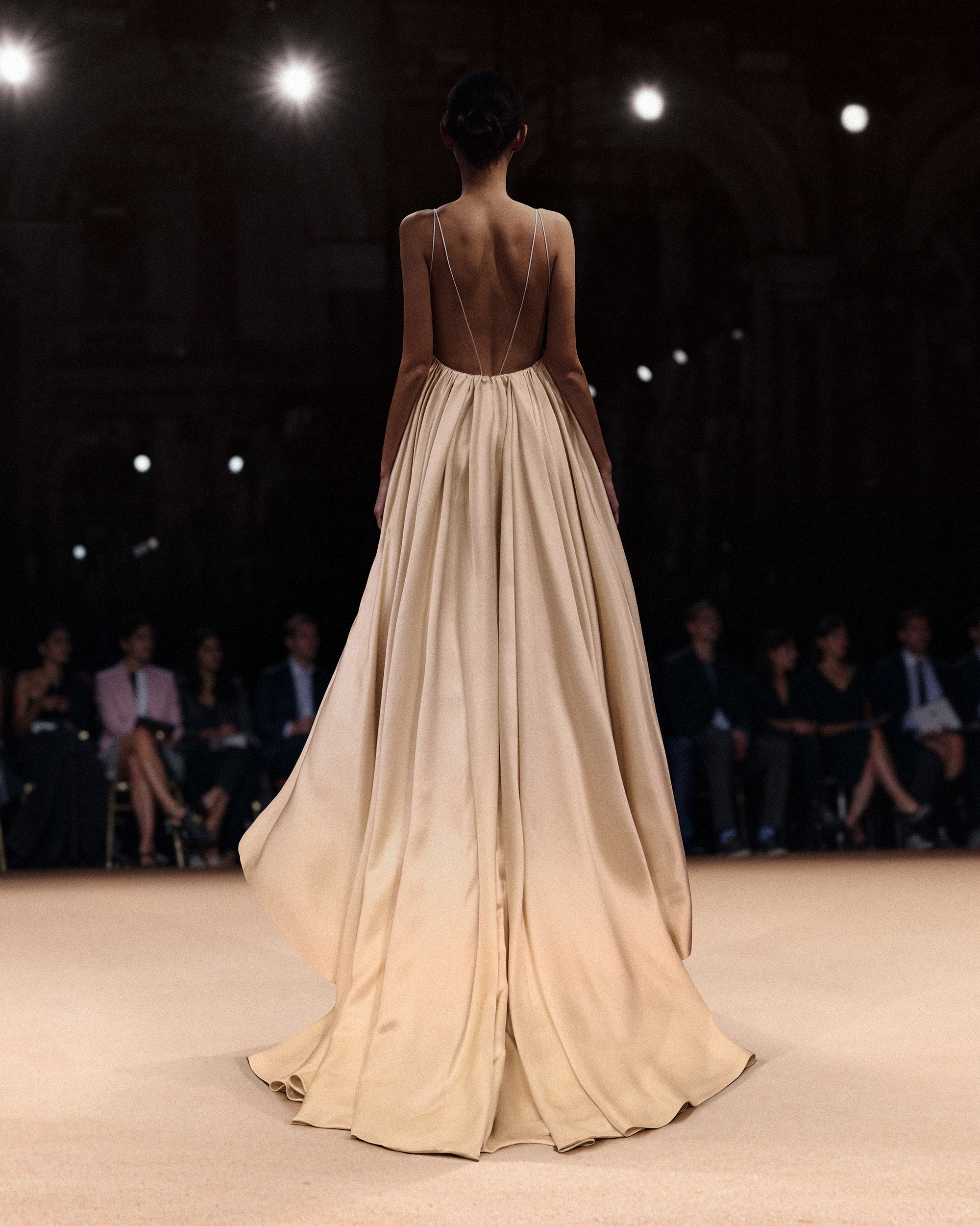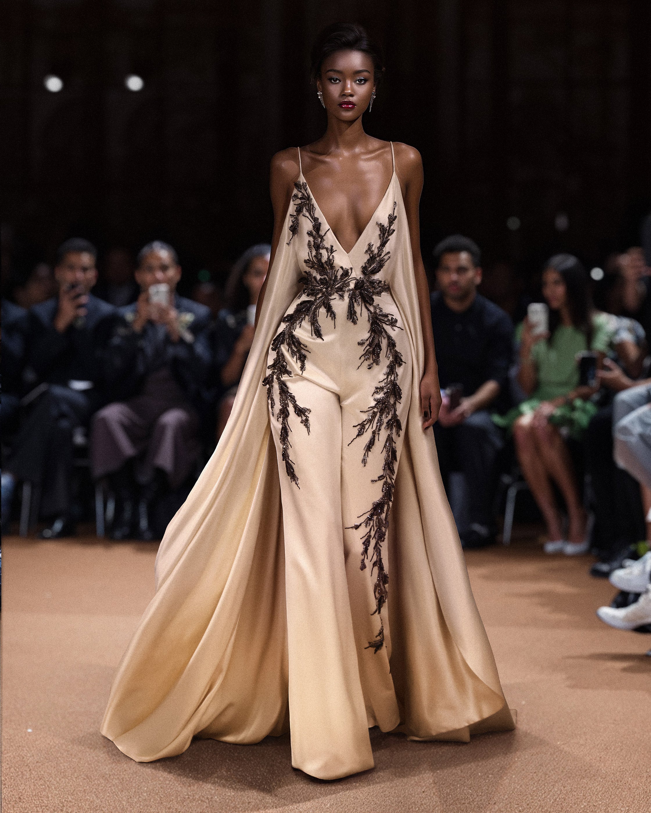نقدم لكِ بذلة الجمبسوت المصنوعة من الساتان الكريب العاجي المصنوعة من الساتان العاجي والمصممة بفتحة رقبة عميقة على شكل V وبنطال بقصّة مستقيمة ويكتمل التصميم بكاب أنيق مرفق. يتميز الجمبسوت بتطريزات رائعة تمتد برشاقة إلى أسفل البنطال بلون أسود فاحم غني.
