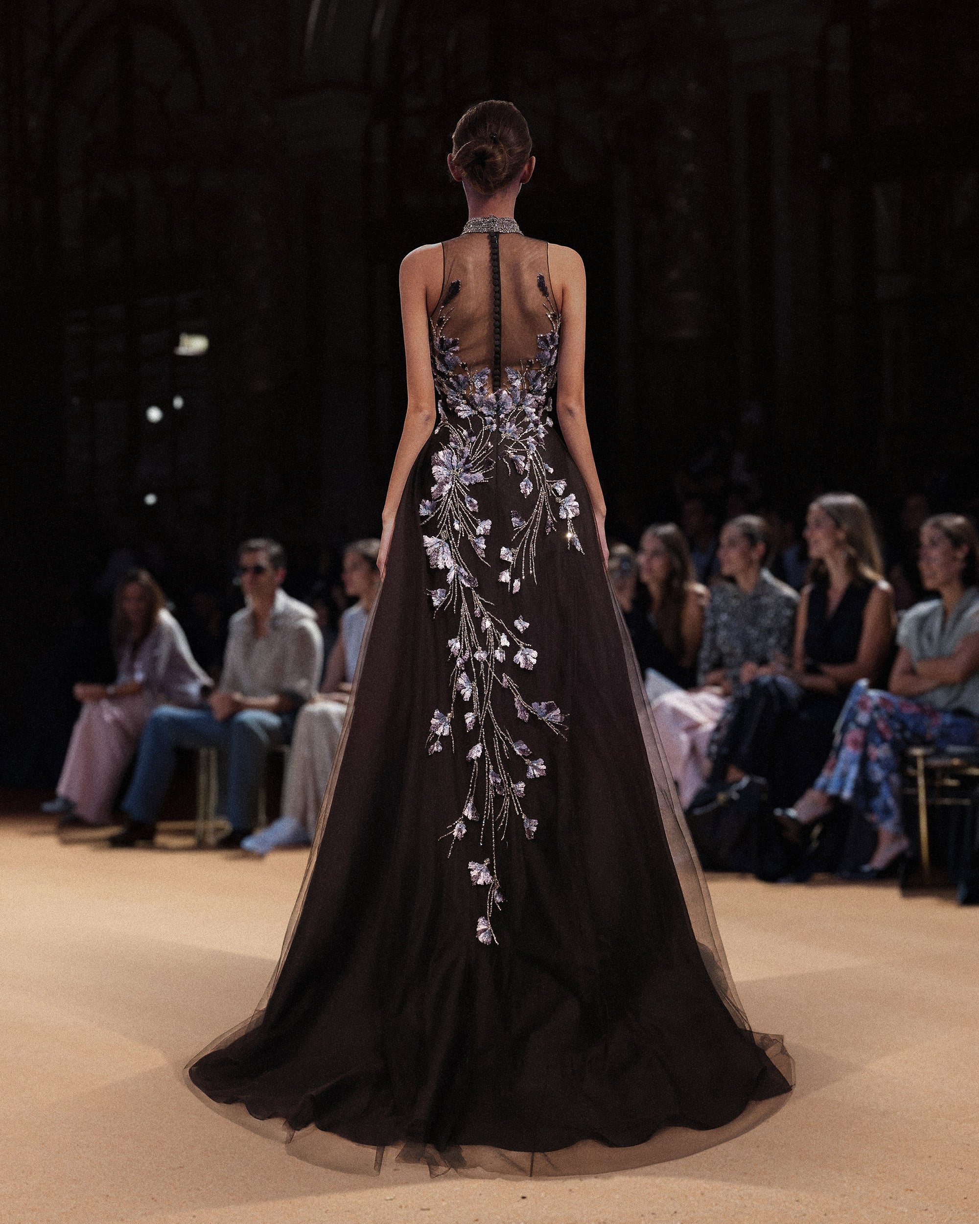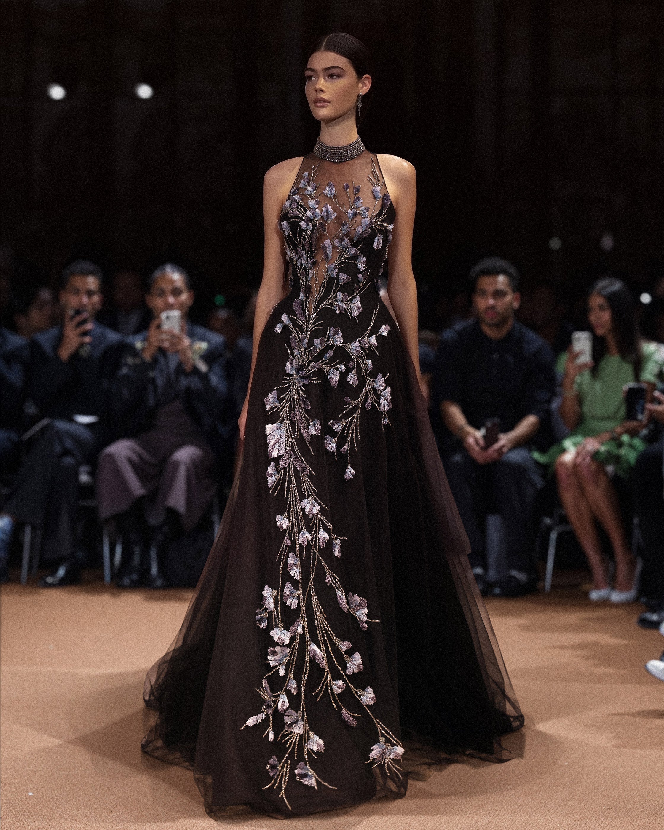 نقدم لكِ فستان التل غير المتناسق باللون الأسود الداكن، وهو مزيج آسر من الأناقة والتصميم العصري. يتميز هذا الفستان المذهل بتقويرة عالية وقصّة بدون أكمام، وتكتمل أناقته بتنورة من التل ذات الشكل الهرمي الذي ينساب برشاقة.