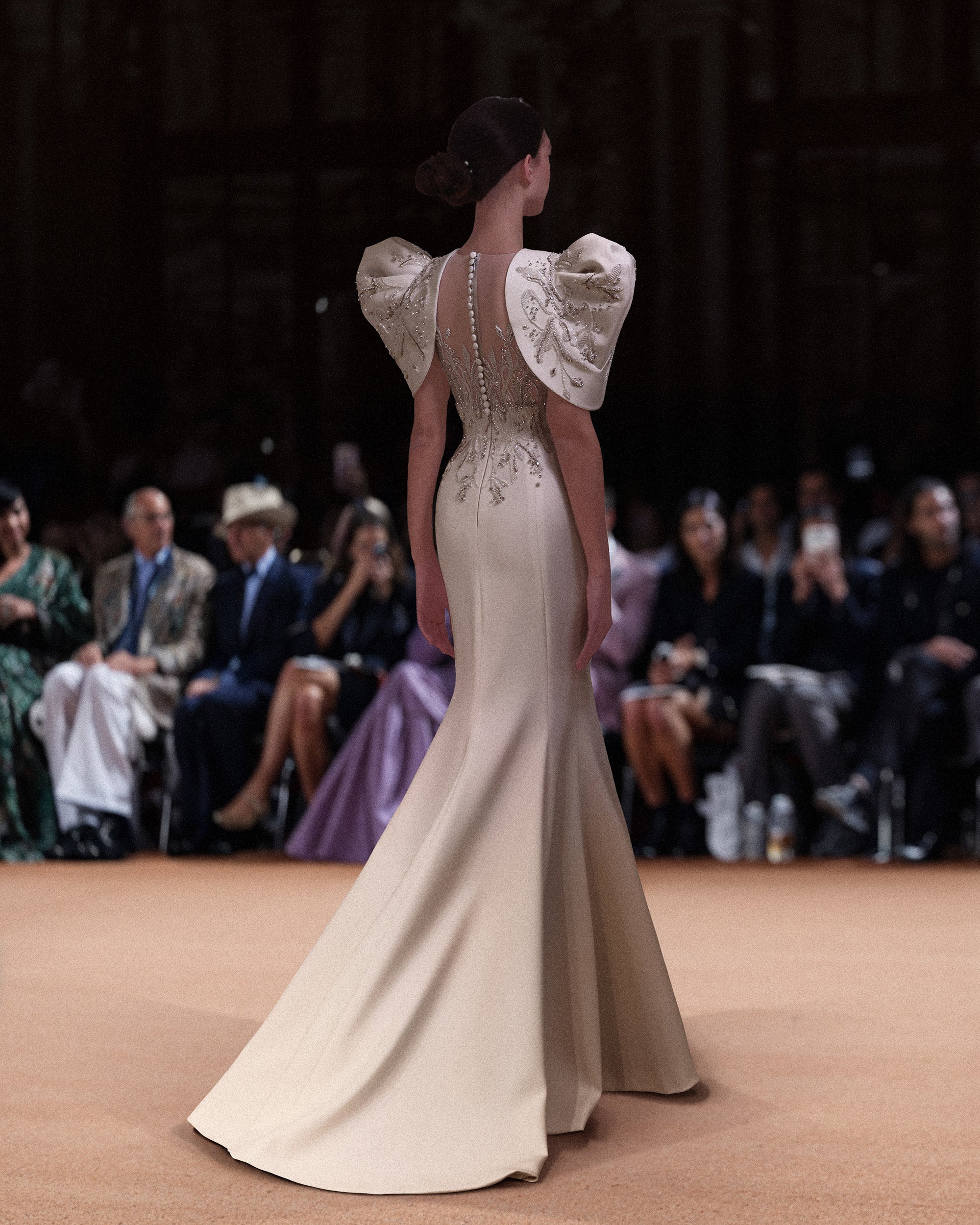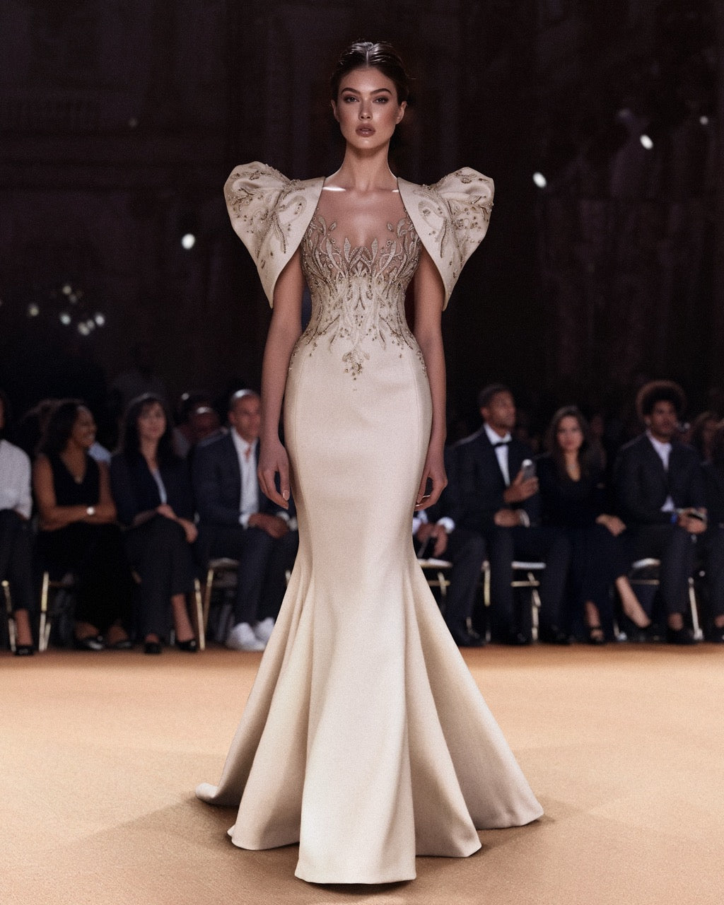 نقدم لكِ الفستان العاجي ثلاثي الكريب الساتان المصنوع من الكريب العاجي المصمم بقصة حورية البحر المذهلة. الفستان مزين بالكامل في الجزء العلوي بخامات عاجية فاخرة، بما في ذلك الخرز والخيوط العاجي والذهبي الفاتح، إلى جانب لمسات رقيقة من الدانتيل لإضفاء مزيد من الملمس.