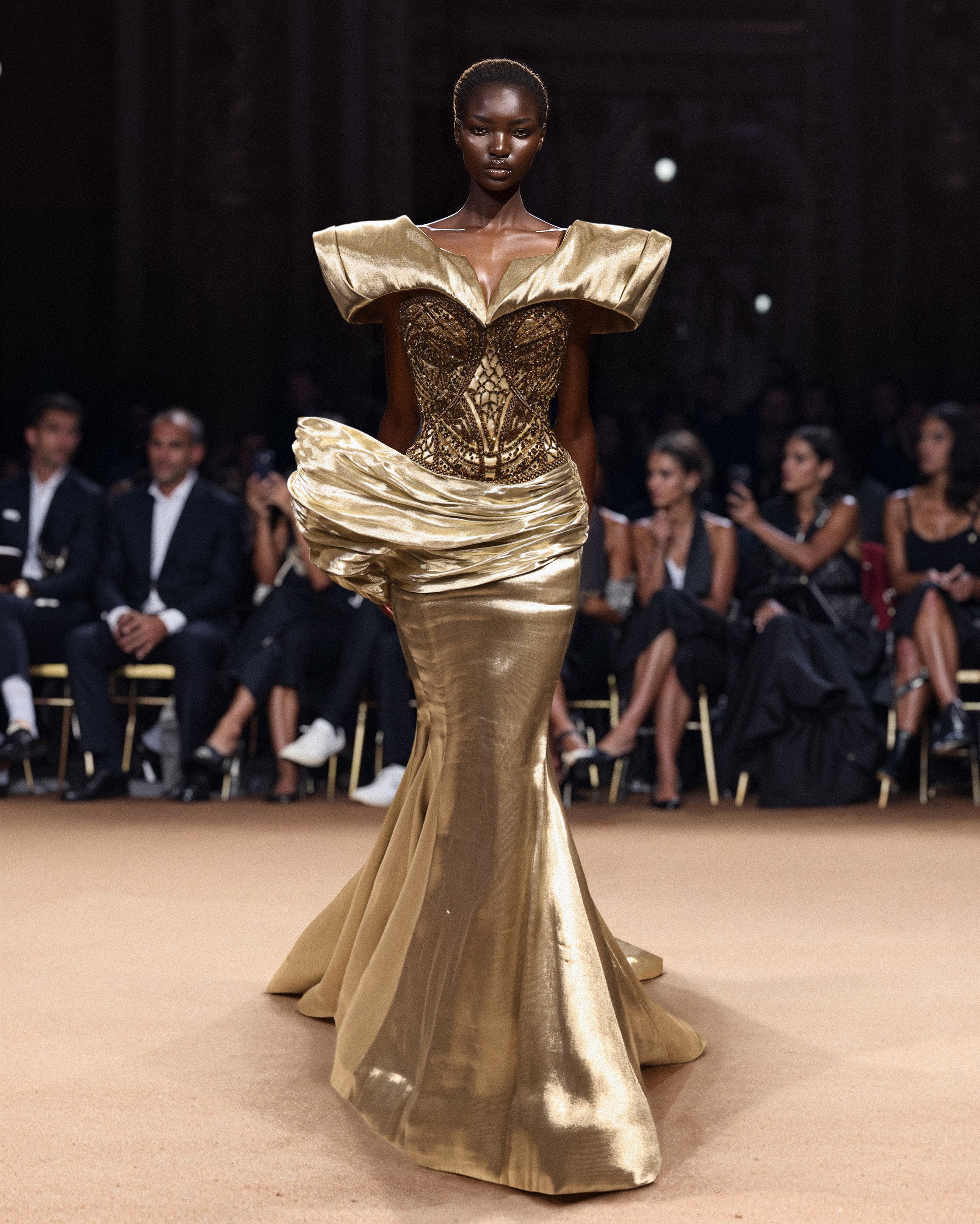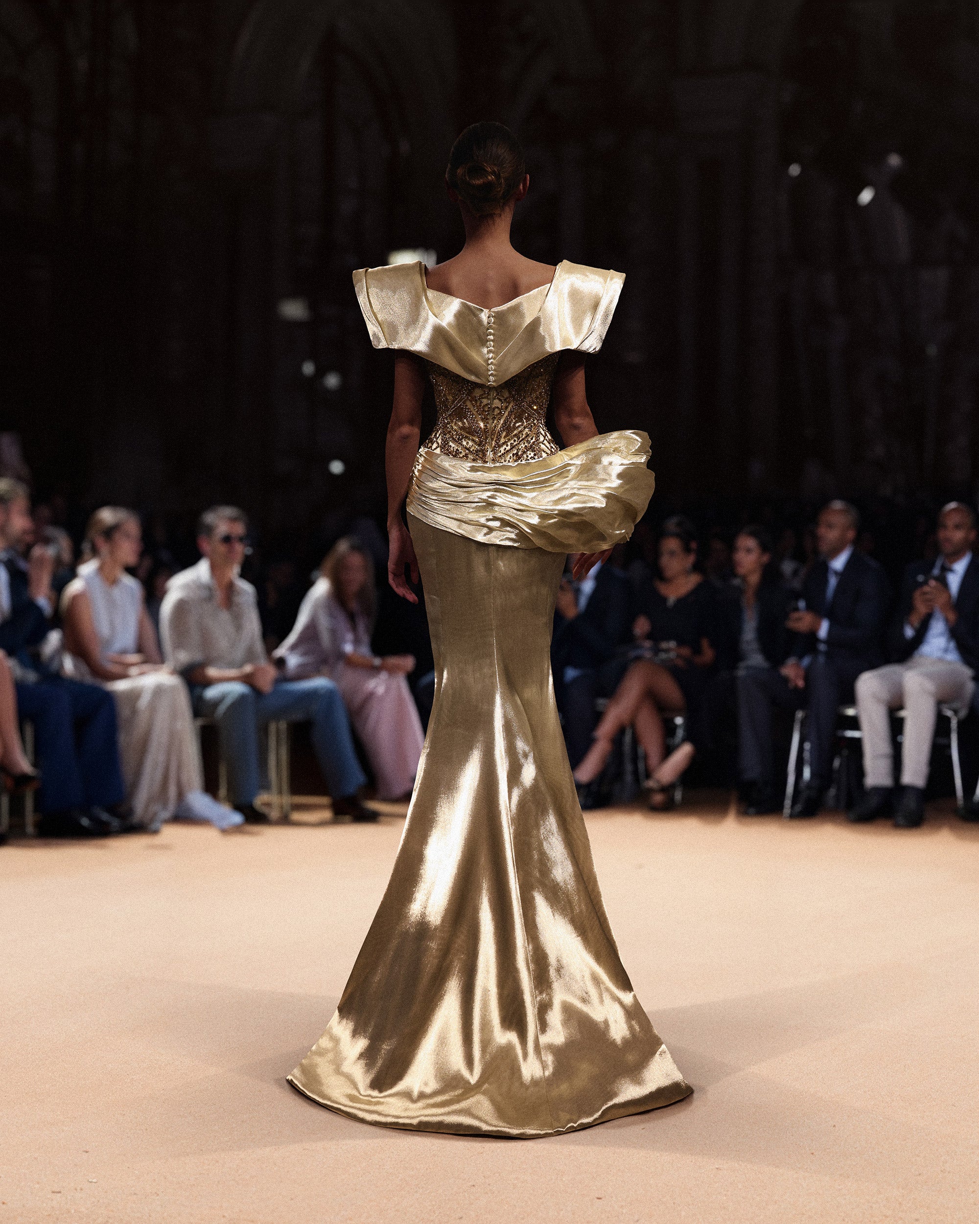 نقدم لكِ فستان الجزار المزين بالذهب الفاتح والمزخرف بالذهب الفاتح من جزار الجزار المزين بالخرز والكريستال الذهبي الفاتح، والذي يتميز بتصميم منسدل جميل عند خط الورك وصدرية أنيقة مكشوفة الكتفين. يظهر الصدر بتطريزات معقدة مزينة بالخرز البرونزي والذهبي الفاتح والكريستال الذهبي الفاتح الذي يضفي لمسة من الفخامة.