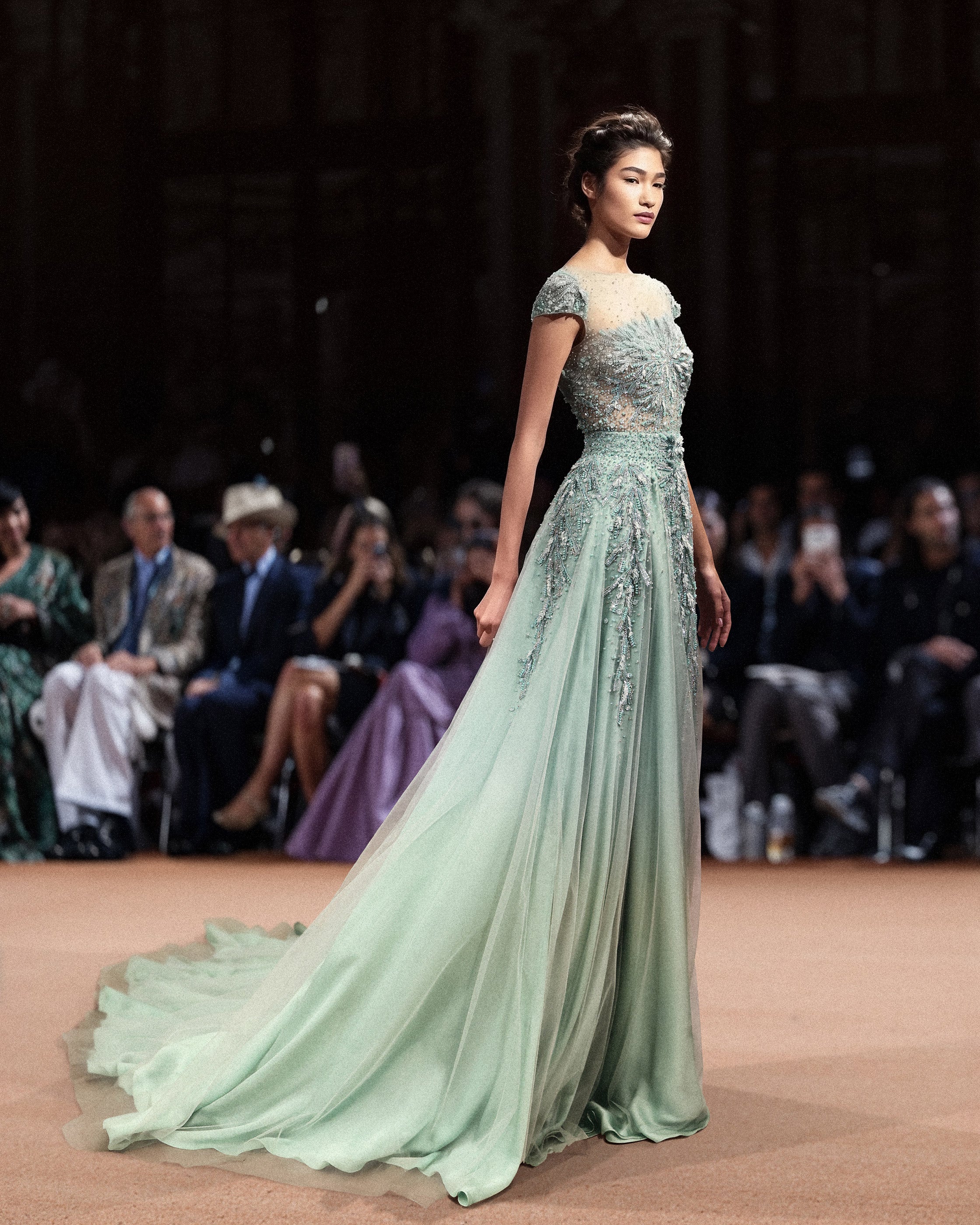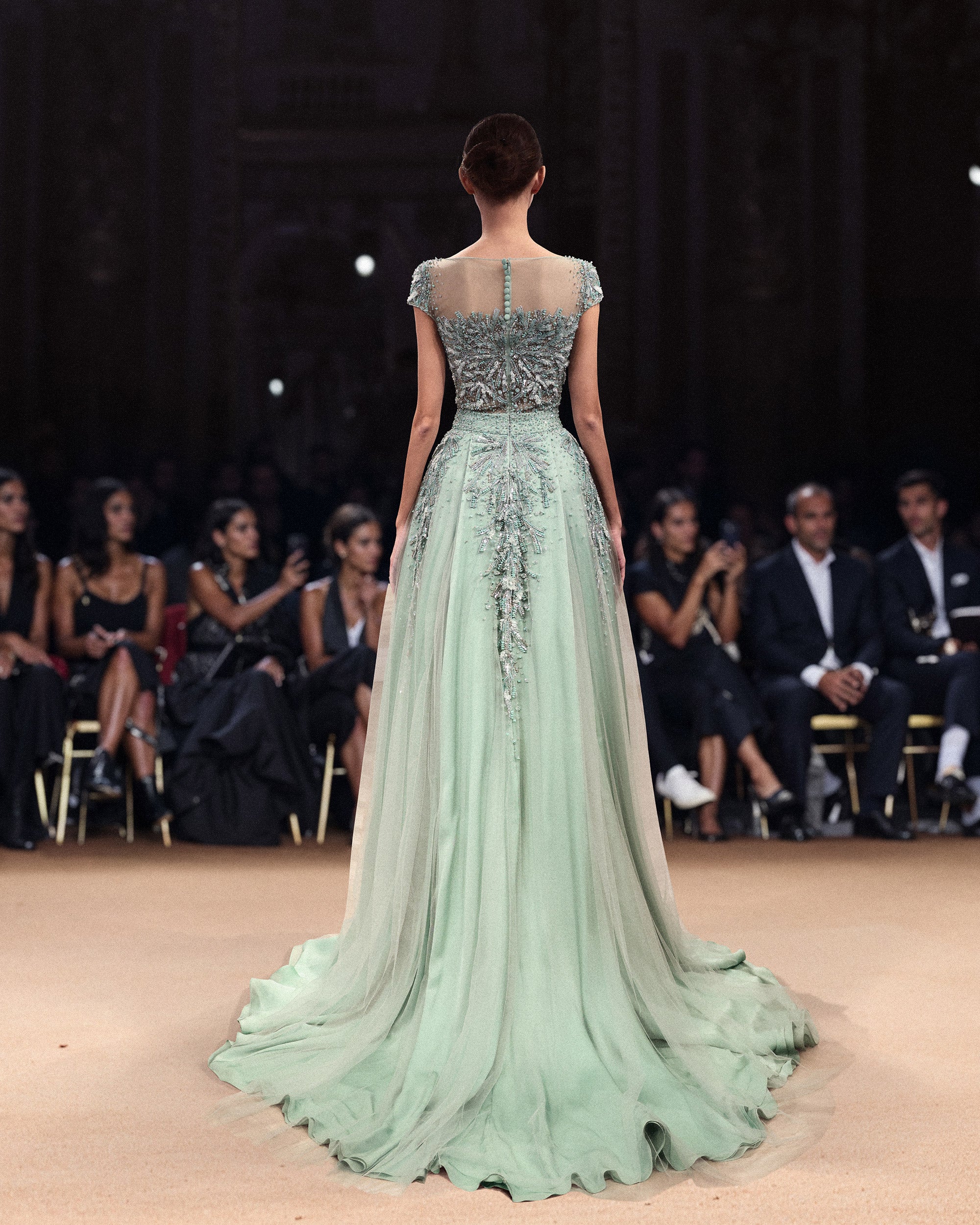 صُنع الفستان من ساتان الموسلين الفاخر، ويتميز بانسيابية انسيابية ناعمة تتحرك برشاقة مع كل خطوة. تضيف إضافة خرز الوسابي المتلألئ والترتر المتلألئ في جميع أنحاء التطريز بريقًا آسرًا يلفت الأنظار ويزيد من سحر الفستان بشكل عام.
