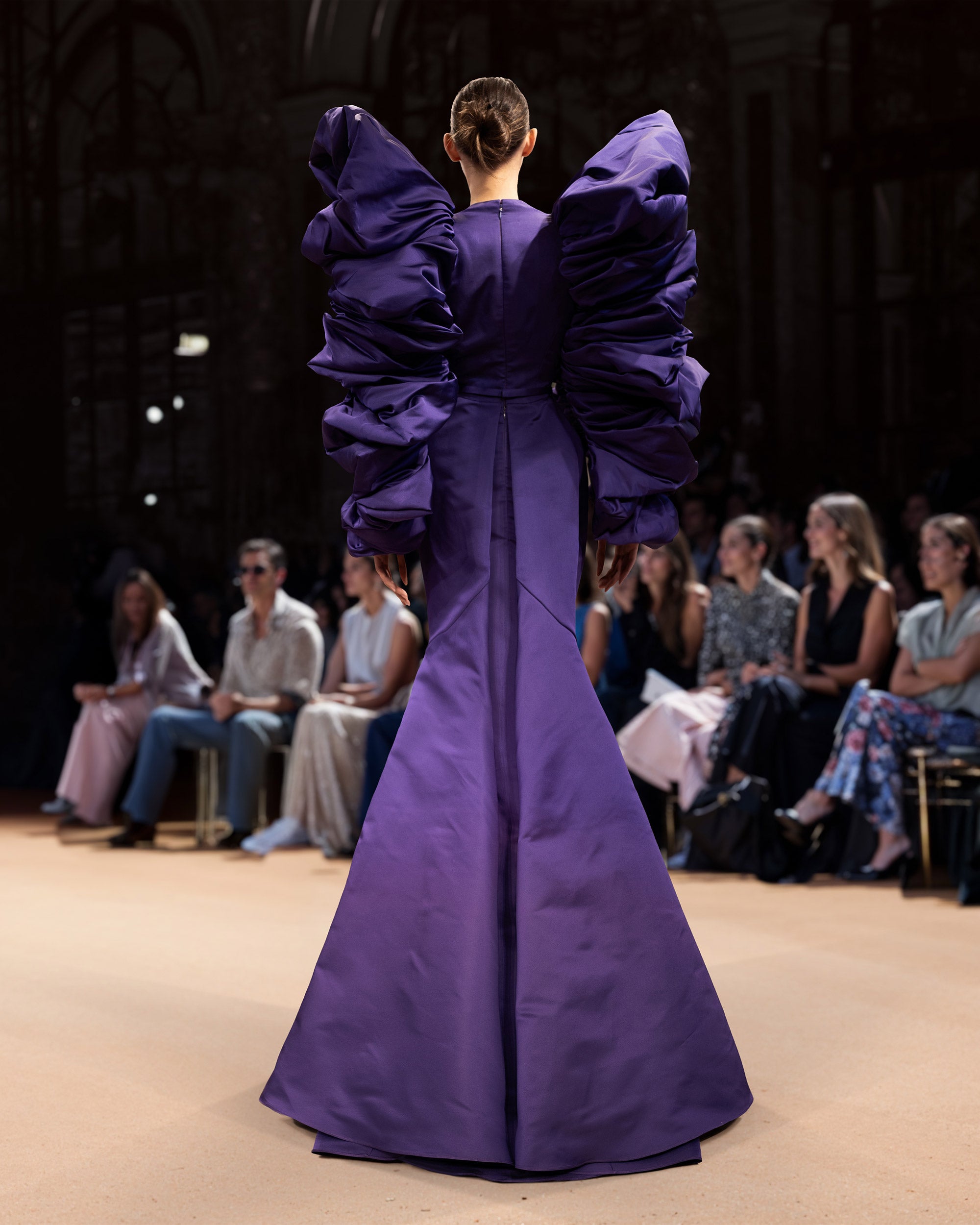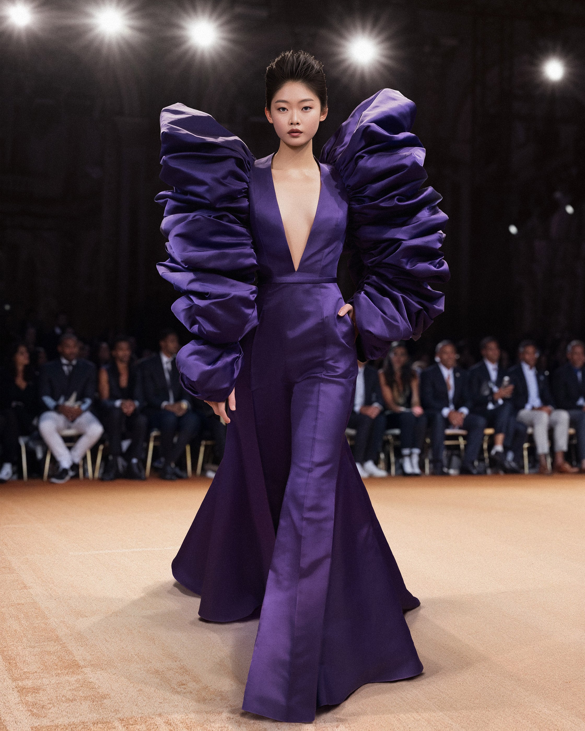 الميزة البارزة في هذه البدلة هي أكمامها المنسدلة الفخمة التي تضفي لمسة من الأناقة.