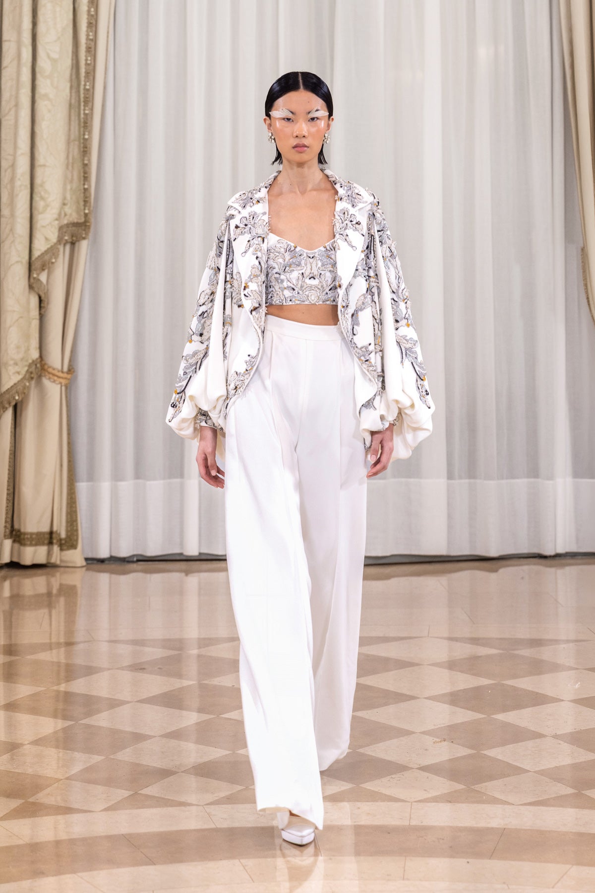 تألقي بأناقة راقية مع طقمنا المطرز من الكريب بيكيه باللون الأبيض المائل للرمادي، والمكون من سترة وصدريّة وسروال واسع. تتميز المجموعة بقصتها الانسيابية، حيث يتدلى البنطال بشكل مستقيم وطويل، وتضفي السترة حجماً ناعماً بفضل أكمامها المنفوشة والمجمعة بلطف. تم تنفيذ التطريز بمزيج أنيق من درجات اللون الفضي والذهبي الناعم والأسود الفاحم والأزرق المعدني، بشكل متناسق على السترة والصدرية. تتكشف الزخارف المستوحاة من النباتات من خلال منحنيات متطابقة وخطوط متعرجة وزخارف مزخرفة، مصنوعة من خيوط معدنية وخرز دقيق. يحدد الخرز الدقيق والخيوط المعدنية كل شكل.