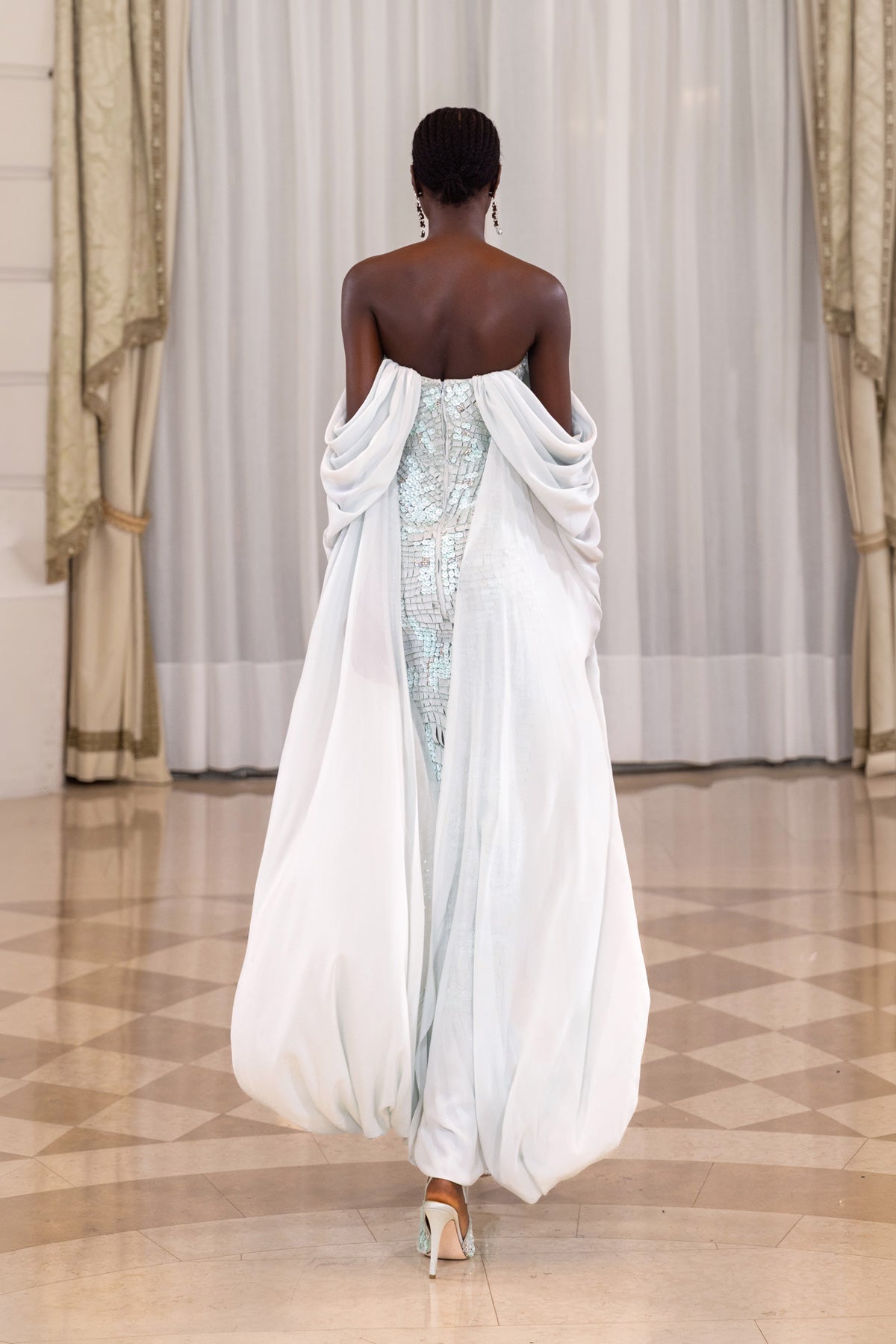 تألقي بأناقة راقية مع فستاننا المصنوع من الجلد المدبوغ المطرز باللون الأزرق الفاتح مع درابيه من الكريب جورجيت. هذا الفستان بدون أكمام مصنوع من قاعدة مطرزة بالكامل تجمع بين الجلد المدبوغ الناعم والزخارف المعقدة بالخرز باللون الأزرق الفاتح. تشكل الزخارف سطحًا عضويًا يشبه الفسيفساء، حيث تتداخل صفوف من الخرز المستدير والأجزاء الخطية لتشكل أنماطًا انسيابية تحدد معالم الجسم عموديًا. يتميز الفستان بغطاء من الكريب جورجيت المتدفق باللون الأزرق الفاتح المطابق، يتدفق من خط العنق والجوانب ليخلق مظهرًا انسيابيًا يشبه الرداء.