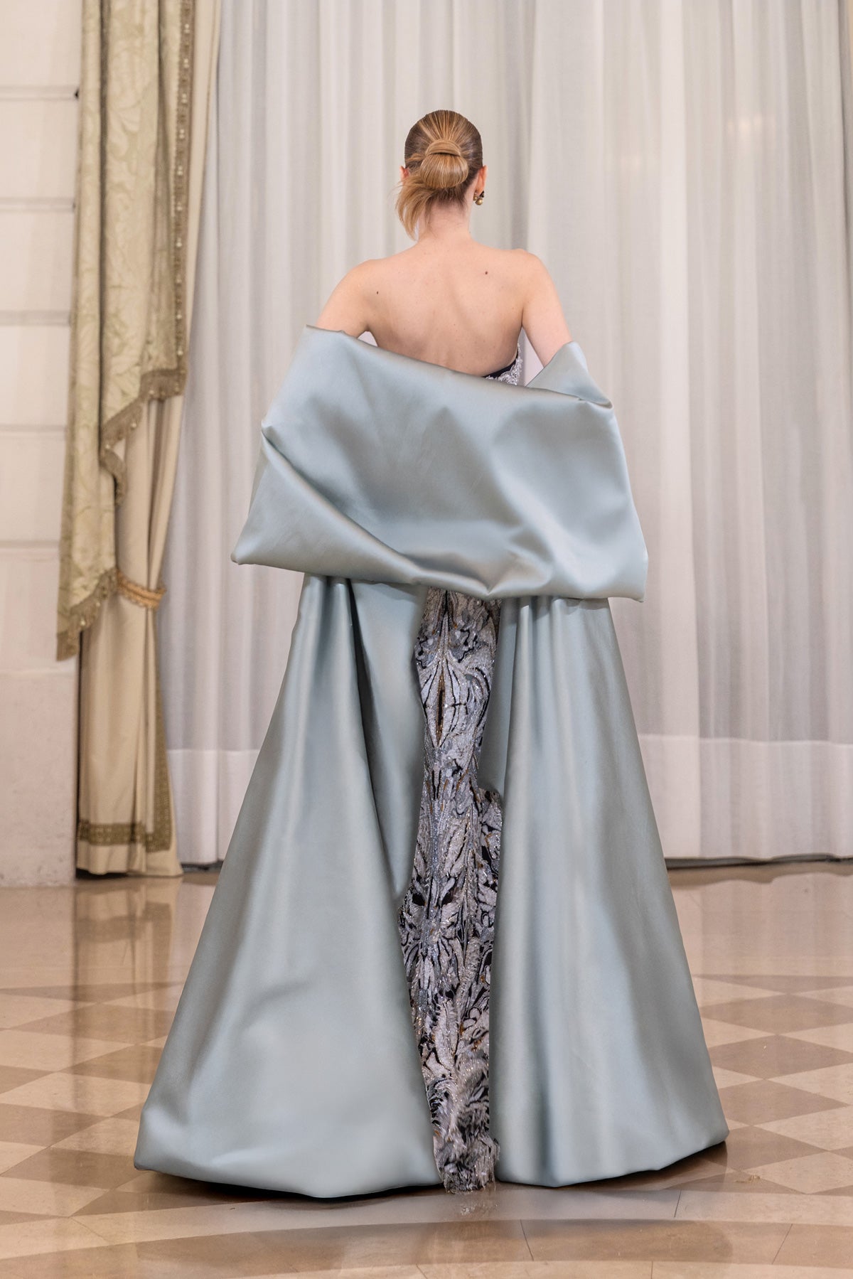 تألقي بأناقة راقية مع فستاننا المطرز باللون الأزرق الفاتح مع رداء ميكادو. الفستان بدون أكمام مطرز بالكامل بألوان متدرجة من الأزرق الفاتح والفضي والعاجي الناعم، مع لمسات خفيفة من اللون الذهبي الباهت المنسوج في جميع أنحاء التصميم. تشكل الزخارف الكثيفة من الخرز والترتر زخارف متدفقة تشبه الأوراق، محددة بخيوط معدنية داكنة ومرتبة في تركيبات متناظرة تمتد عموديًا على طول الجسم. يكتمل المظهر بغطاء ميكادو باللون الأزرق الفاتح المطابق، ملفوف على الكتفين ويمتد إلى ذيل دراماتيكي يحيط بالفستان المطرز من الأمام إلى الخلف.