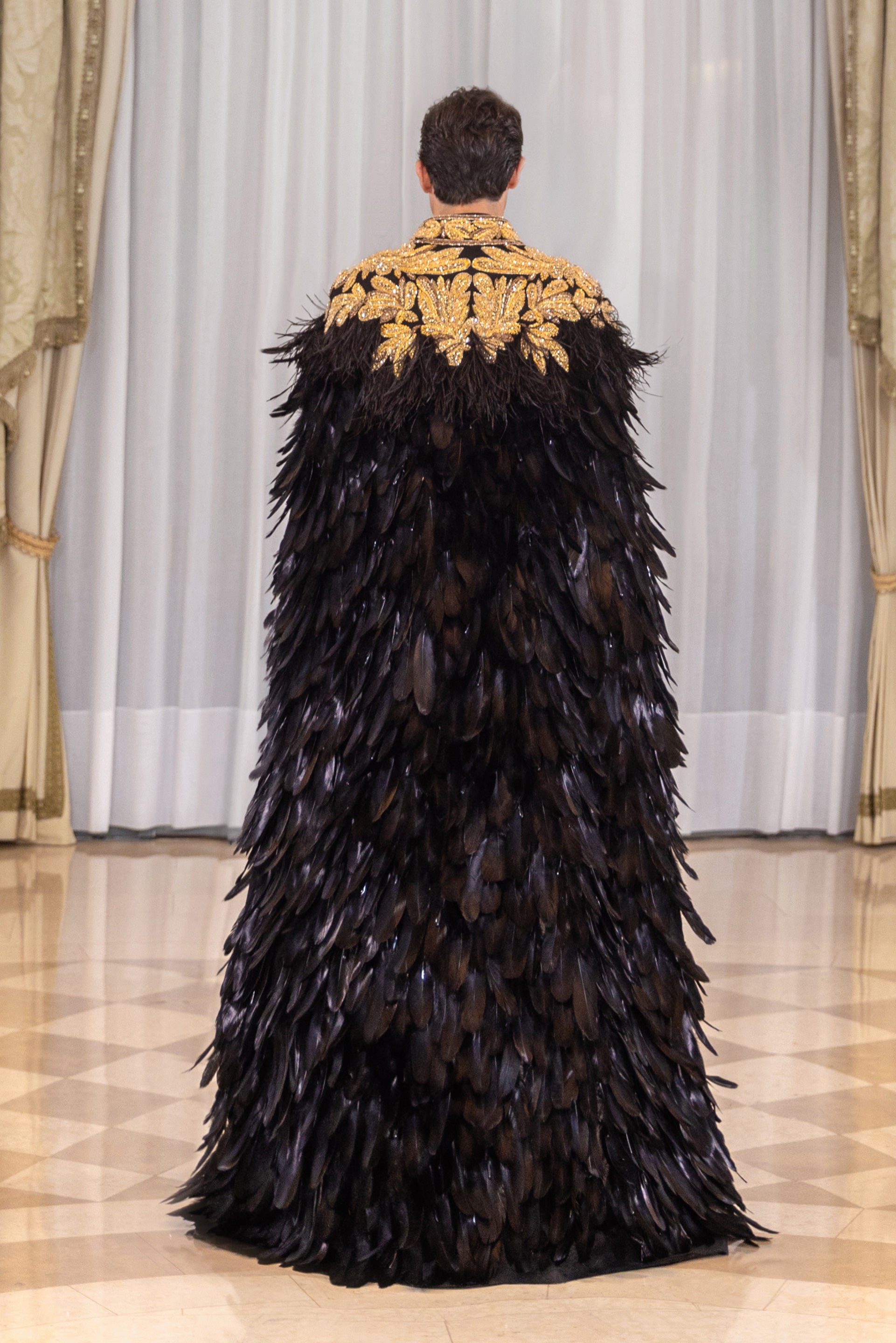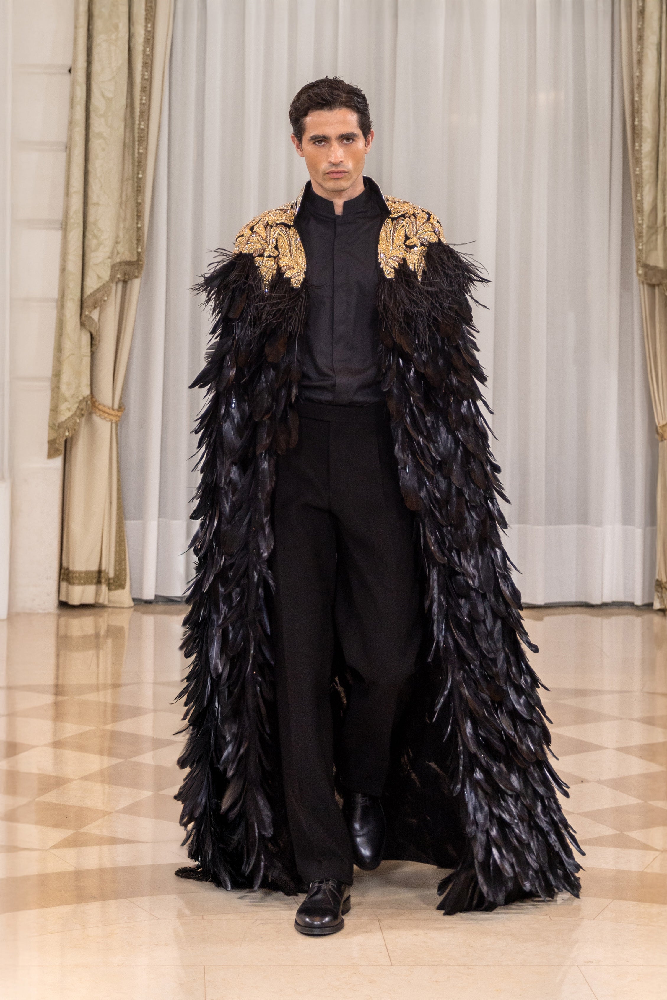 هذا المعطف الطويل مصنوع باللون الأسود الفاحم ومغطى بالكامل بطبقات كثيفة من الريش، مما يخلق نسيجًا غنيًا وحركة سلسة في جميع أنحاء الصورة الظلية. يتركز التطريز الذهبي اليدوي على طول الكتفين وأعلى الظهر، مكونًا زخارف جريئة ومتناسقة تبرز على الخلفية الداكنة. يتدلى المعطف في خط مستقيم وممدود، مع طبقات الريش التي تضيف حجمًا دون صلابة. يحدد التباين بين الريش غير اللامع والتطريز المعدني سطح المعطف. يكتمل المظهر بقميص قطني كلاسيكي باللون الأسود الفاحم وسروال صوف كشمير مصمم خصيصًا.