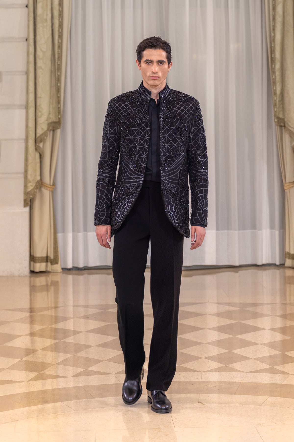 ارتدِ طقمنا المطرز المصمم خصيصًا والذي يتألف من سترة سوداء داكنة وبنطلون مصنوع من شرائط جلدية منظمة ومطرزة يدويًا. تتميز السترة بإطار جلدية هندسية مزينة بتطريز متناسق وزخارف خرزية رقيقة، مما يضفي عمقًا وملمسًا مع الحفاظ على شكل أنيق. تُعزز الخطوط النظيفة والياقة الهيكلية التصميم المخصص. البنطال بسيط، مما يوازن السترة المفصلة. يكتمل المظهر بقميص قطني أسود كحلي بياقة صينية وبنطال من الصوف والكشمير.