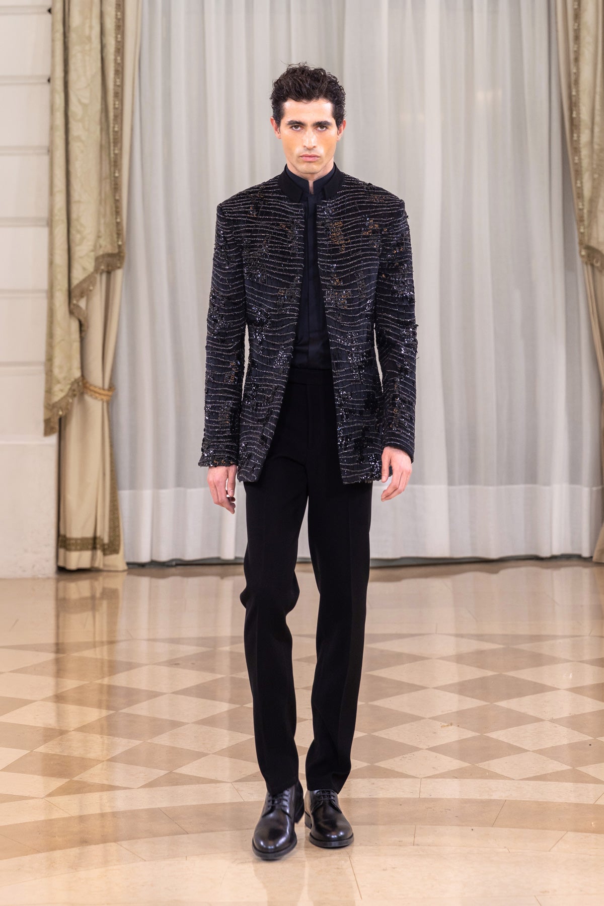 نقدم لكم سترة من الجلد المدبوغ الأسود الفاحم المطرزة بكثافة بزخارف خطية متعددة الطبقات وتفاصيل لامعة دقيقة تشكل نمطًا إيقاعيًا على كامل السطح. تتبع الزخارف خطوط الجسم، مما يضيف عمقًا وأبعادًا مع الحفاظ على اللمسة النهائية المتناسقة. يتميز التصميم الهيكلي بكتفين حادتين وفتحة أمامية أنيقة. يكتمل المظهر بقميص قطني أسود فاحم بياقة صينية وسروال من الصوف والكشمير.