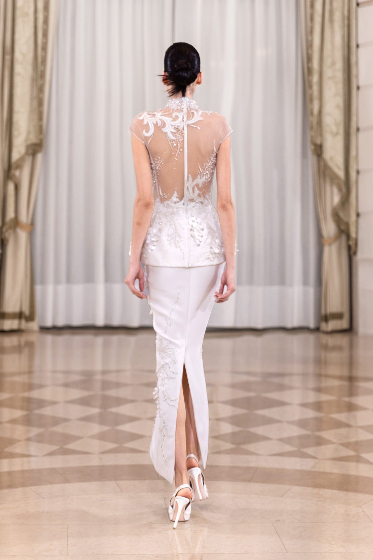 تألقي بأناقة راقية مع هذا الفستان المطرز باللون الأبيض المائل للكريمي، والمصنوع من قماش سكوبا عتيق وتول مطرز. يتميز الجسم الضيق بأكمام شفافة رقيقة وبيبلوم منحوت يحدد الخصر ببنية أنيقة. يتدفق التطريز اليدوي بخيوط وخرزات متناسقة الألوان عبر الجسم وال تنورة، معززًا بتطريزات زهرية ثلاثية الأبعاد، بينما تطيل التنورة المستقيمة الصورة الظلية.