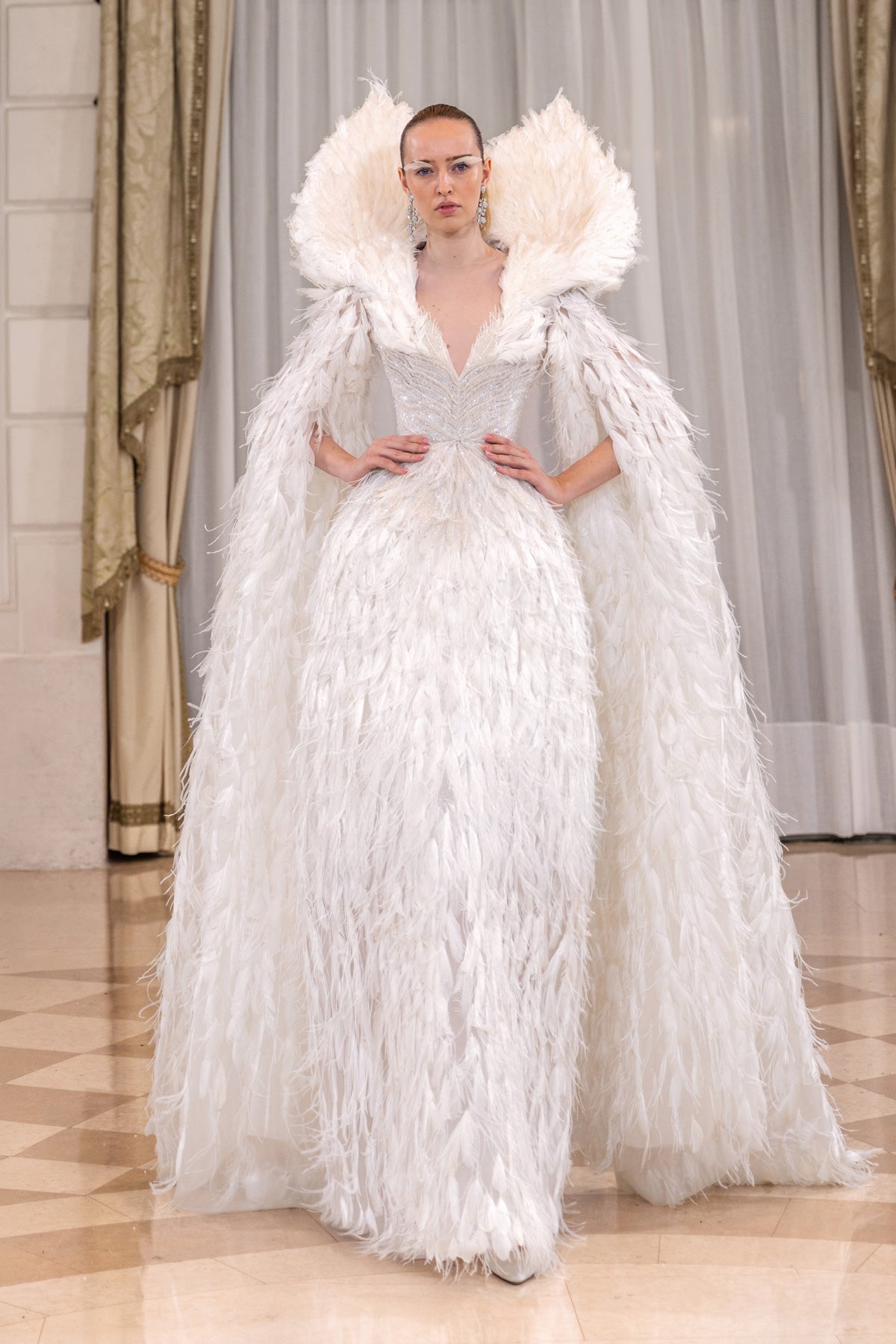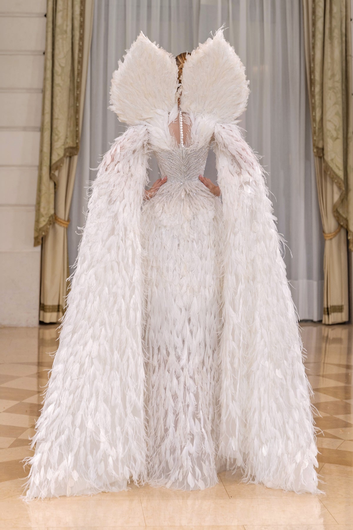 تألقي بأناقة راقية مع هذا الفستان الأبيض المزين بالريش، والذي يتميز بتطريز يدوي كثيف يشكل أنماطًا عضوية متدفقة عبر الصدر. تم ترتيب الخرزات والترتر الدقيق بدقة، مما يخلق نقوشًا خفية وبريقًا ناعمًا يتماشى مع المنحنيات الطبيعية للجذع. ترتفع الزخارف المزينة بالريش من كلا الكتفين، وتحيط بخط العنق بحضور منحوت يوازن بين القوة والرقة. يتحول التطريز تدريجياً إلى التنورة، متشابكاً مع الريش. ترتفع الزخارف المتناظرة المزينة بالريش من كلا الكتفين، وتحيط بخط العنق.