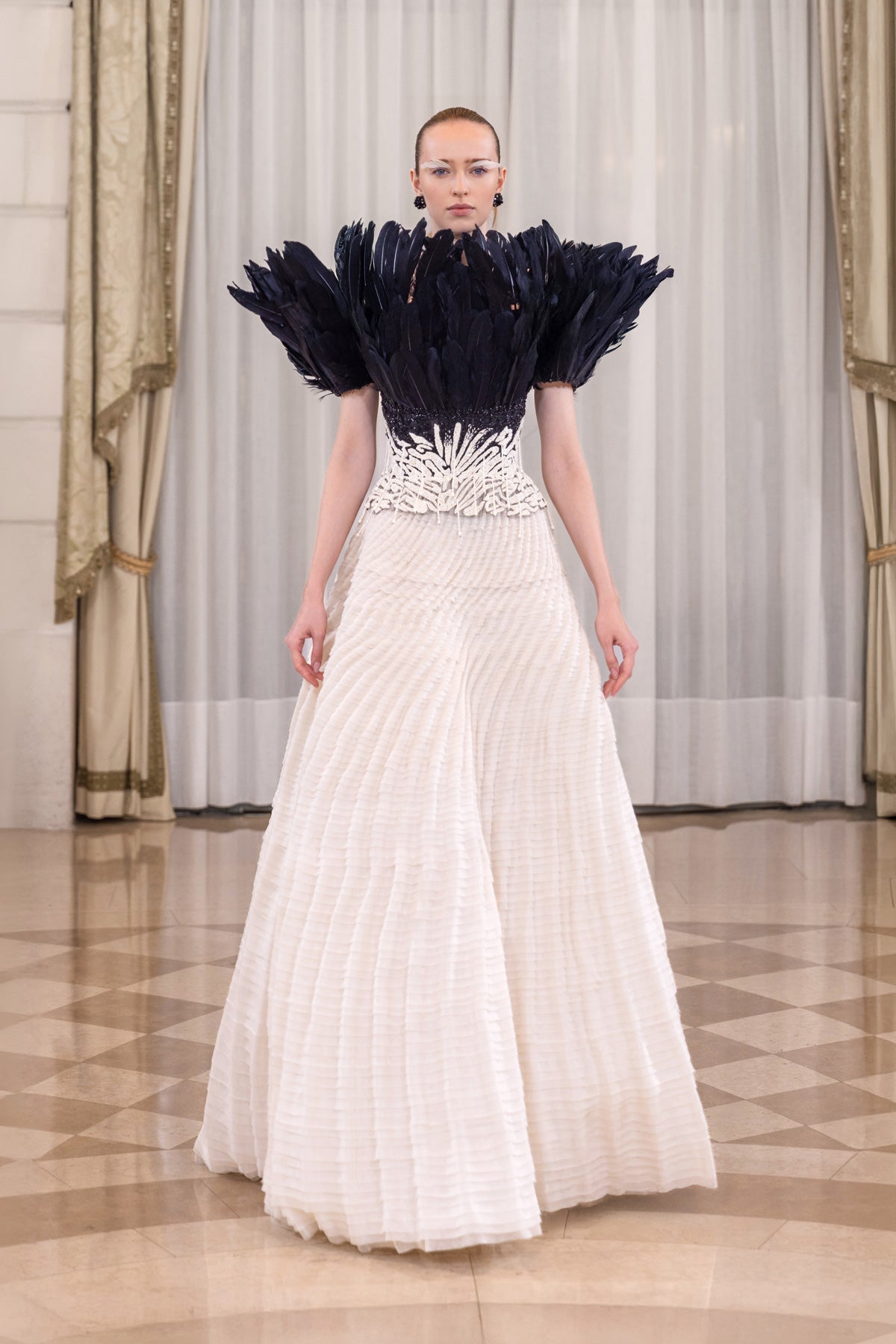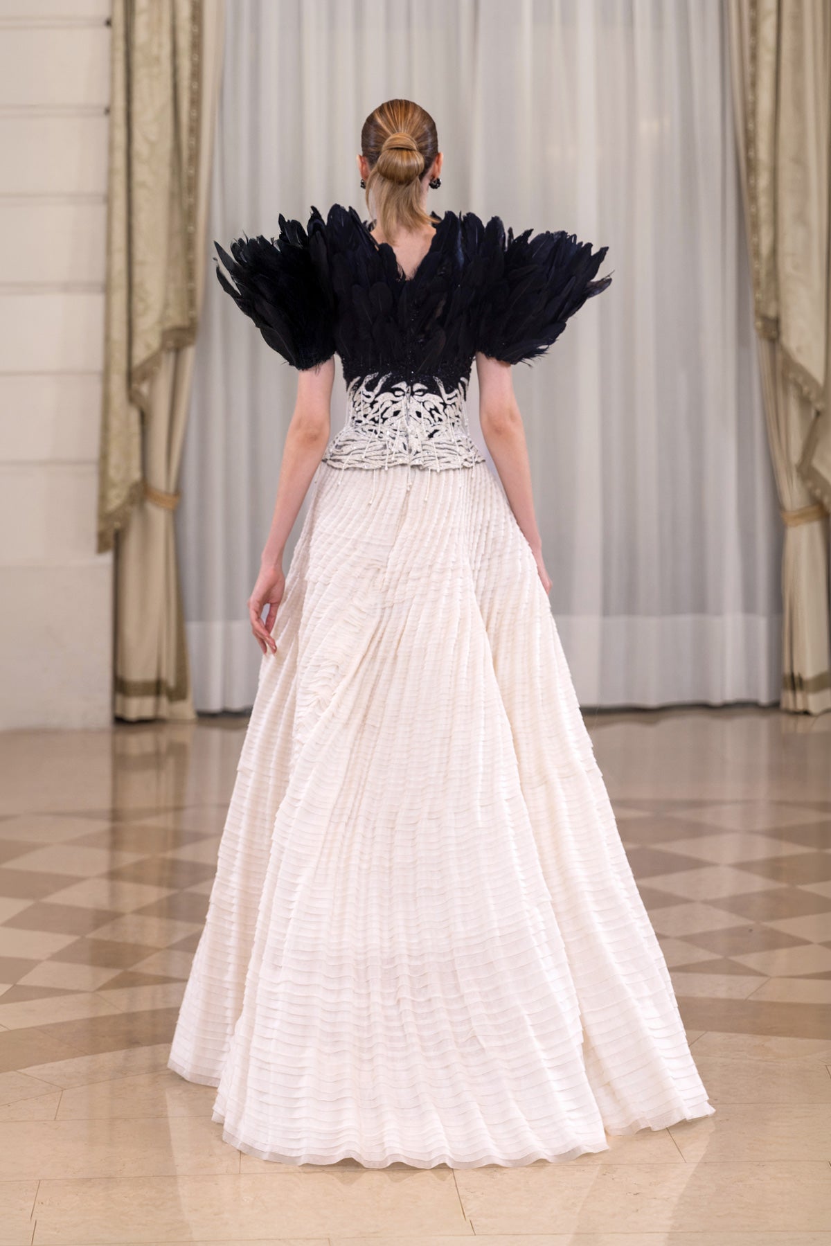 تألقي بأناقة راقية مع هذا الفستان المنحوت والمطرز بالريش، والذي يتميز بتطريز يدوي كثيف يشكل زخارف عضوية ممدودة على الصدر. حبات خرزية دقيقة وترتر وخيوط بلون متناسق. ترتفع هياكل من الريش الأسود الفاحم من كلا الكتفين. التنورة مصنوعة من قماش أبيض مائل للصفرة مرتب في نمط طيات متواصل يشبه الموجة. تضفي التموجات الأفقية حجماً وحركة ناعمة، وتتسع تدريجياً نحو الحافة لتشكل صورة ظلية انسيابية وممدودة.
