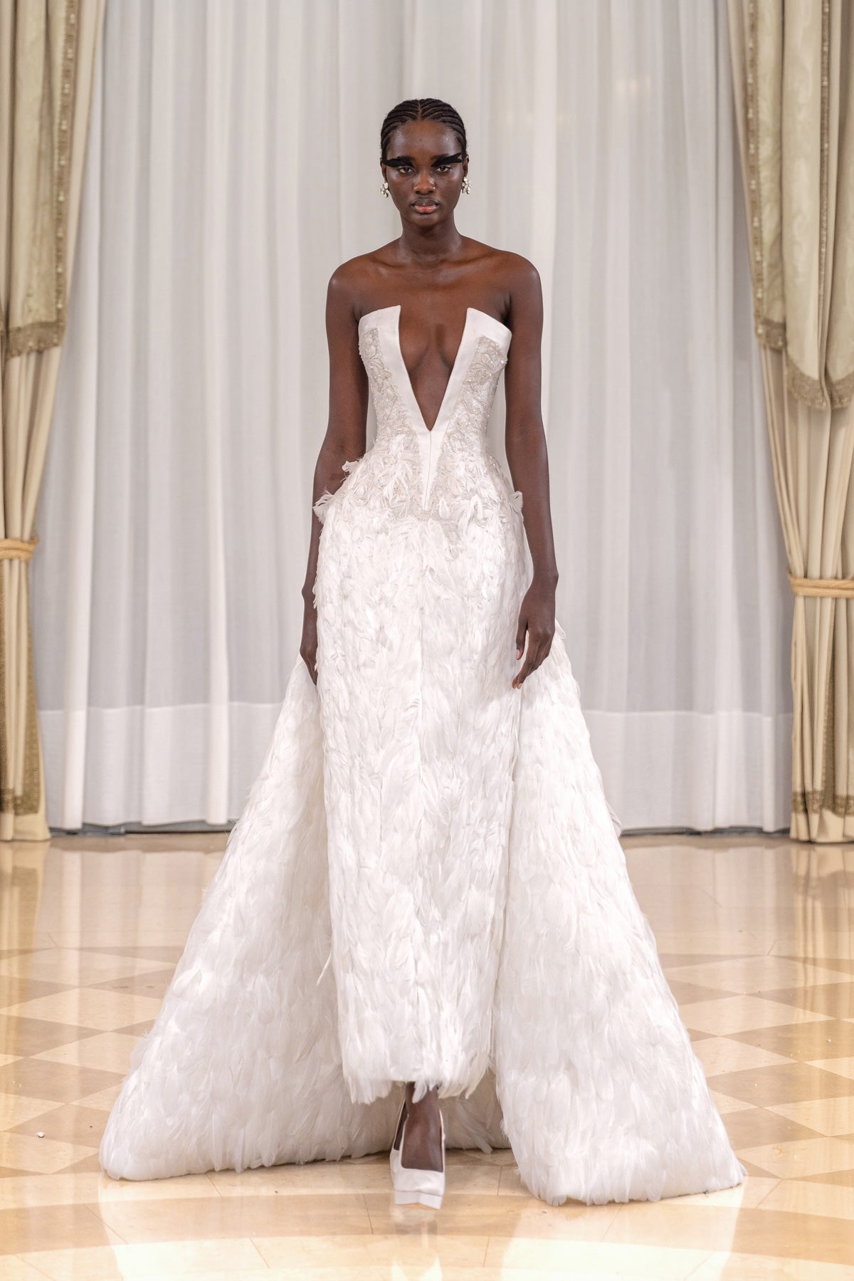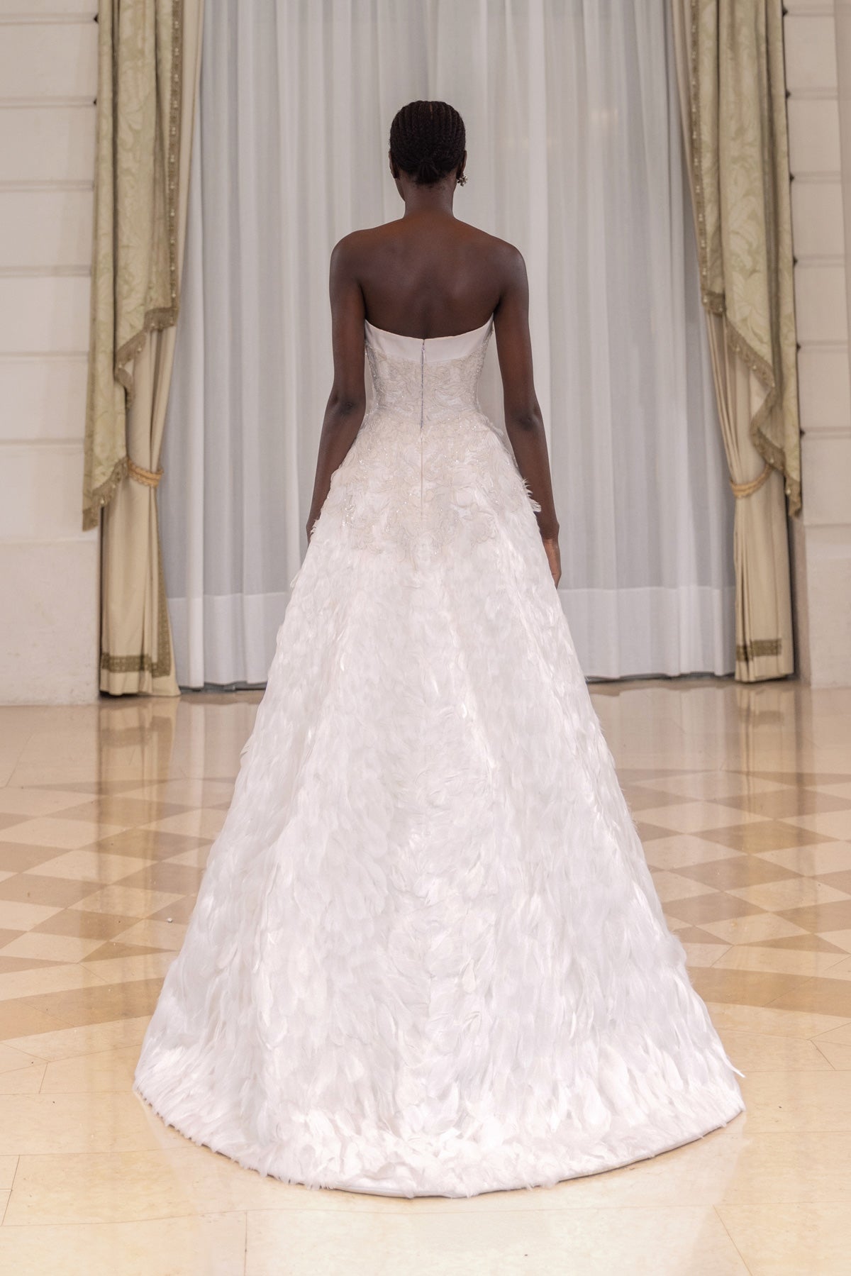 تألقي بأناقة راقية مع هذا الفستان المزين بالريش الأبيض المائل للصفرة، والذي يتميز بصدّار مشدود منحوت وخطوط دراماتيكية طويلة تصل إلى الأرض. صُنع الصدّار بقاعدة منظمة، وهو مصمم ليتناسب مع شكل الجذع، ويتميز بخطوط حادة تنعمها الزخارف الدقيقة على السطح. الجزء السفلي مزين بالكامل بريش أبيض مائل للصفرة، تم وضعه بدقة لخلق حجم غني وعمق وحركة سلسة. يتدرج تطريز الريش تدريجياً من الخصر إلى الأسفل، مكوناً نسيجاً كثيفاً.