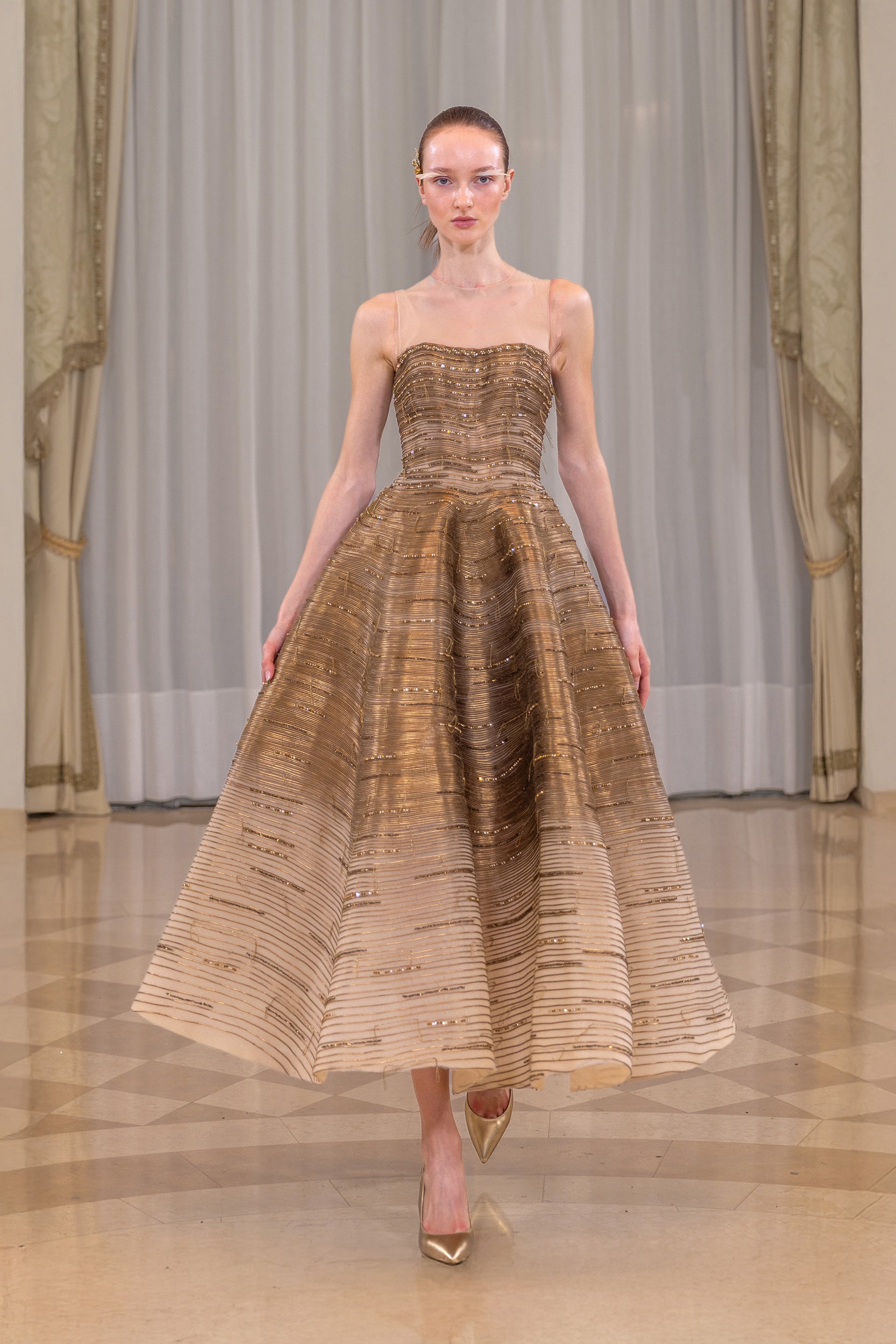 نقدم لكم فستاننا المطرز بالكامل. يتميز الجزء العلوي من الفستان بتصميمه الهيكلي والمطرز بالكامل يدوياً بخطوط أفقية كثيفة من الخرزات والترتر الذهبي المعدني، مما يخلق سطحاً غنياً بطبقات متعددة مع لمعان خفيف. تنفتح التنورة على شكل واسع وكامل، وتستمر التطريزات التي تزداد كثافة عبر الجزء العلوي من الفستان لتحدد الخصر، ثم تتدفق بسلاسة إلى التنورة.