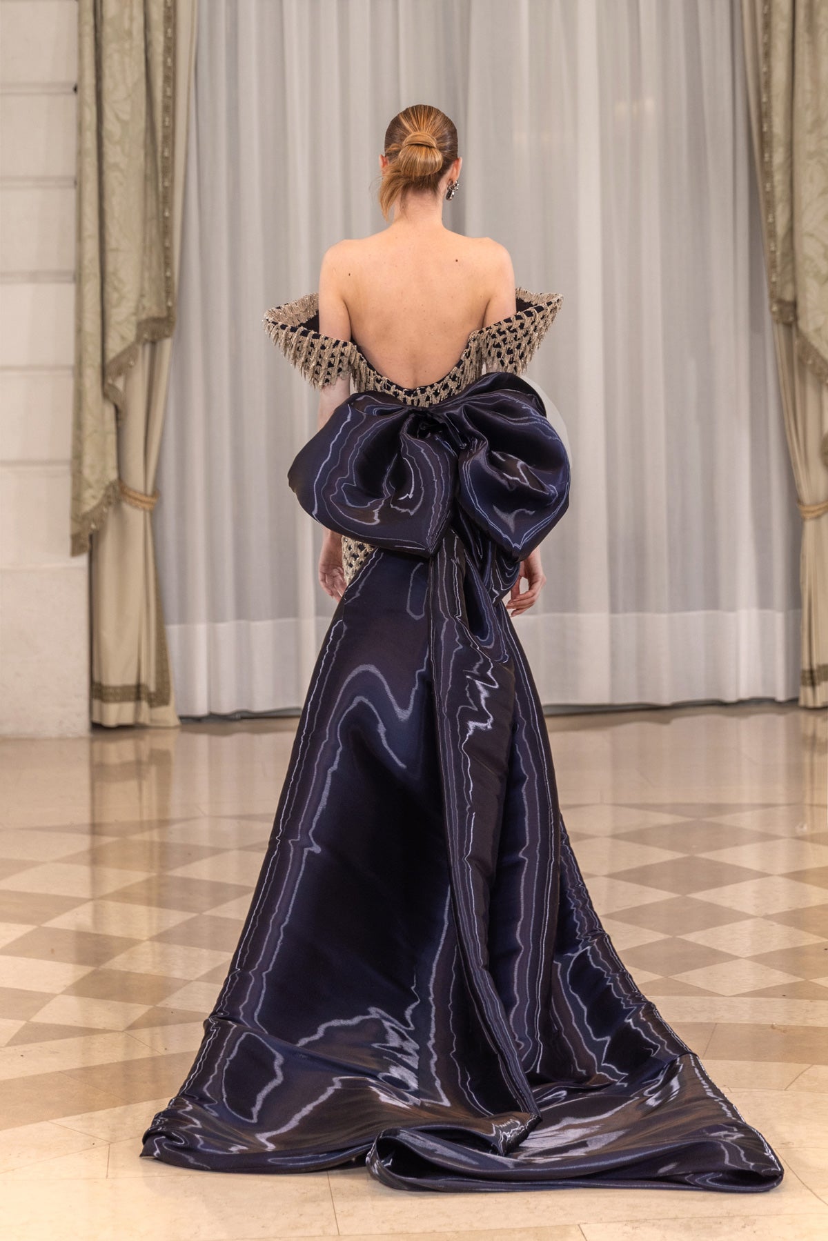 هذا الفستان المطرز بالكامل مع فيونكة زرقاء داكنة مصنوع من قماش كثيف، حيث تشكل الزخارف المترابطة من الخرز نمطًا متكررًا على كامل التصميم. يجمع التطريز بين اللون العاجي واللون الشمبانيا الفاتح واللون الذهبي الخافت، مع طبقات من الخرز الشفاف والترتر الصغير الذي يضفي عمقًا وتغيرًا لامعًا خفيفًا تحت الضوء. يكتمل المظهر بفيونكة كبيرة الحجم في الخلف، مصنوعة من قماش أزرق داكن لامع. تنسدل الفيونكة على شكل ذيل، وتتميز سطحها المرن بانعكاسات عضوية تشبه الأمواج.