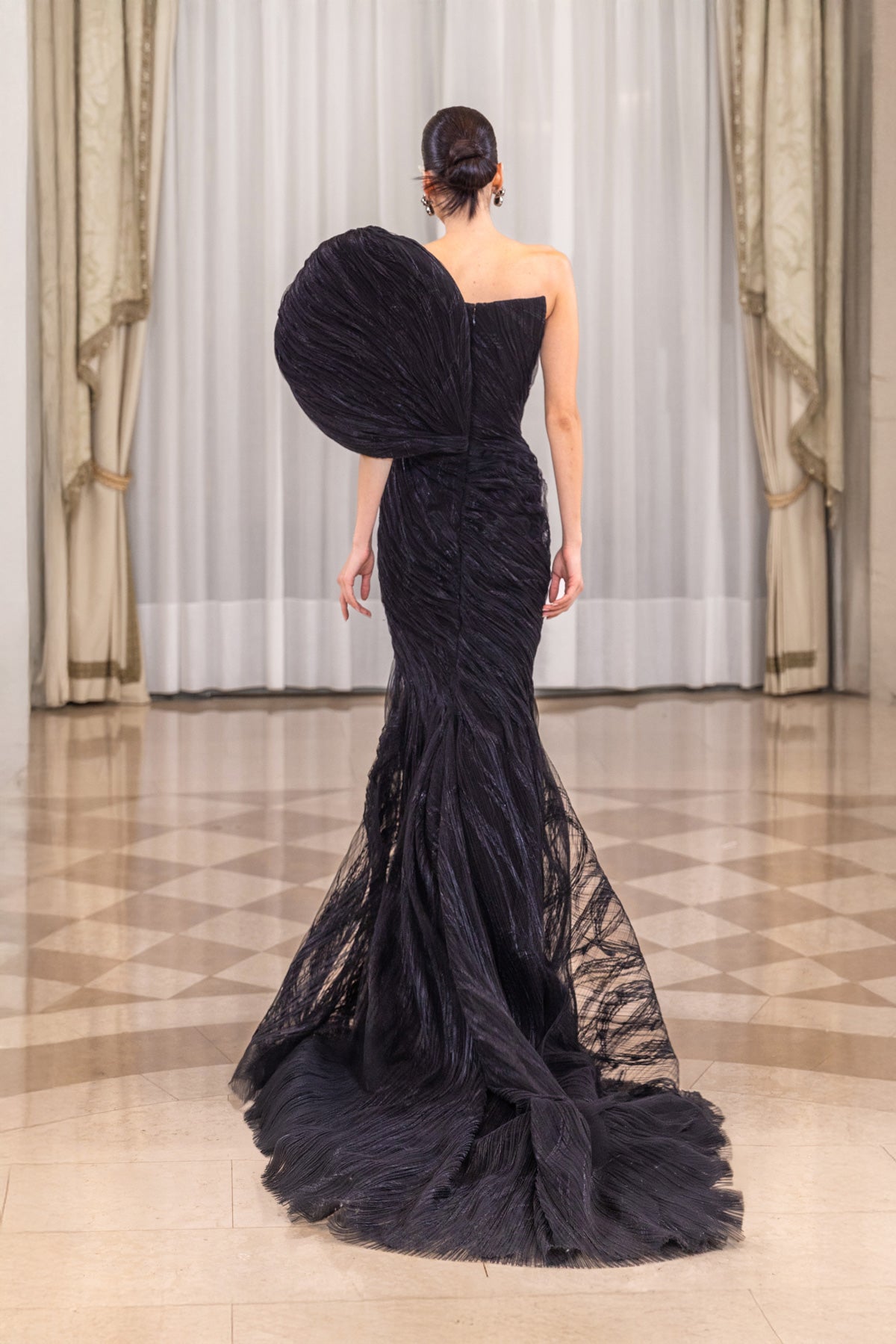 هذا الفستان الأسود الفاحم المصنوع من التول المطوي بدقة والمعالج بطبقة نهائية من الطلاء، يخلق تباينًا لونيًا دقيقًا على السطح. تلتف الطيات القطرية بشكل غير متماثل حول الصدر، لتشكل ثنية منظمة تحدد شكل الجذع وتبرز الخصر. تم قص خط العنق بشكل غير متماثل، ليكشف عن كتف واحد بينما يمتد الجانب المقابل إلى عنصر كتف منحوت وواسع مصنوع من طيات متعددة الطبقات. يتحول الشكل العلوي الملائم إلى تنورة واسعة، حيث تتحرر الطيات تدريجياً لتخلق حركة وحافة ناعمة متدلية.