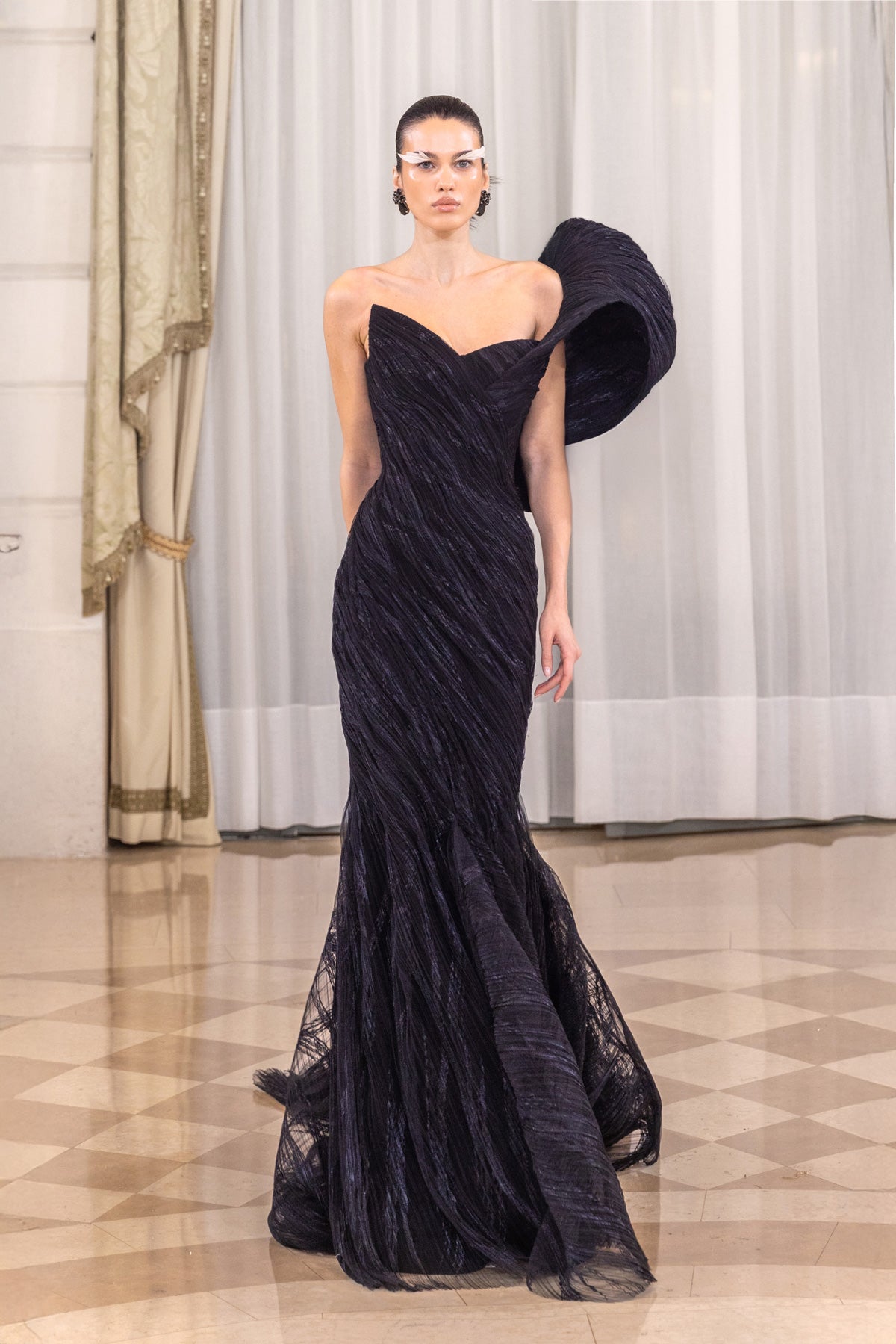 هذا الفستان الأسود الفاحم المصنوع من التول المطوي بدقة والمعالج بطبقة نهائية من الطلاء، يخلق تباينًا لونيًا دقيقًا على السطح. تلتف الطيات القطرية بشكل غير متماثل حول الصدر، لتشكل ثنية منظمة تحدد شكل الجذع وتبرز الخصر. تم قص خط العنق بشكل غير متماثل، ليكشف عن كتف واحد بينما يمتد الجانب المقابل إلى عنصر كتف منحوت وواسع مصنوع من طيات متعددة الطبقات. يتحول الشكل العلوي الملائم إلى تنورة واسعة، حيث تتحرر الطيات تدريجياً لتخلق حركة وحافة ناعمة متدلية.