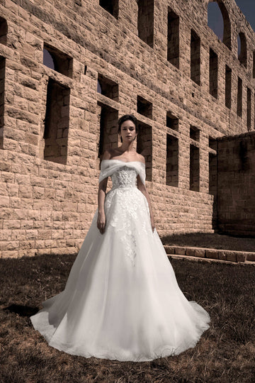فستان رومنسي باللون العاجي يتميز بتقويرة مكشوفة الأكتاف مع أكمام من التل المنسدل بنعومة. يتميز الصدر الضيّق بتطريزات غنية بزخارف زهور تجريدية معقدة تنساب بسلاسة إلى تنورة من التل بطبقات وذيل أنيق. تكتمل الإطلالة مع طرحة متناسقة بطول 3.25 أمتار مزينة بتطريزات متدرجة. يقترن مع طرحة متناسقة بطول 3.25 متر.