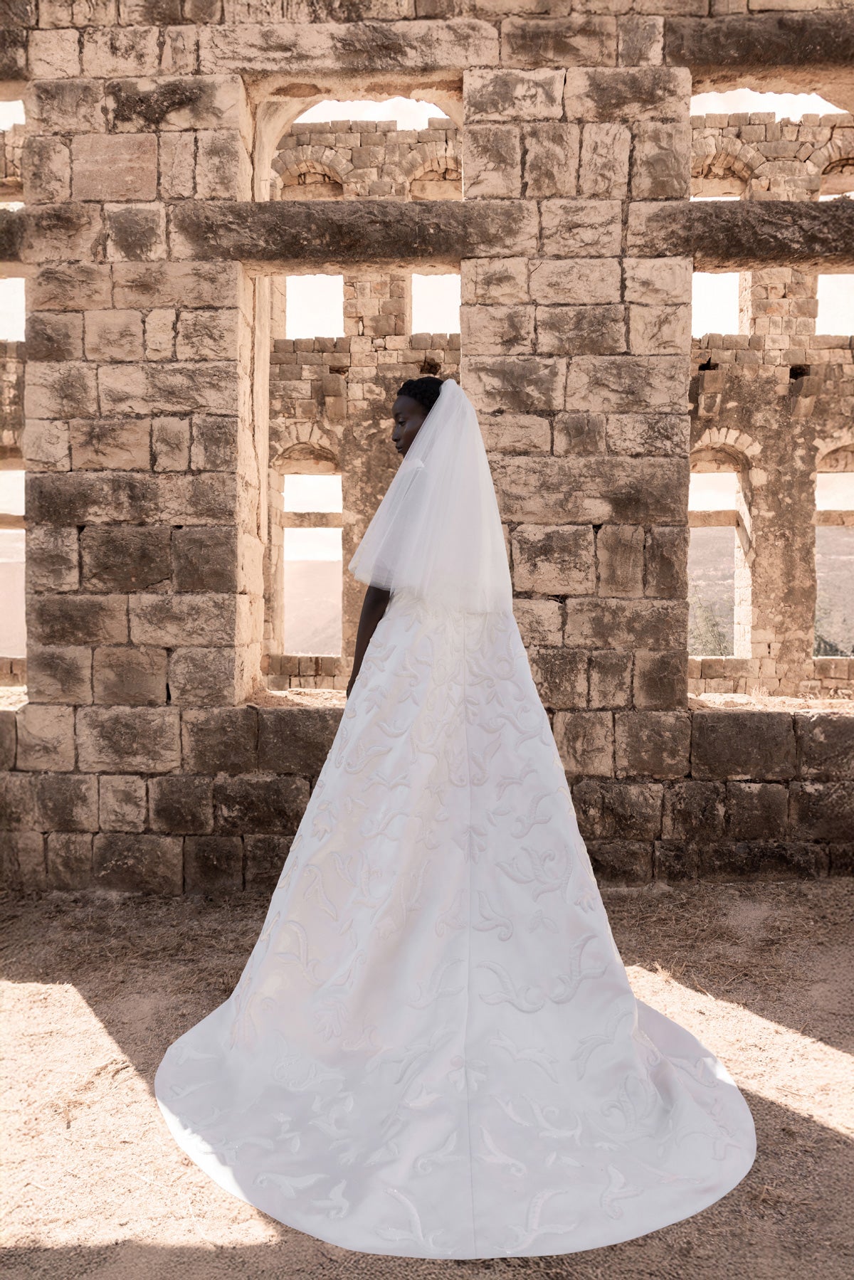 فستان ميكادو أنيق باللون العاجي يتميز بتقويرة مربعة منظمة وقصّة أنيقة وضيّقة تنساب إلى ذيل خلفي مثير مطرّز يدويًا بتطريزات ساتان بارزة على شكل عضوي. تم تحديد الزخارف المعقدة لأوراق الشجر والزخارف الدائرية بدقة في خيوط بيضاء متدرجة اللون، مما يضيف عمقًا وأبعادًا للفستان.