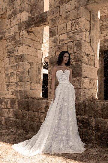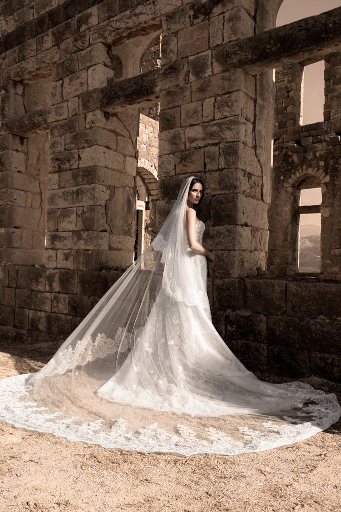 فستان أنيق باللون العاجي يتميز بتقويرة على شكل قلب جميل ومطرّز بدقة مع الدانتيل وتفاصيل رقيقة من الترتر. تنساب التطريزات بسلاسة إلى التنورة الناعمة ذات الشكل الهرمي وتمتد إلى ذيل أنيق في الخلف. تكتمل الإطلالة مع طرحة متناسقة بطول 3.25 أمتار مزينة بتطريزات الدانتيل المزخرفة.