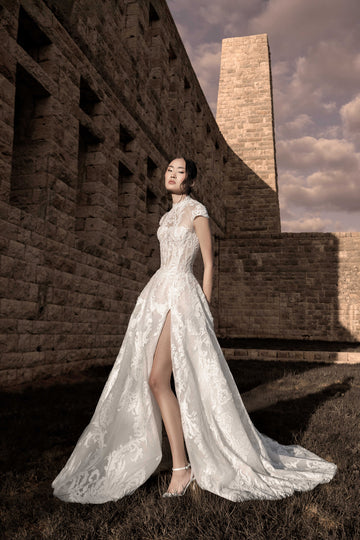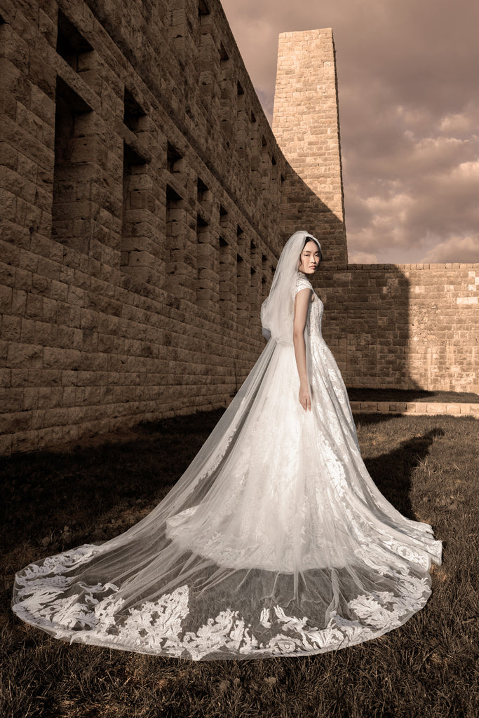 فستان عاجي ساحر من التل العاجي مطرز بتصميم معقد ينساب بسلاسة في جميع الأنحاء. تتزين التقويرة المنسدلة بالخيوط والخرز والترتر الذي ينسدل على التنورة. يكتمل المظهر مع طرحة متناسقة بطول 3.25 مترًا مثبتة في الجزء الخلفي من الفستان. تتميز التنورة بفتحة لإضفاء مزيد من الجاذبية.