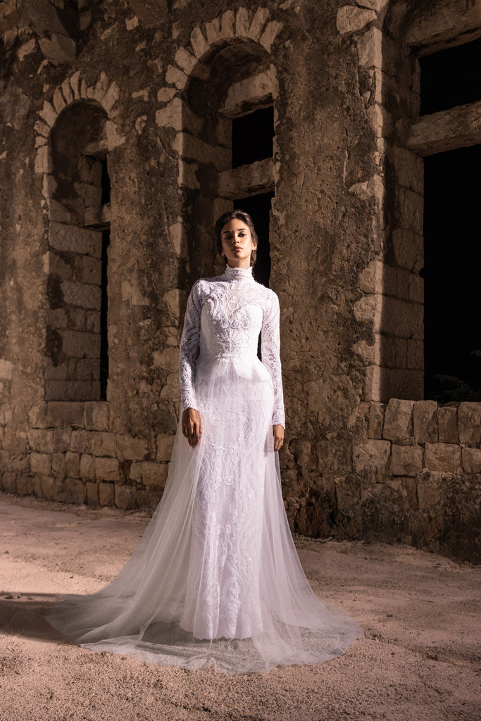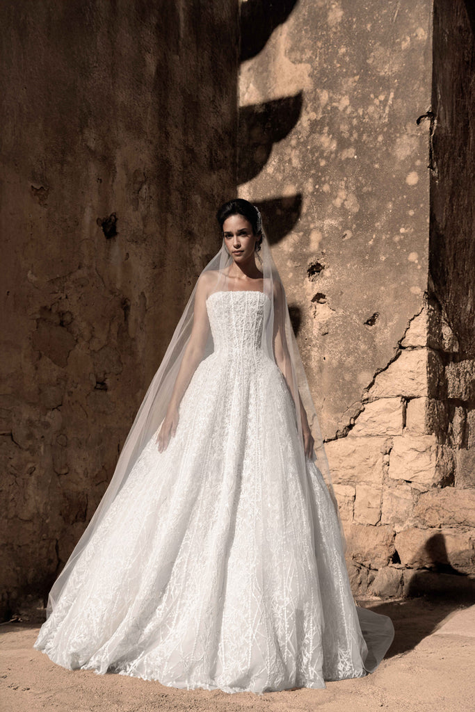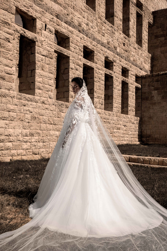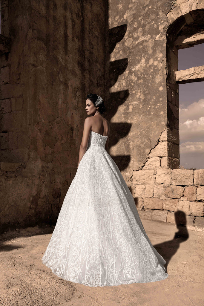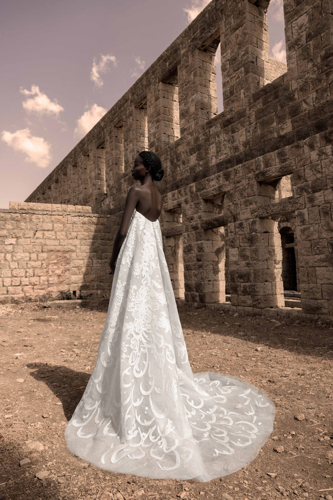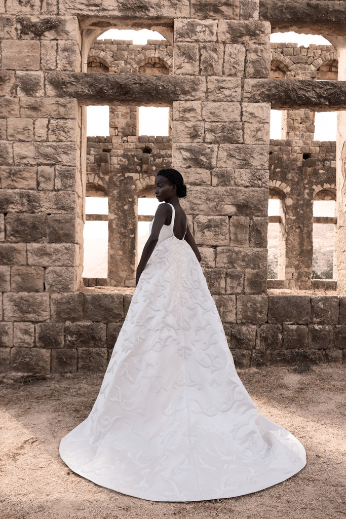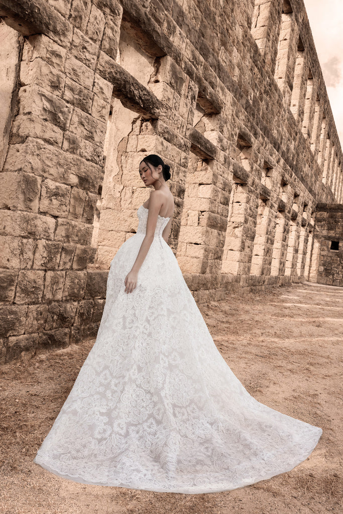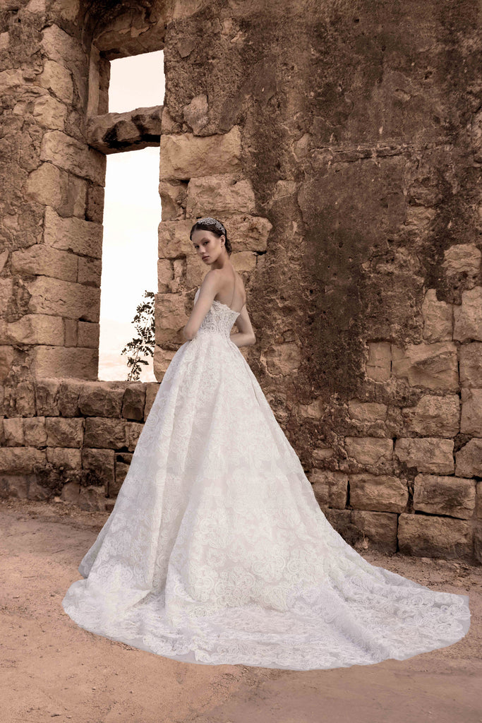 فستان عاجي خالٍ من الزمن مصنوع من التول الرافيا، ويتميز بصدّار منظم بدون حمالات وتنورة ضخمة بجيوب. تمتد التنورة العلوية ذات الطبقات إلى ذيل واسع، مزينة بزخارف الدانتيل الغنية بالزخارف ومزينة بطرحة متناسقة بطول 3.25 أمتار.