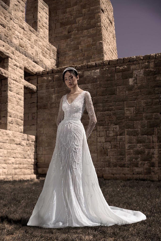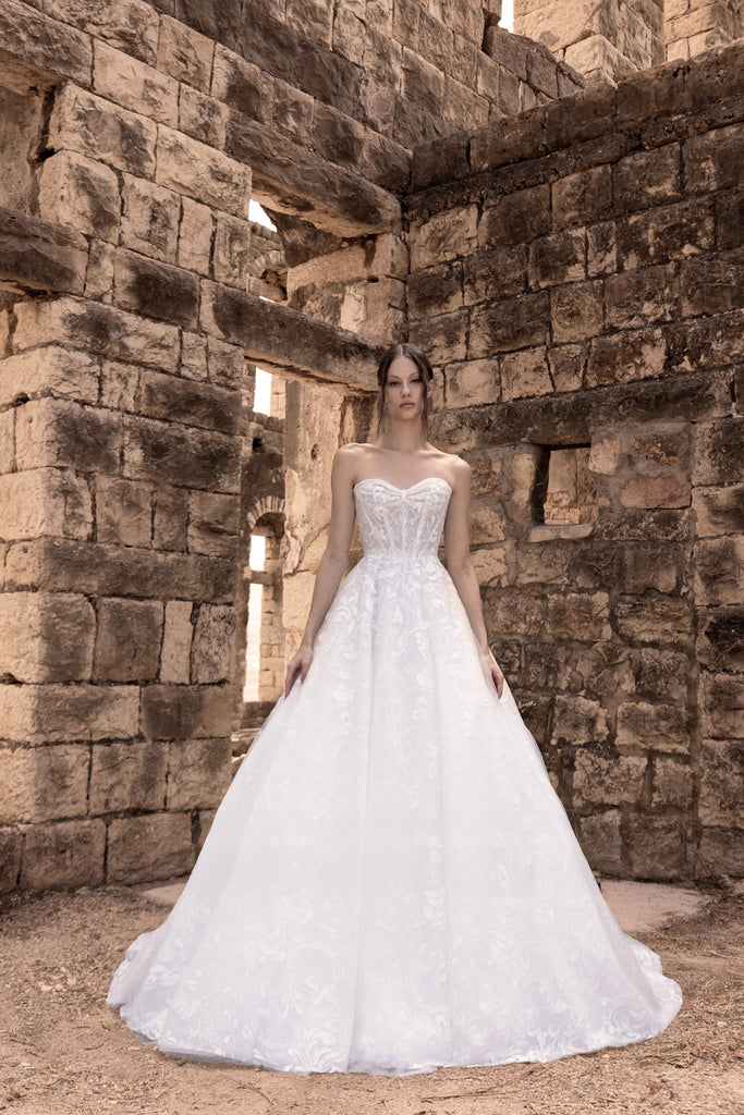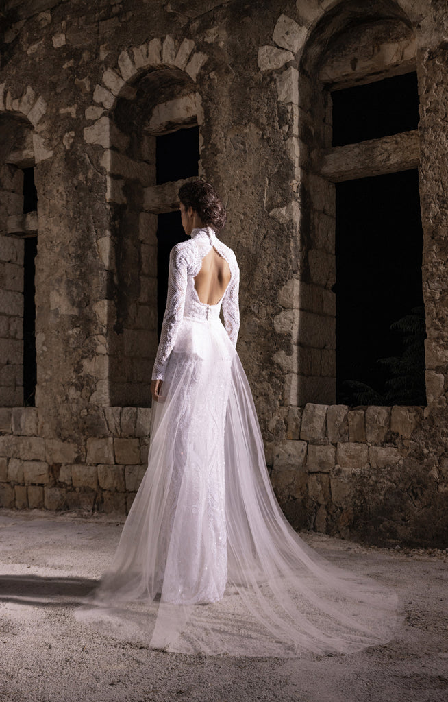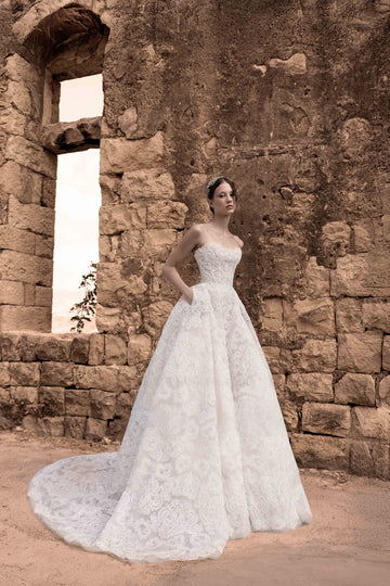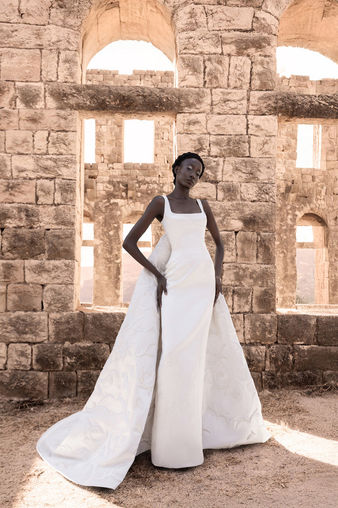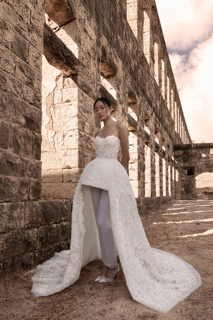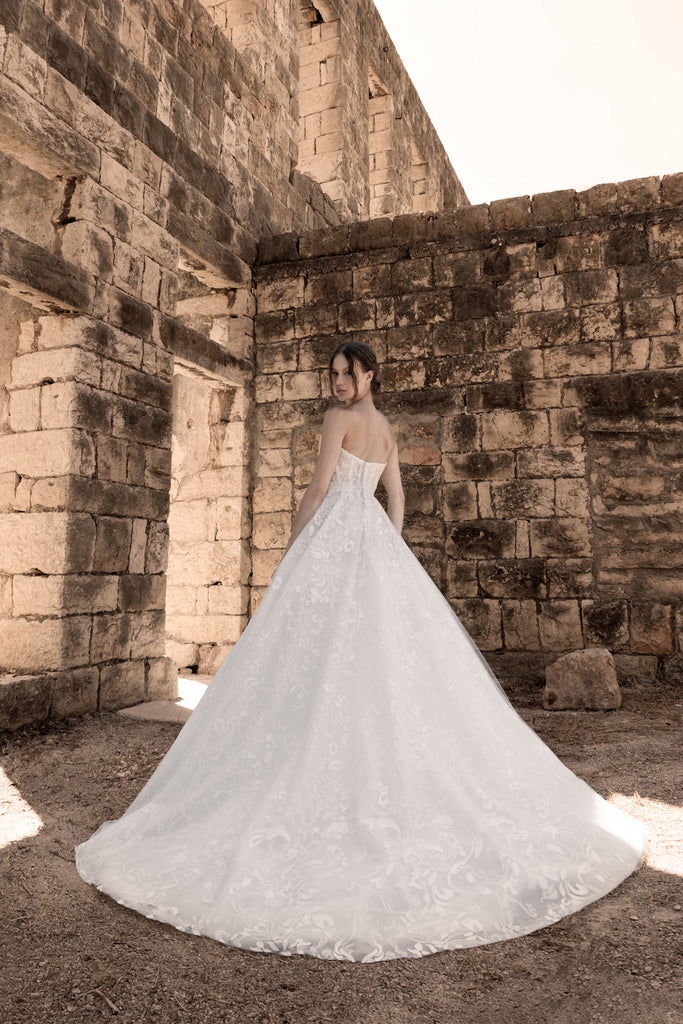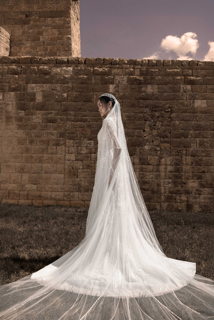 فستان عاجي خالٍ من الزمن مصنوع من التول الرافيا، ويتميز بصدّار منظم بدون حمالات وتنورة ضخمة بجيوب. تمتد التنورة العلوية ذات الطبقات إلى ذيل واسع، مزينة بزخارف الدانتيل الغنية بالزخارف ومزينة بطرحة متناسقة بطول 3.25 أمتار.