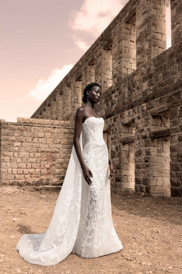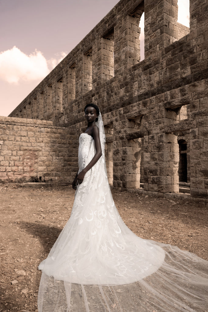فستان عاجي مع صدّار ضيّق من دون حمالات بقصّة ضيّقة بدون حمالات ومطرّز بتطريزات غنية مع تصميم معقّد ينسدل إلى التنورة. من أعلى الظهر، يتدلى الكاب الانسيابي برشاقة من أعلى الظهر، مزينًا بلمسات مطرزة متناسقة، ويمتد إلى ذيل واسع. يقترن مع طرحة متناسقة بطول 3.25 متر.