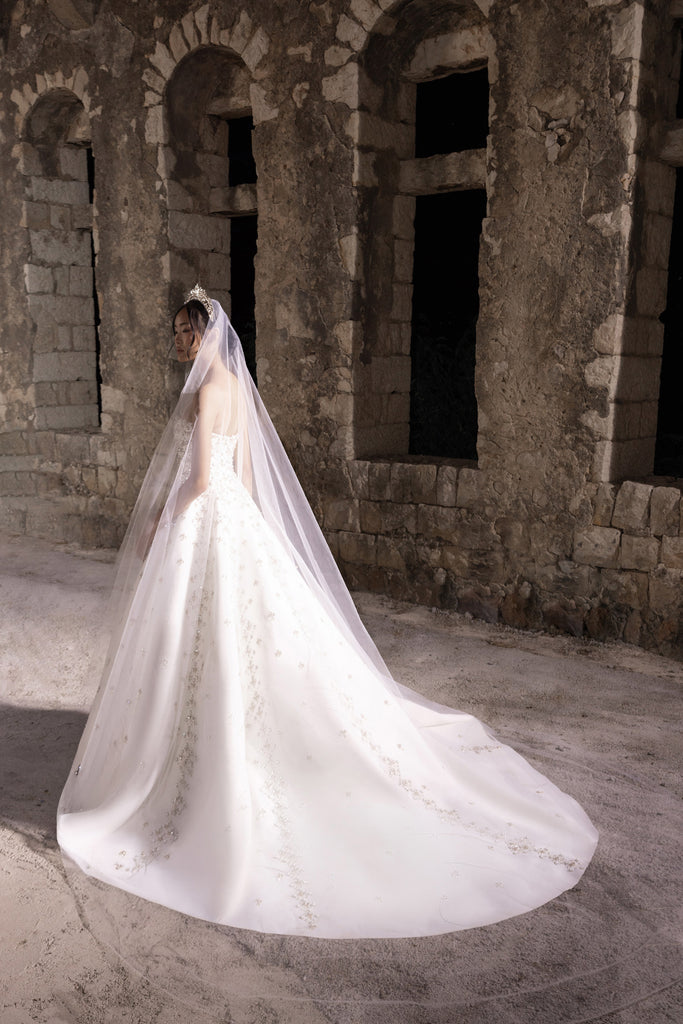 فستان أنيق باللون الأبيض الأوف وايت سكوبا يتميز بتقويرة بدون حمالات وقصّة ضخمة ذات شكل هرمي. الفستان مزيّن بالكامل بتطريزات ذهبية ولؤلؤية معقدة مطرزة يدويًا تتدلى بشكل متناسق على الصدر والتنورة. يترافق مع طرحة من التل السادة بطول 3.25 متر.