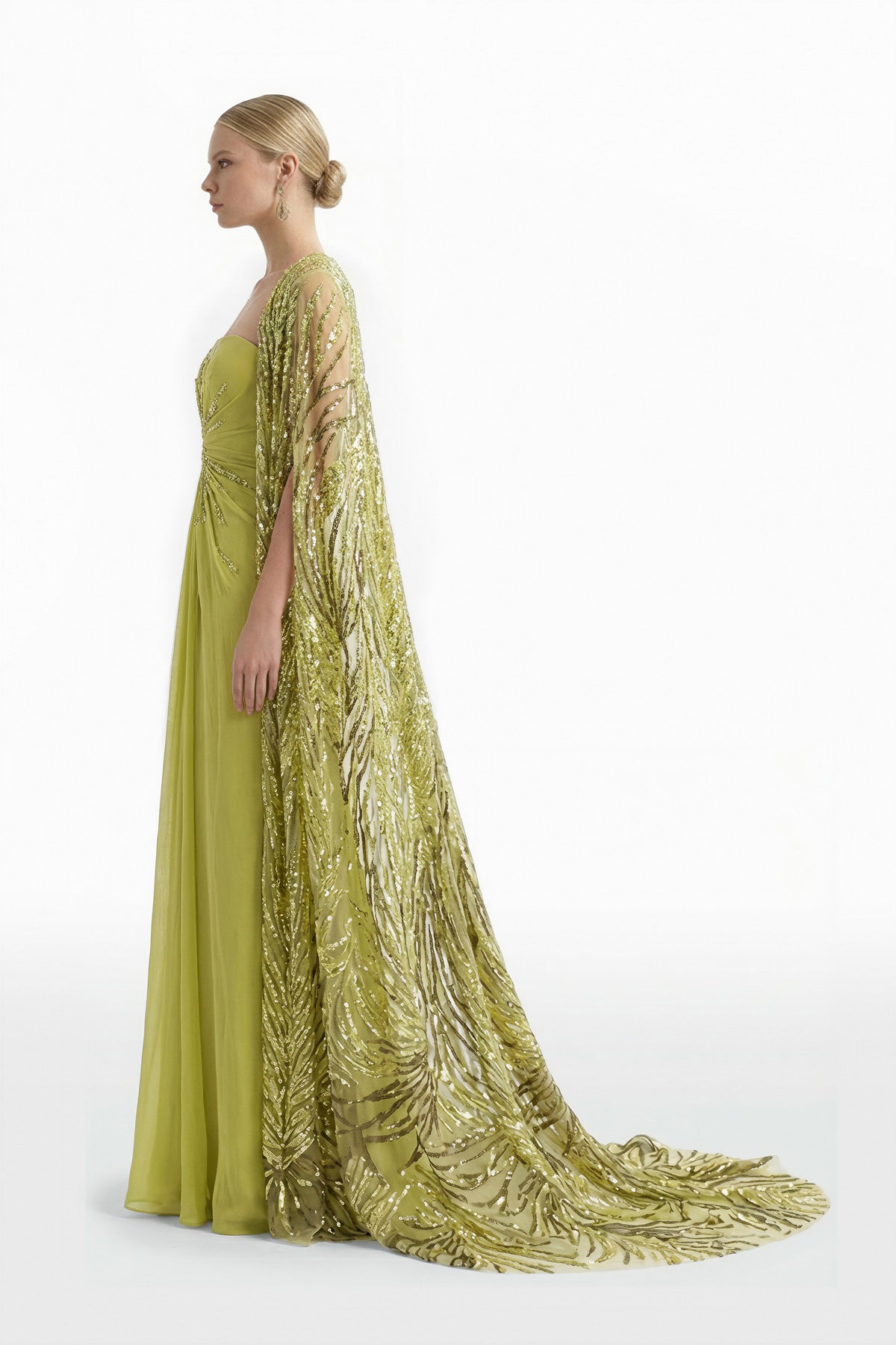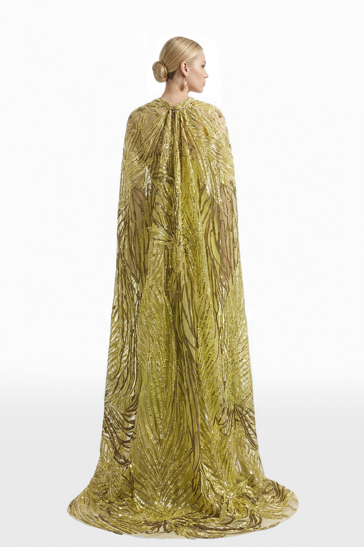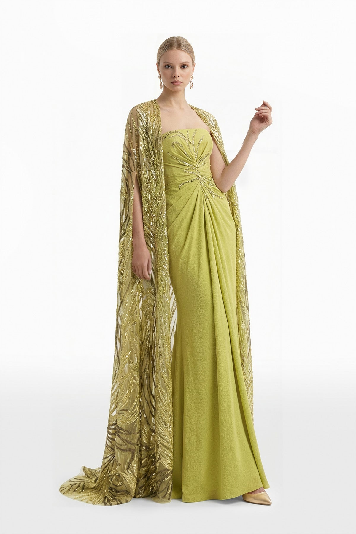 فستان طويل من الكريب باللون الأخضر الزيزفوني، يتميز بتصميم بدون أكمام وقصة مطوية، مزين بالترتر لإضفاء بريق خفيف وأنيق، مع رداء باللون الأخضر الزيزفوني مطرز بالكامل بتطريزات معقدة من الترتر لإضفاء لمسة نهائية أنيقة وغنية بالملمس.