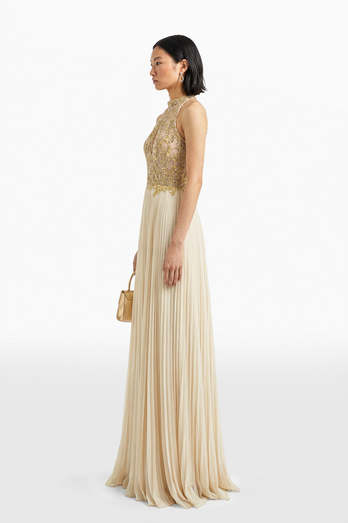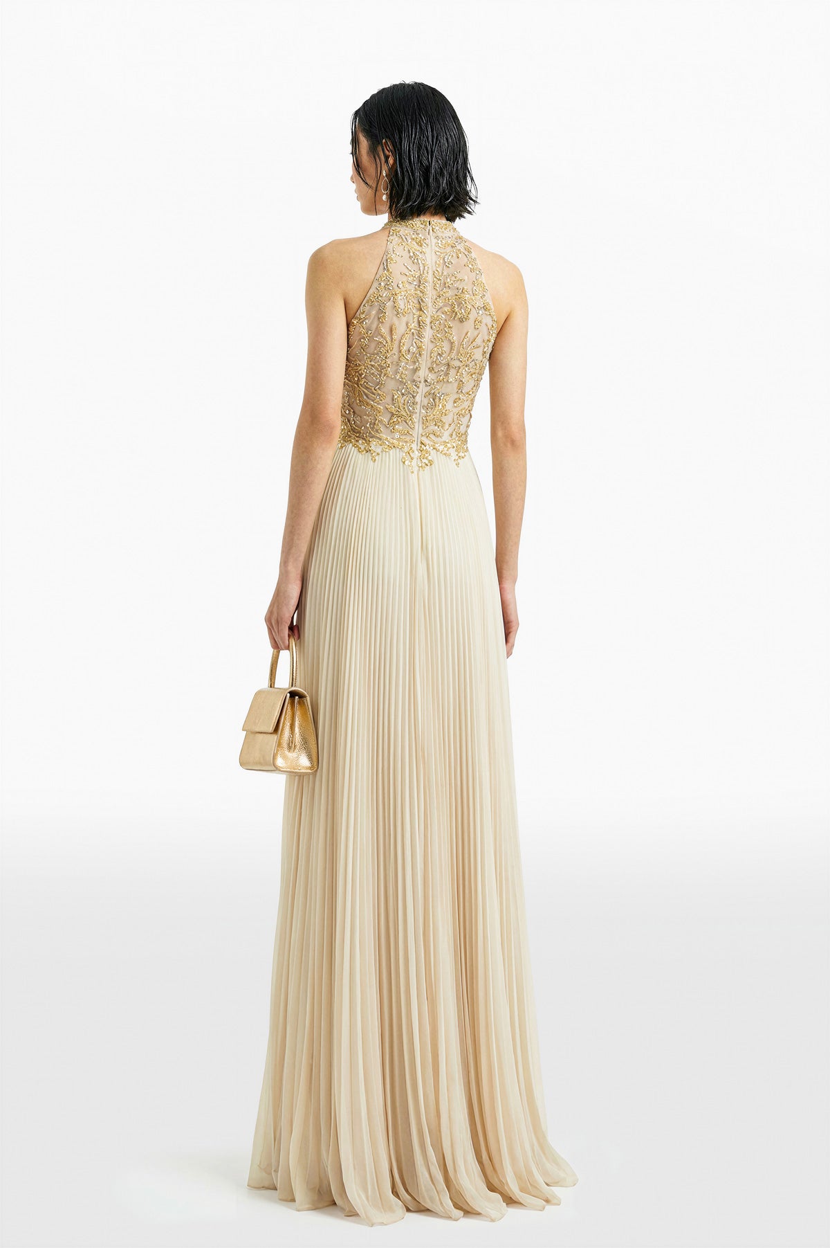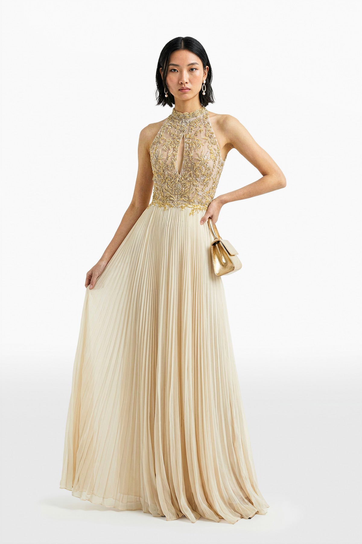 فستان طويل من القماش المبيض يتميز بصدّار مطرّز يدويًا برقبة حبال و تنورة من الكريب جورجيت المطويّة المتدفقة لإطلالة أنيقة و مزخرفة.
