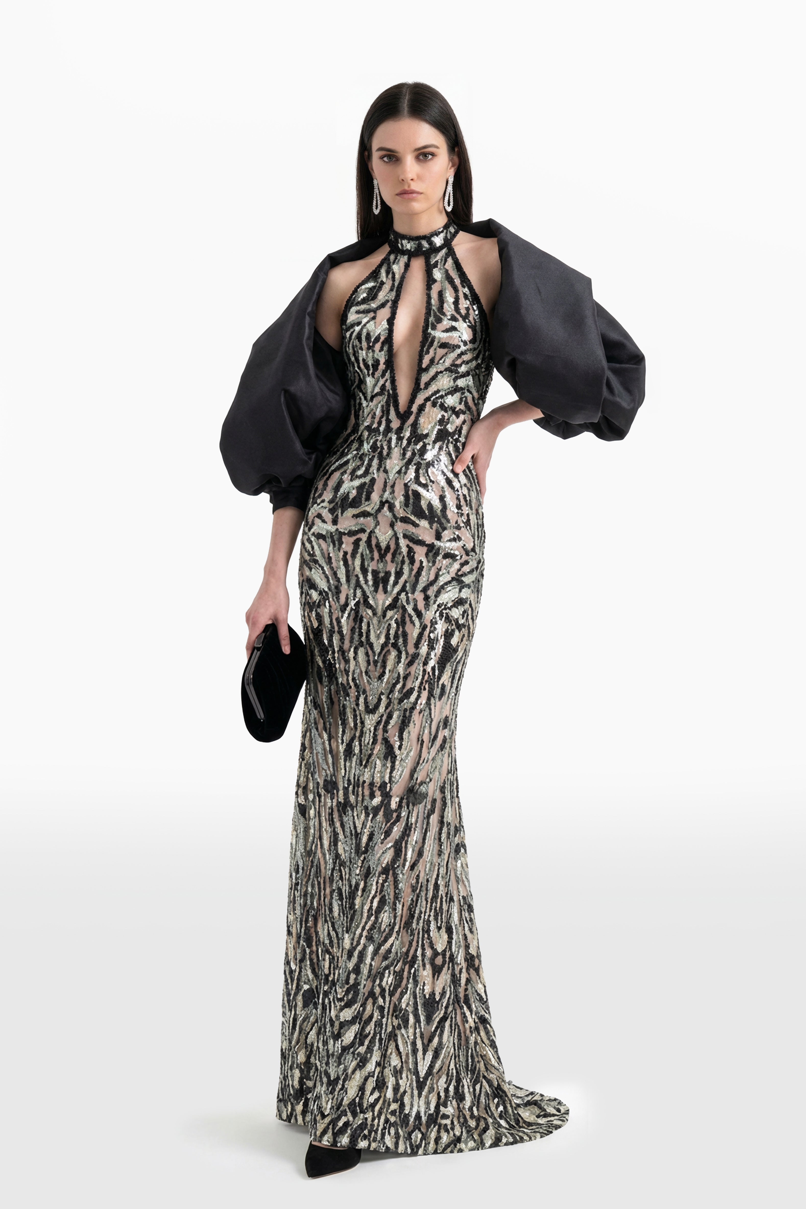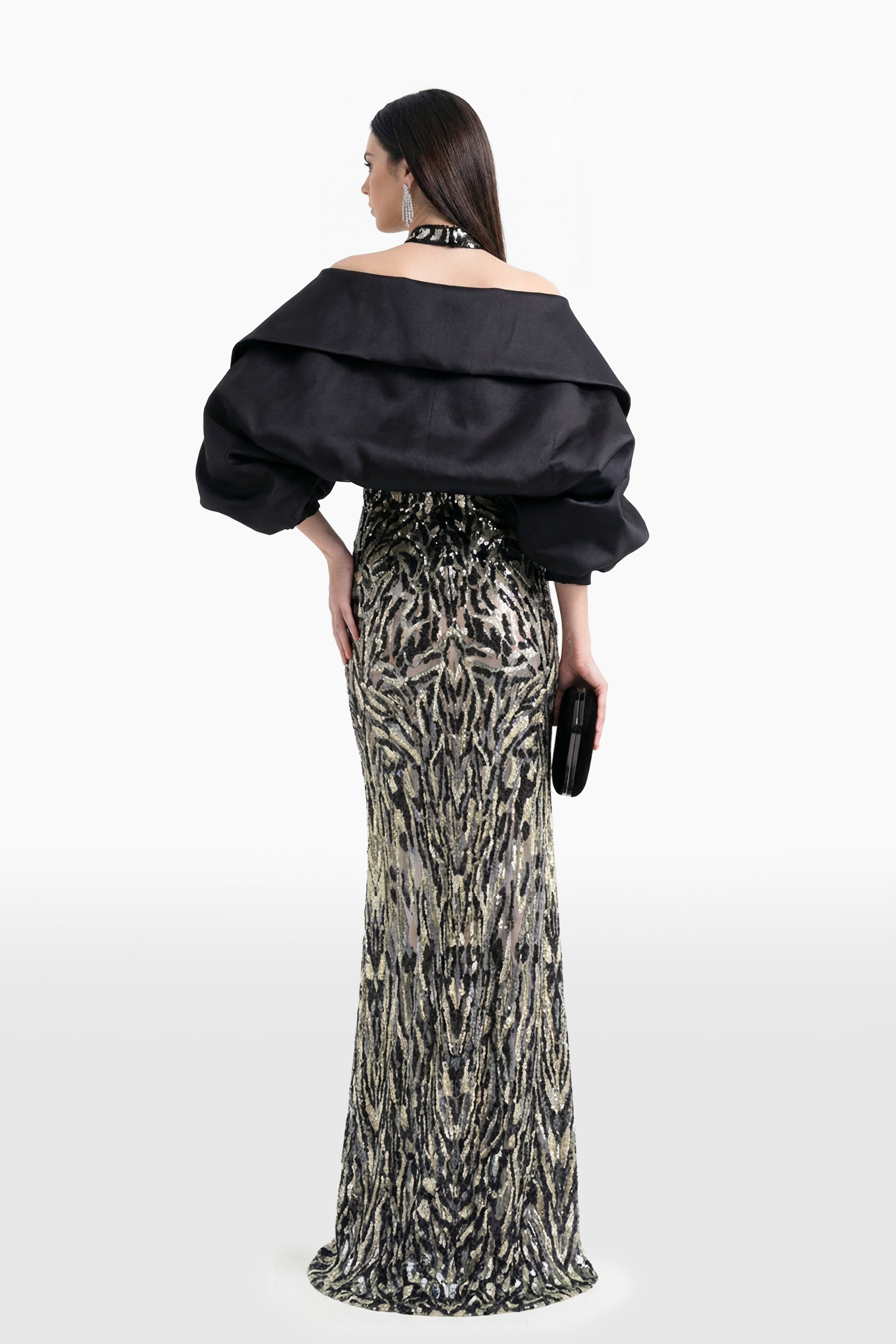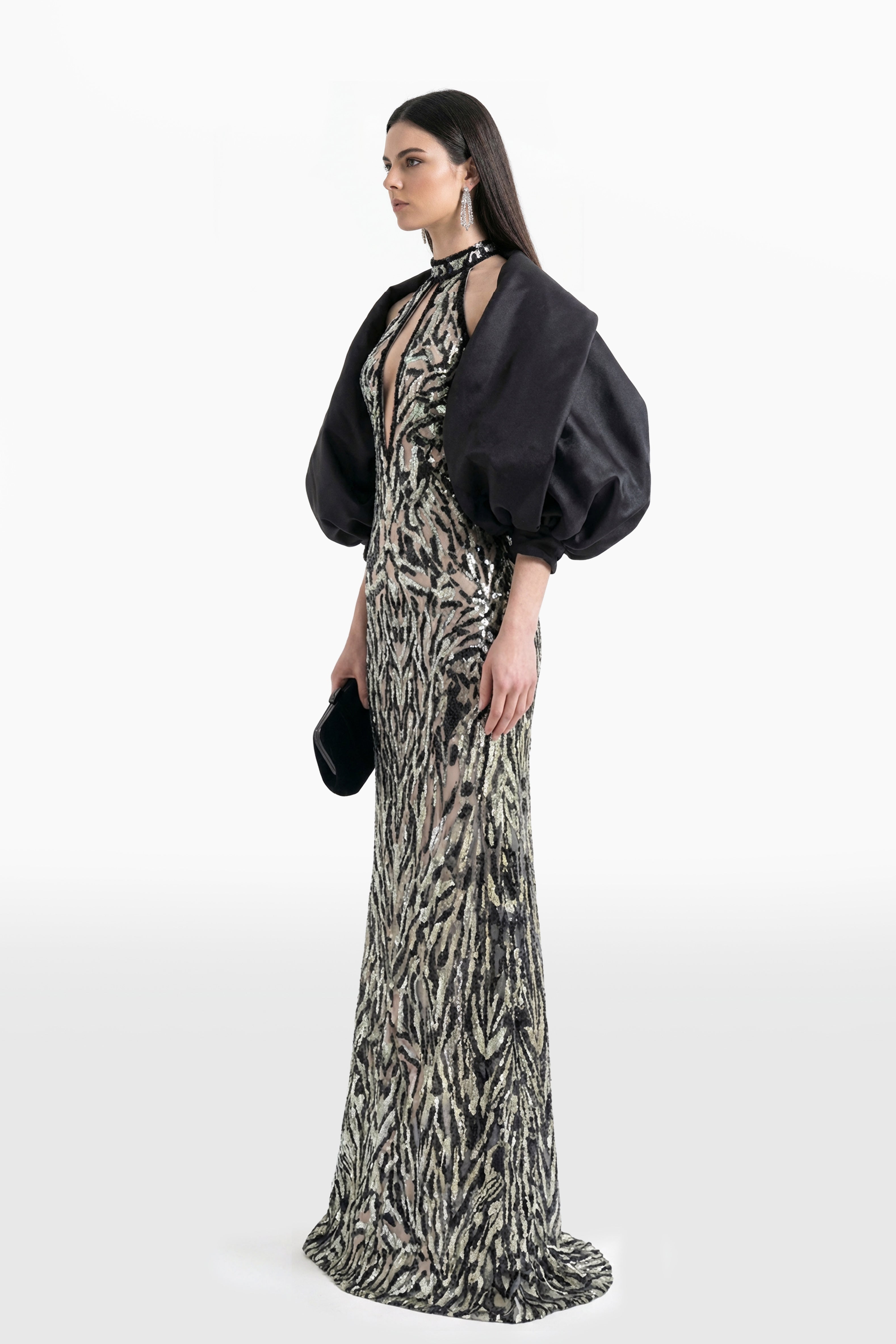 فستان طويل باللون الأخضر الليموني والأسود الفاحم برقبة حبال، مزين بتطريز جريء مستوحى من الزرافة مع بوليرو شانتونغ أسود فاحم، يخلق صورة ظلية ملفتة للنظر.