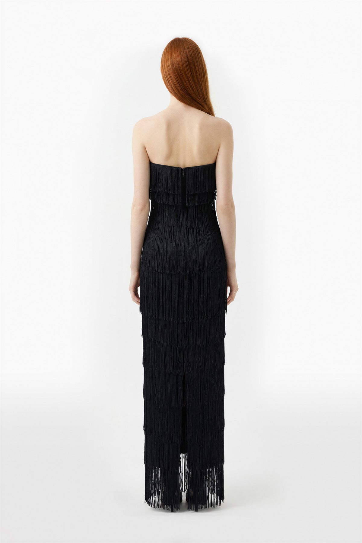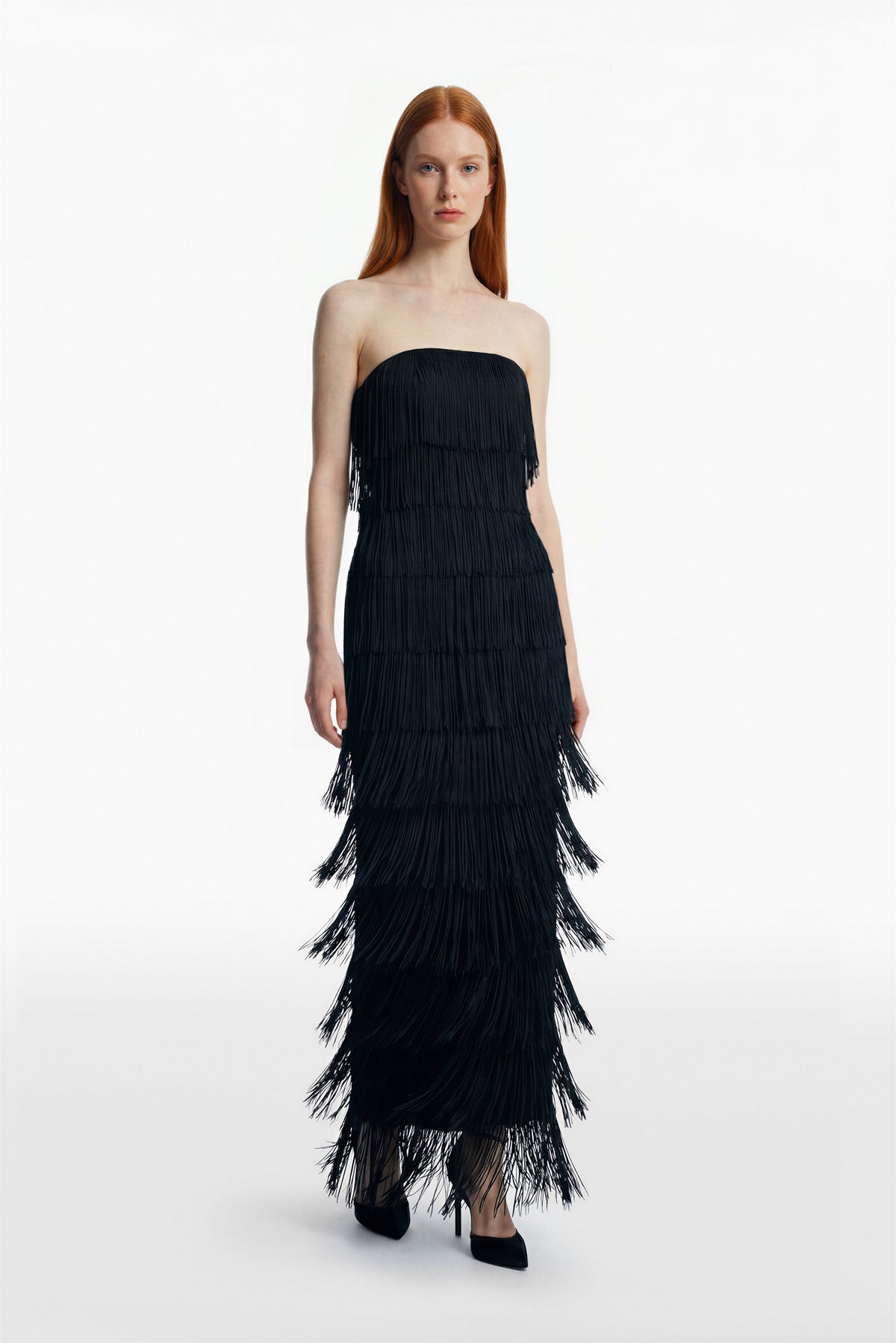 فستان أسود داكن بدون أكمام مع طبقات من الأهداب المتدرجة وقصة ضيقة.