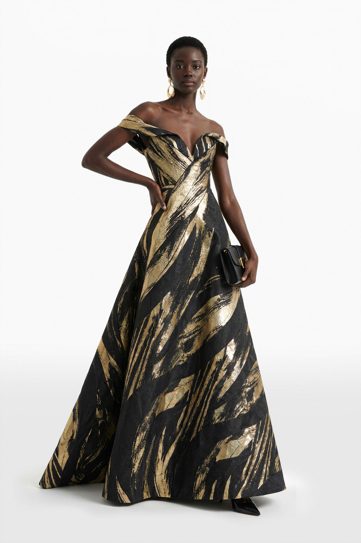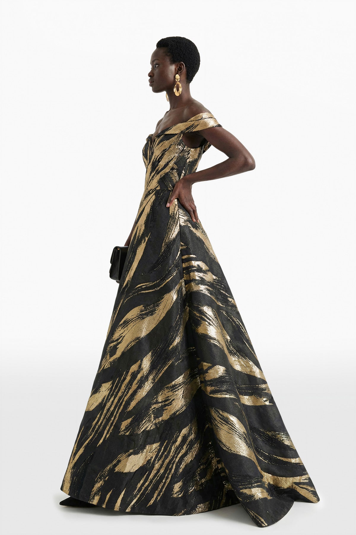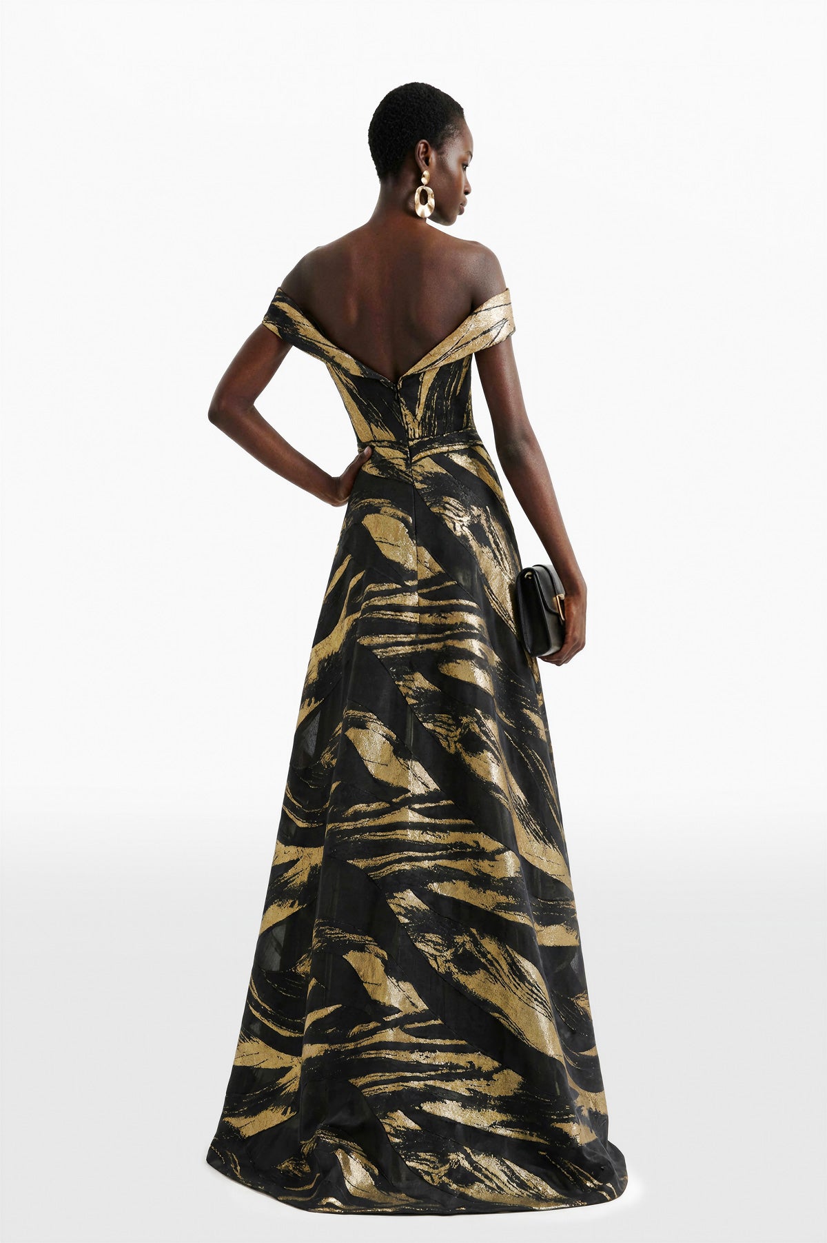 فستان مكشوف الكتفين من البروكار المهيكل، يتميز بزخارف ذهبية معدنية جريئة على قاعدة سوداء داكنة. خط العنق المنحوت على شكل قلب مع تفاصيل الكتف المطوية يحيط بالصدار، ويتميز بخصر ضيق قبل أن ينفتح إلى تنورة واسعة وكاملة.