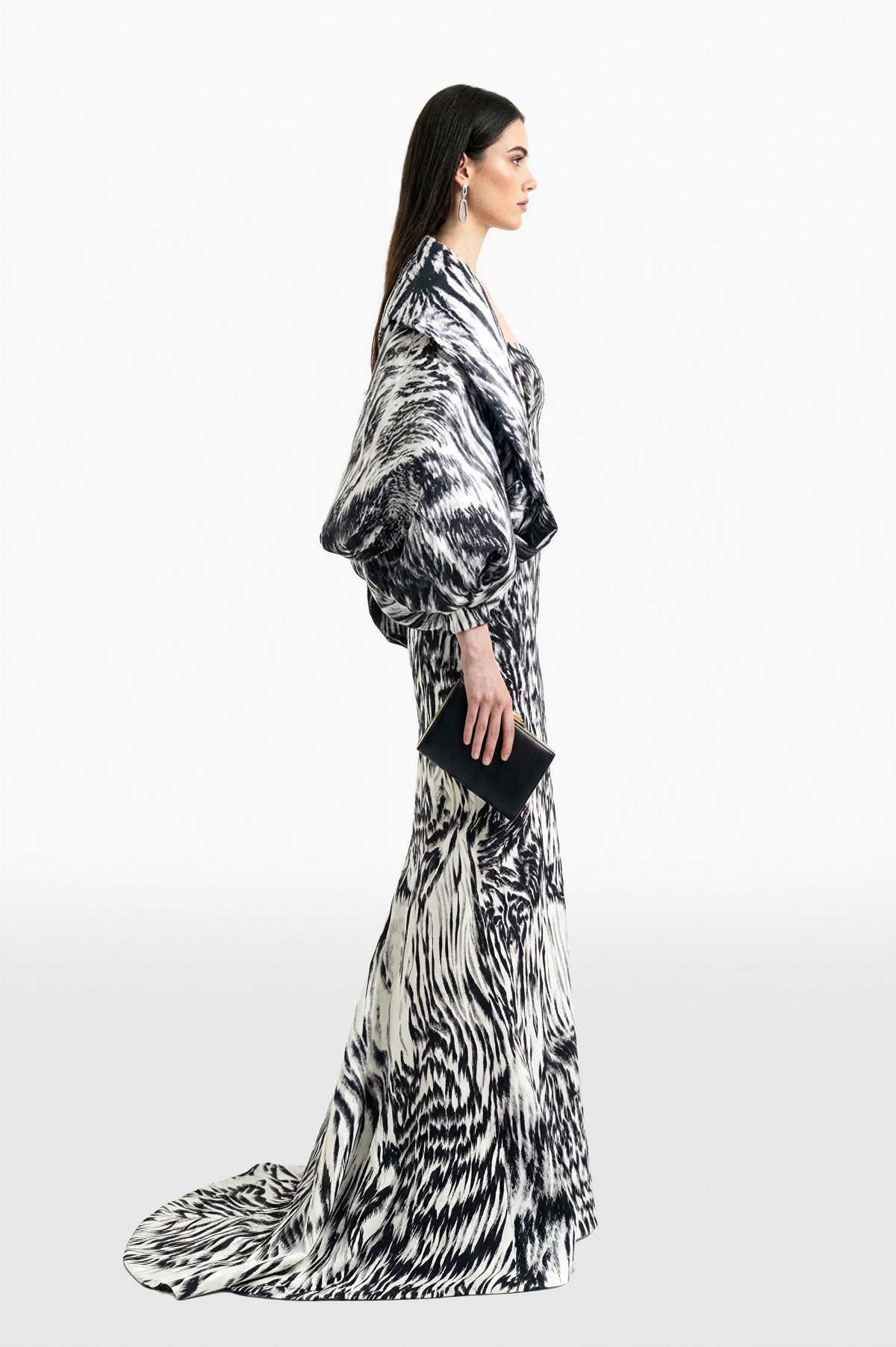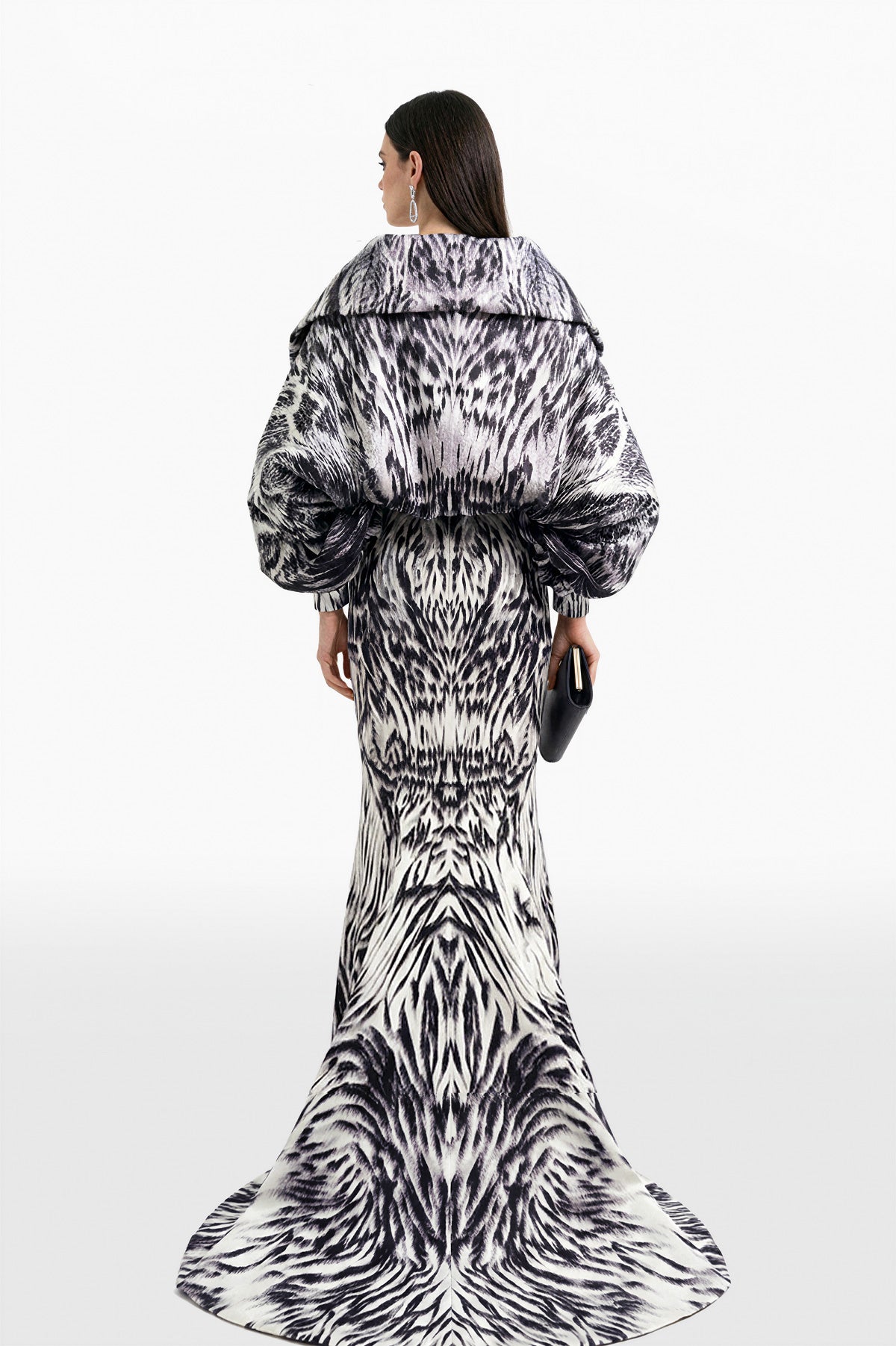 فستان ضيق من الكريب المطبوع باللون الأسود الفاحم والأبيض المائل للرمادي، مع خط رقبة على شكل قلب وخصرة محددة. محدد عند الوركين، ويمتد إلى حافة واسعة مع ذيل خفيف مع بوليرو ميكادو قصير باللون الأسود الفاحم والأبيض المائل للرمادي المطابق. الأكمام الواسعة المجمعة والكتفين المحددة تخلق تباينًا جريئًا وتضيف حجمًا.