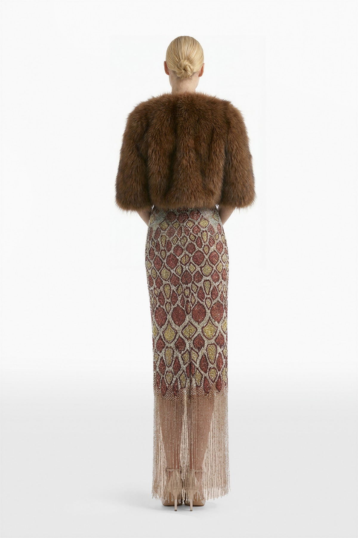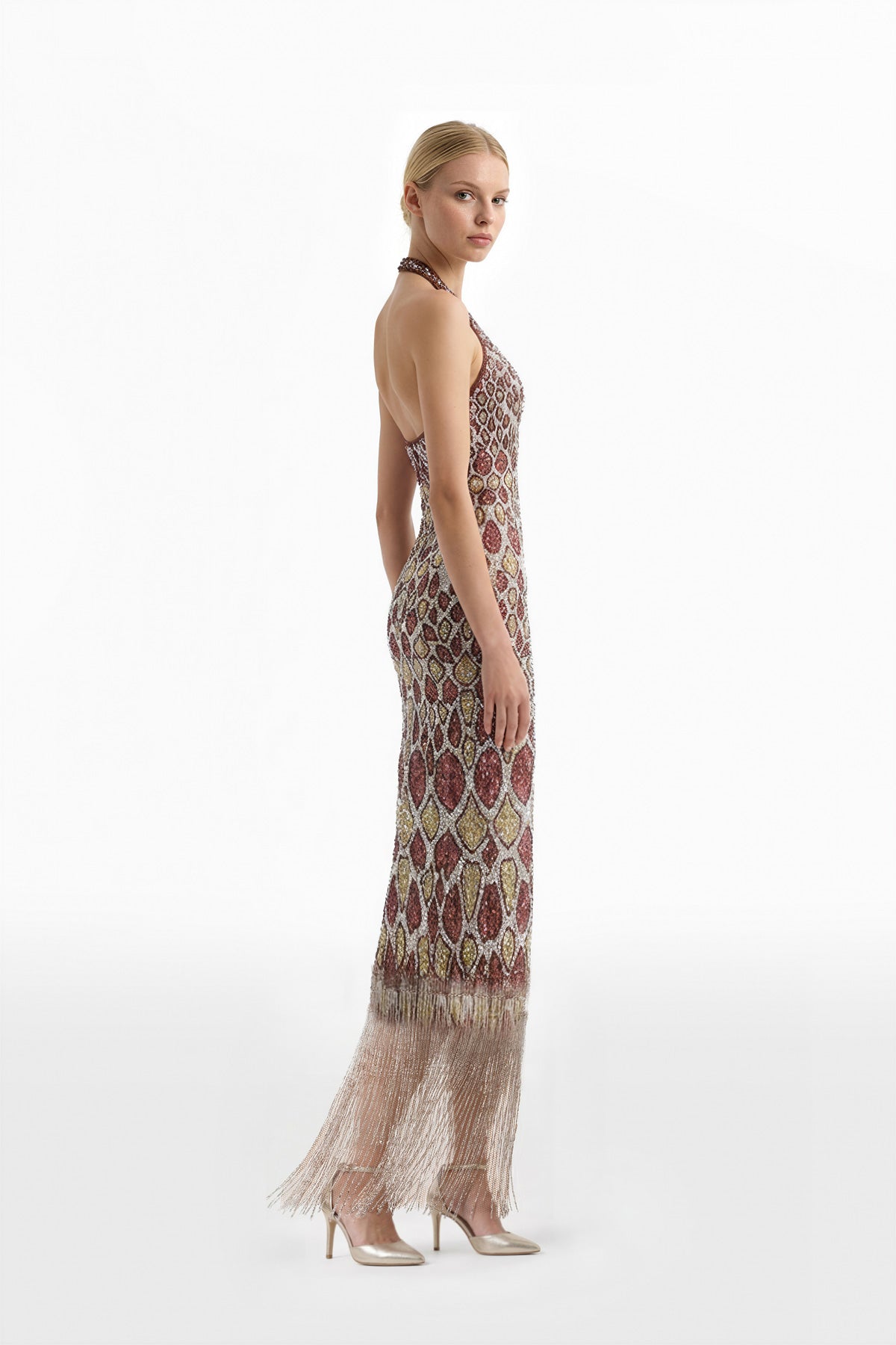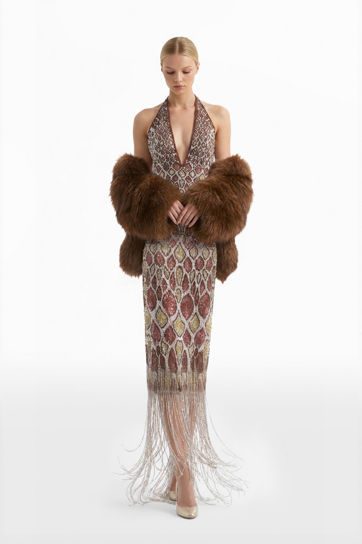 فستان طويل من Sequoia يتميز بتصميم مطرز مستوحى من الثعابين، مع خط رقبة حريري وفتحة على شكل حرف V. مزين بتفاصيل Charleston على الحافة لإضفاء المزيد من الحركة والأناقة.