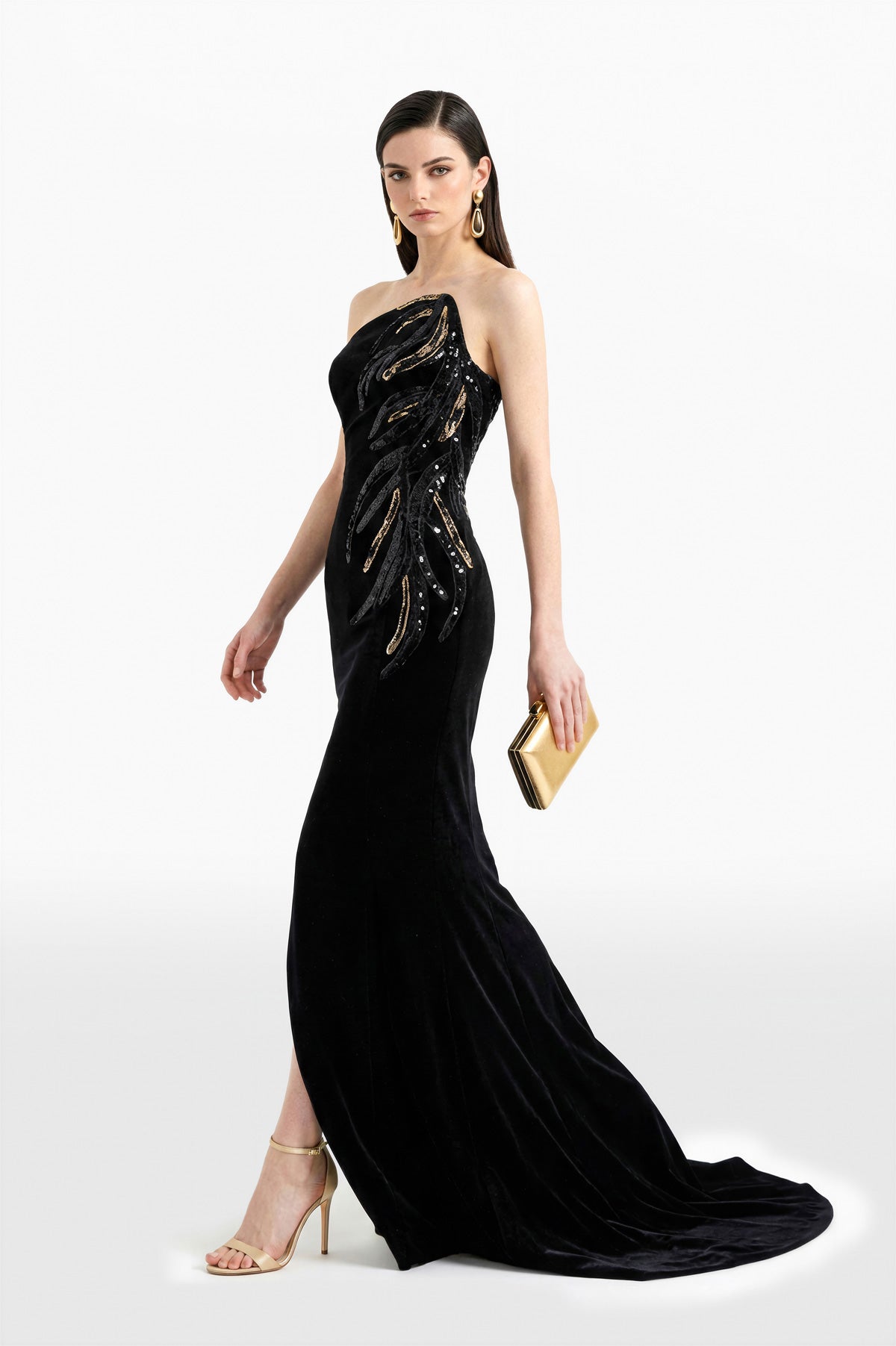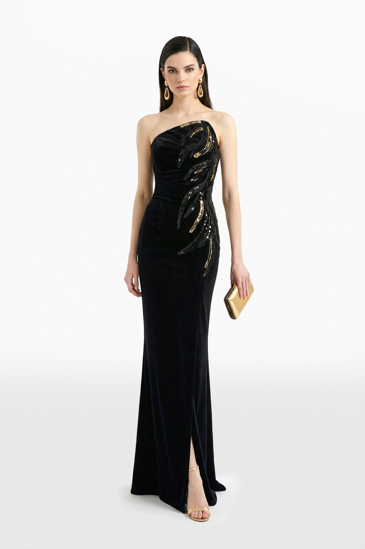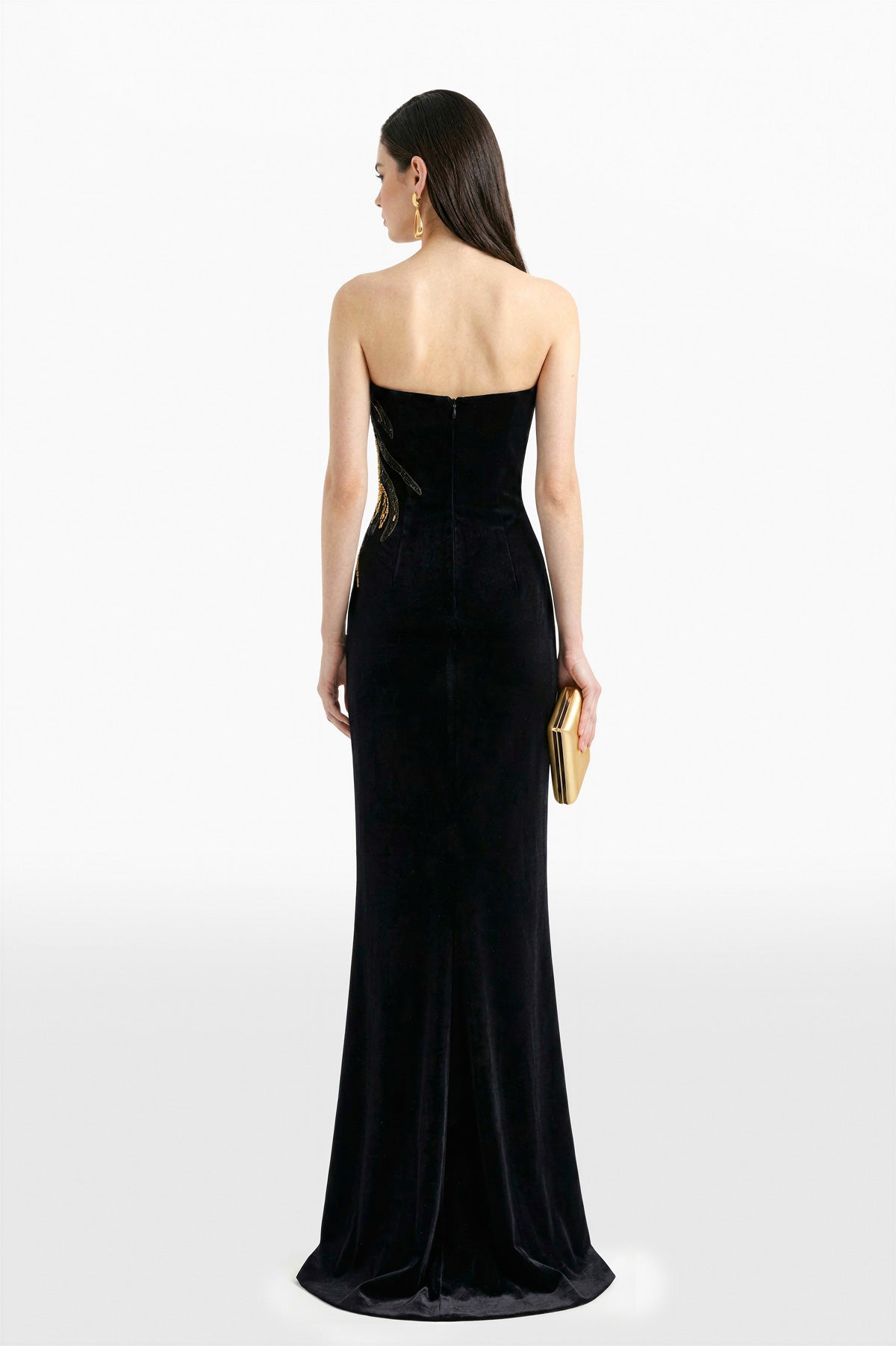فستان طويل بدون أكمام من المخمل الأسود الفاحم بقصّة مستقيمة ضيقة. صدرية منظمة مع دعامة داخلية وخط رقبة مستقيم أنيق. محدد عند الخصر والوركين، ويمتد إلى تنورة مستقيمة مع شق أمامي. زخارف ذهبية ولونية على طول الصدرية والوركين لإضفاء ملمس مميز.