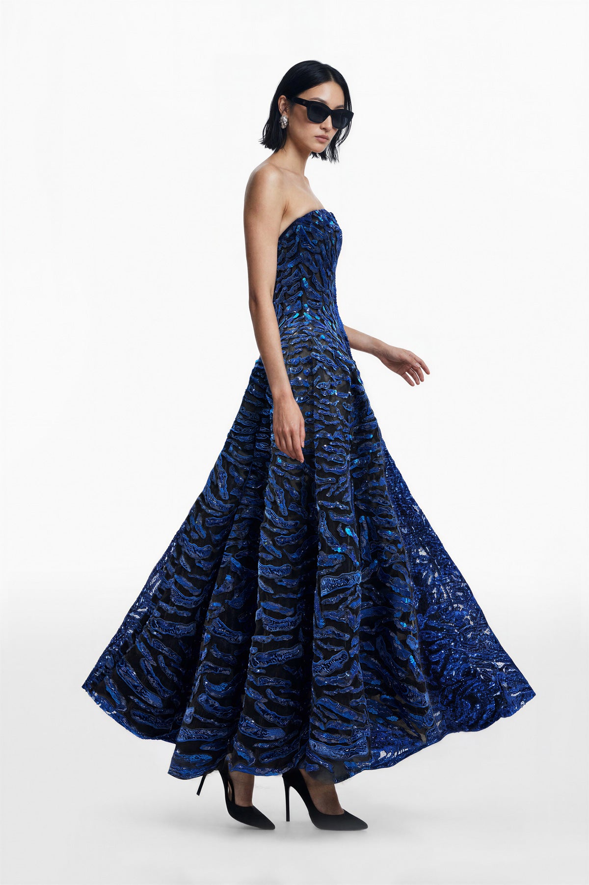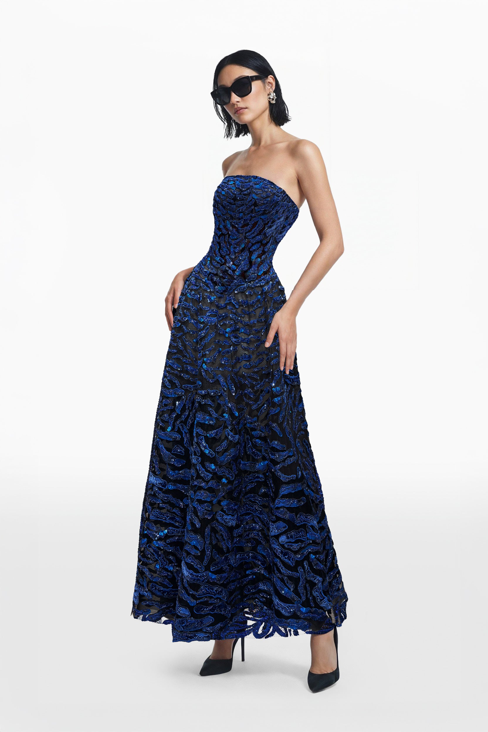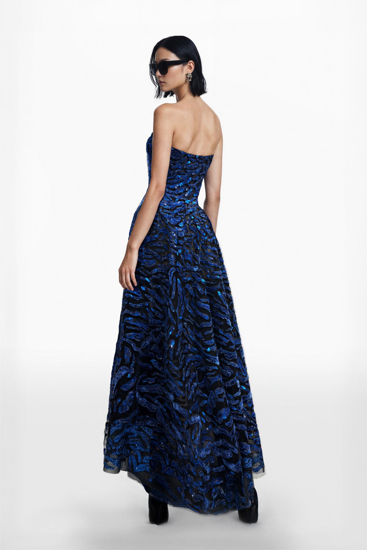 فستان بدون أكمام من التول المطرز بتقنية Surf the Web مع تفاصيل من الترتر بلون متناسق على قاعدة سوداء داكنة. صدرية مهيكلة ومناسبة مع خط رقبة مستقيم وأنيق وخصر محدد. تنورة على شكل حرف A مع عمق شفاف وسطح غني بالملمس في جميع أنحائه.